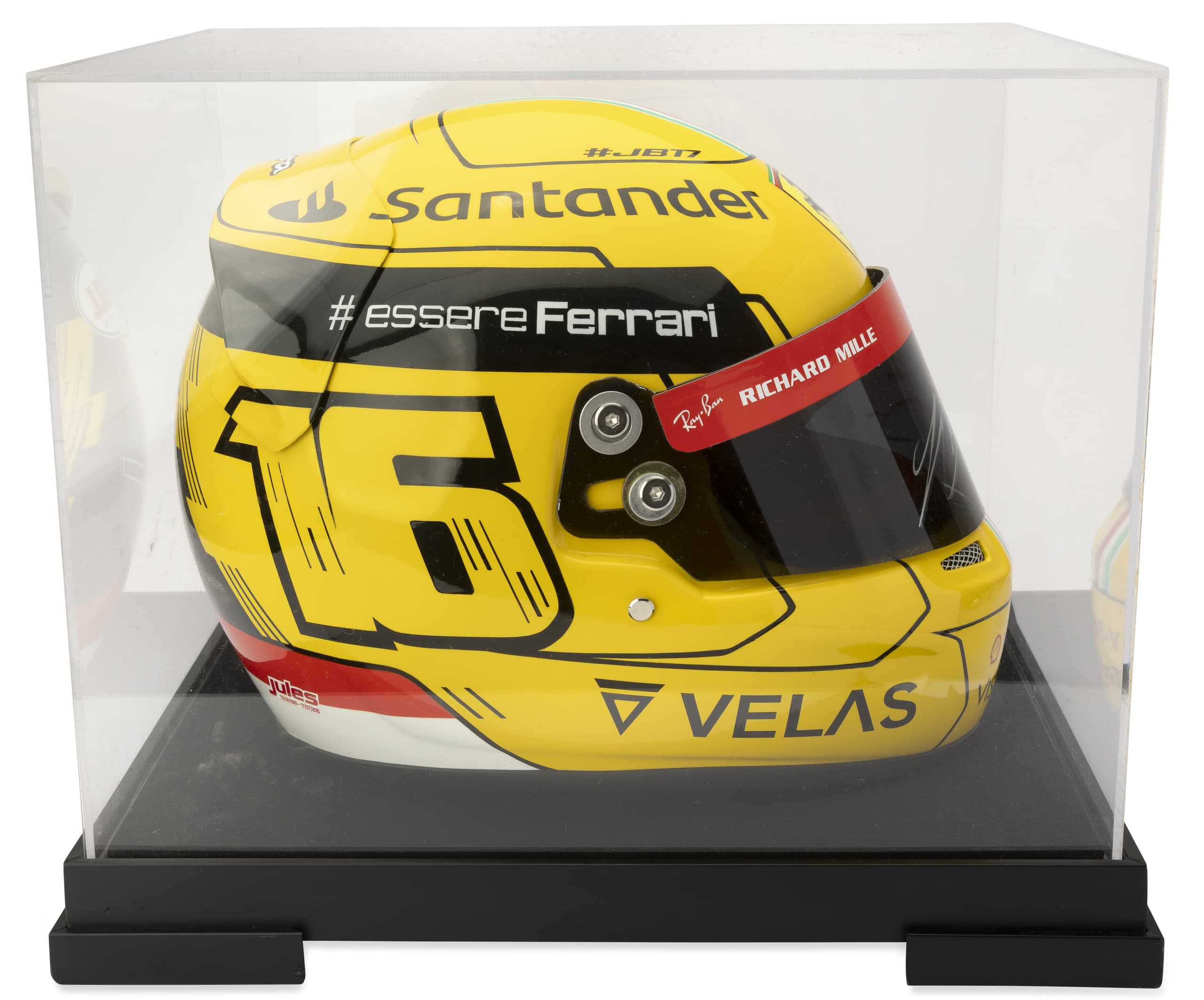 The helmet features the graphic elements of the 2022 design, including sponsor logos (Santander, Velas and Richard Mille), number 16 of Charles Leclerc, slogans '#essereFerrari' and '#JB17', the latter of which is a tribute to Jules Bianchi. This collector’s item faithfully reproduces the design used in the race and is intended for Formula 1 collectors