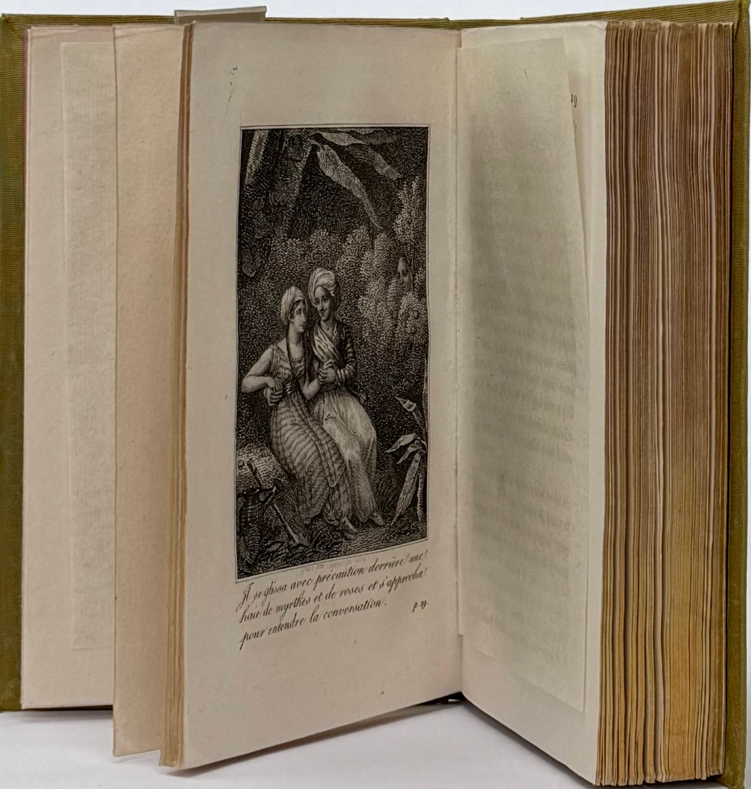 Engraved title page, three engravings illustrating the tales on separate sheets. Moiré binding and period slipcase. Ornate gilt stamping on the covers, spine and edges of the slipcase. Very good condition. Traces of damp on the binding and slipcase.