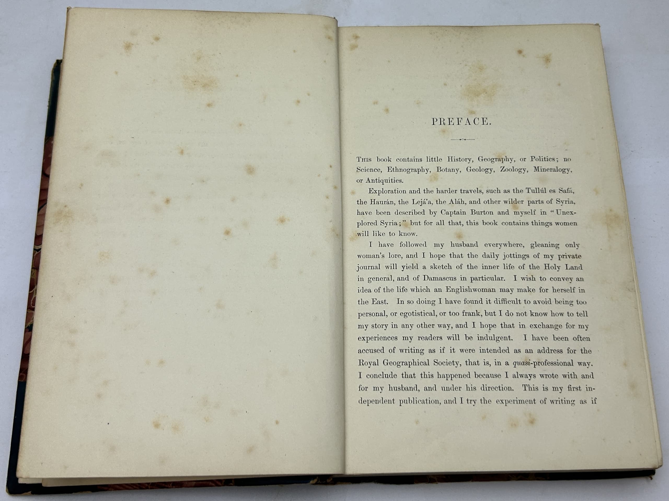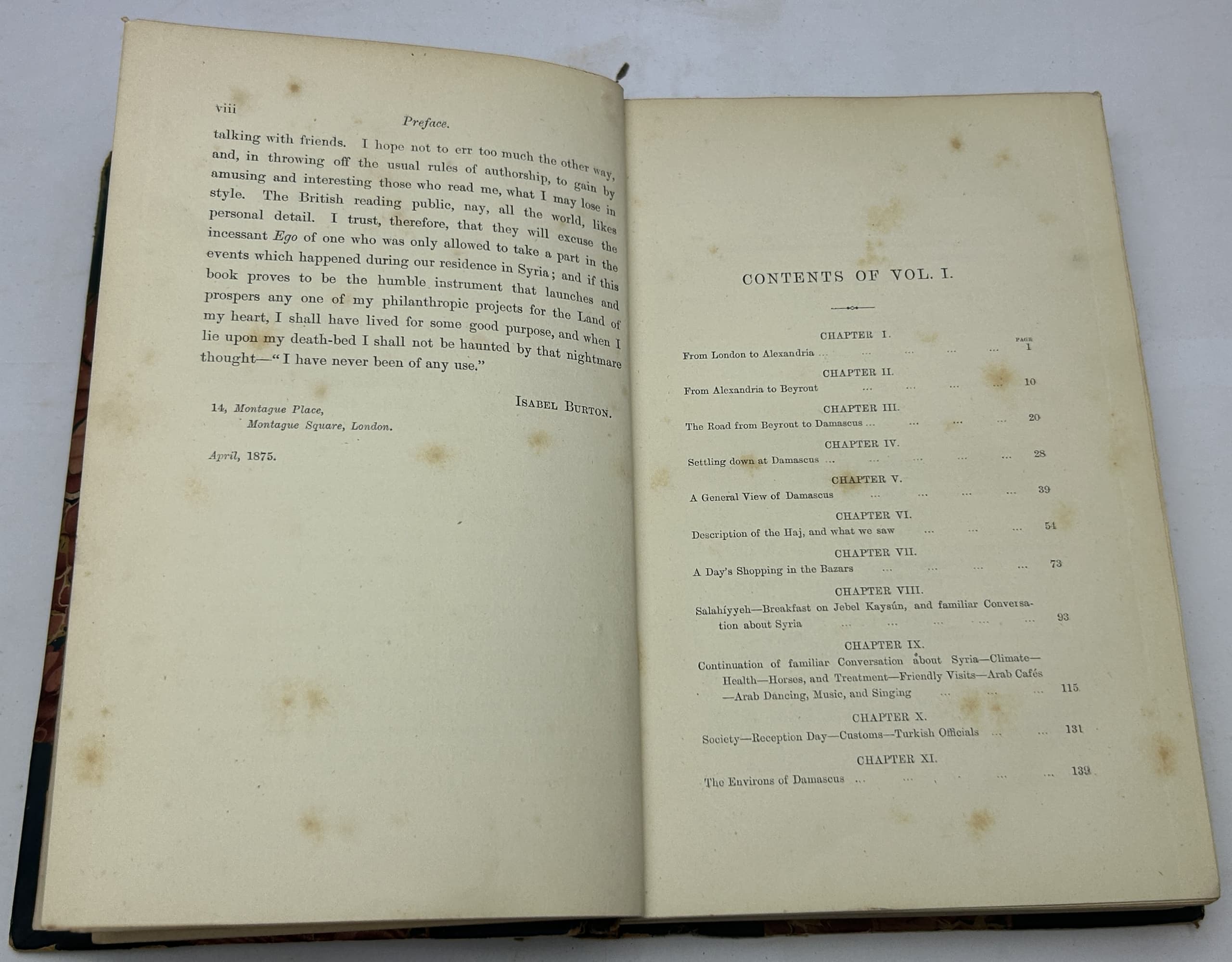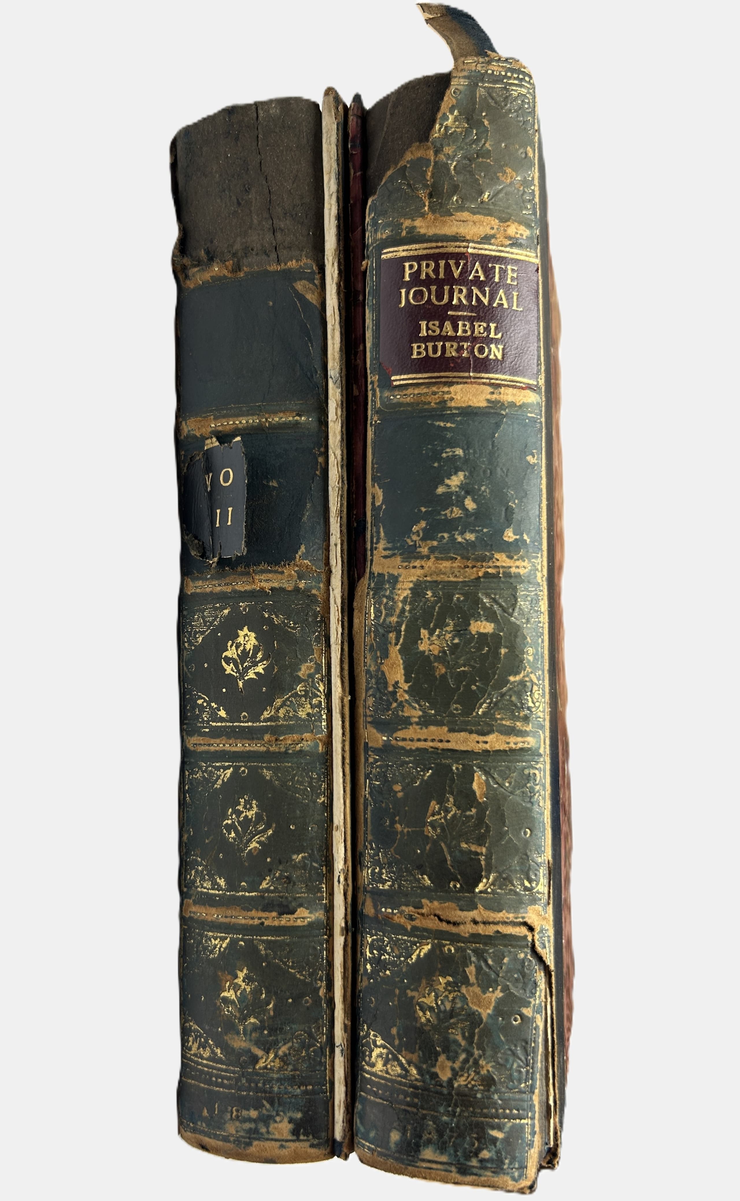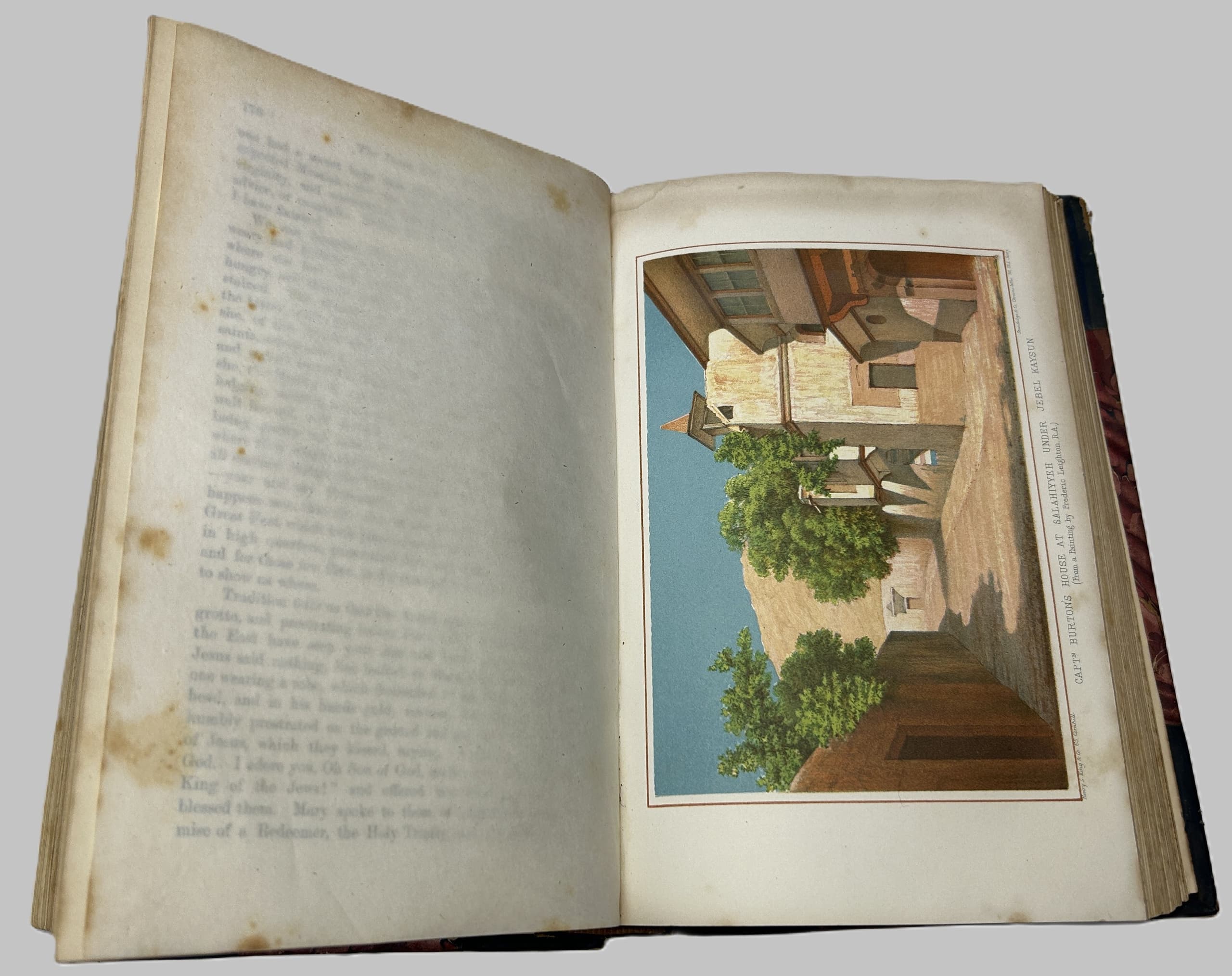 3 vols. 22 x 15 cm. Photographic frontispieces (Isabel in Vol. I and Richard in Vol. II), 2 chromolithographic plates, folding map, x, 376, 340p plus [3] p. publisher’s advertisements. Contemporary half calf, marble boards, leather spine labels. Binging damaged (vol 1) and almost detached, spine damaged (vol 2), foxing.