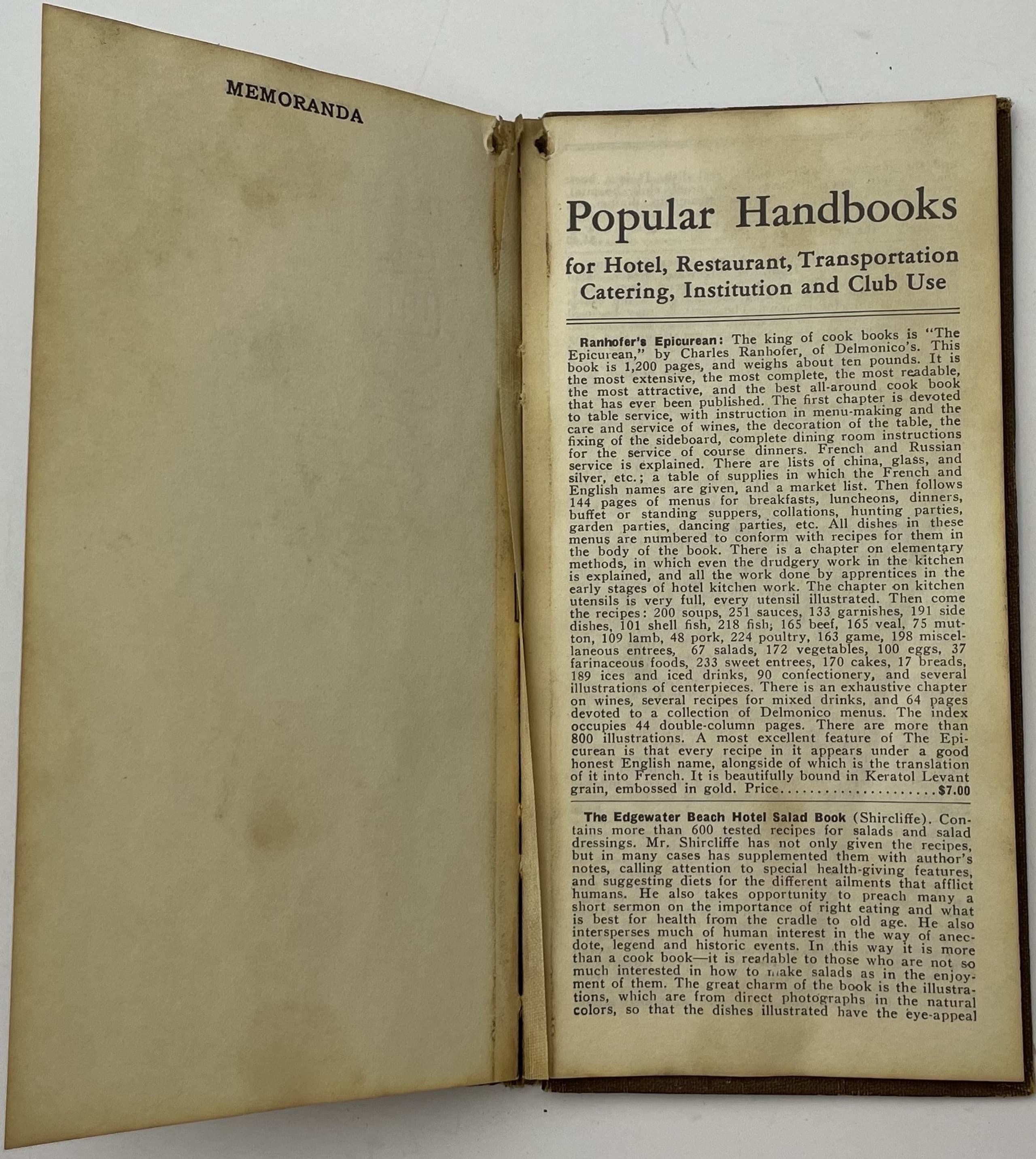 Hardback, 96 pp. of recipes, pp. index, pp. blank (memo), pp. popular handbooks, brown cloth binding, patterned endpapers