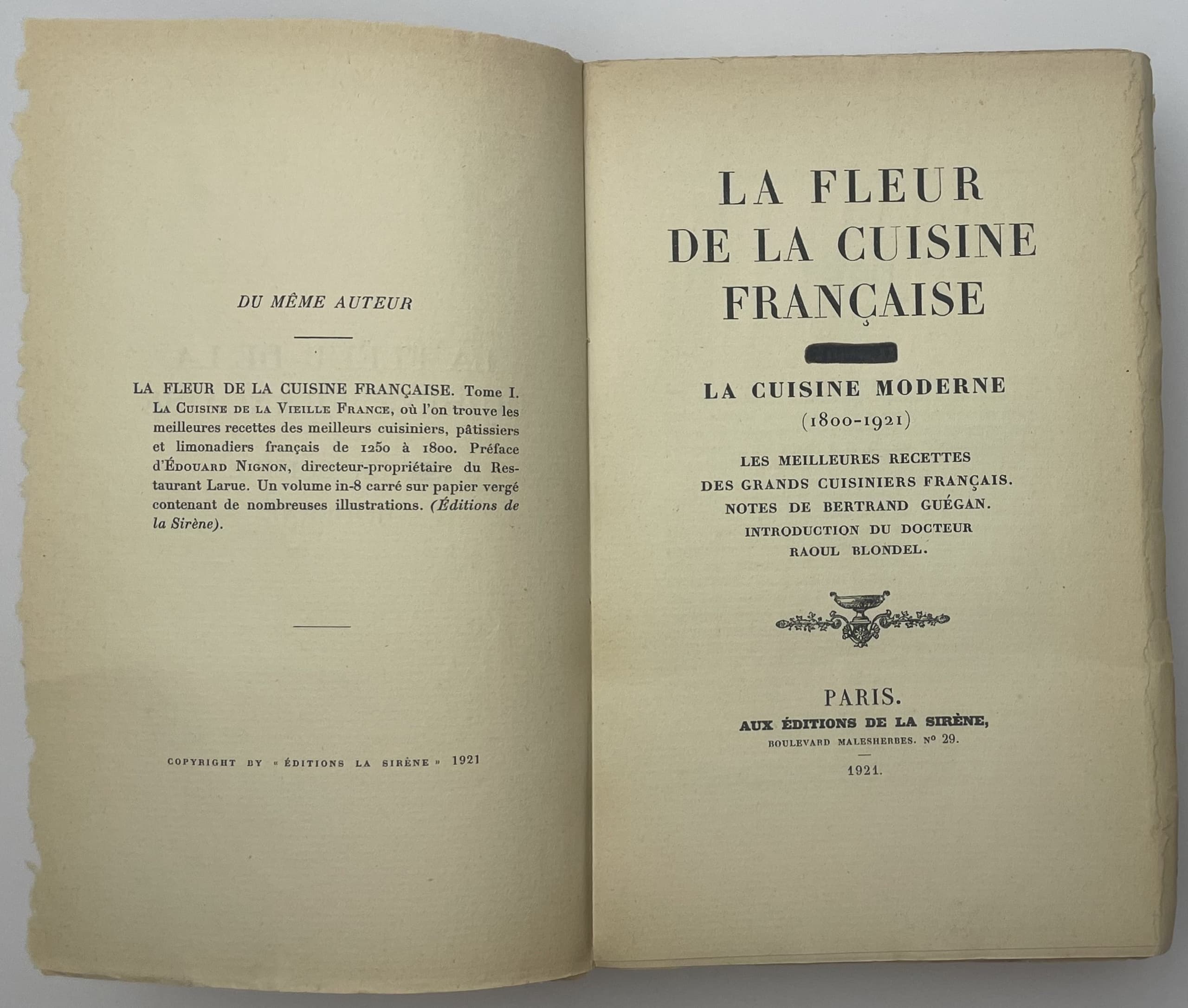 BERTRAND GUÉGAN (1892-1943) LA FLEUR DE LA CUISINE FRANÇAISE. LA CUISINE MODERNE (1800-1921) LES MEILLEURES RECETTES DES GRANDS CUISINIERS FRANÇAIS. |THE FINEST OF FRENCH CUISINE. MODERN CUISINE (1800-1921) THE BEST RECIPES FROM THE GREATEST FRENCH CHEFS] TOME 2. 1921. 1 VOLUME. IN FRENCH.