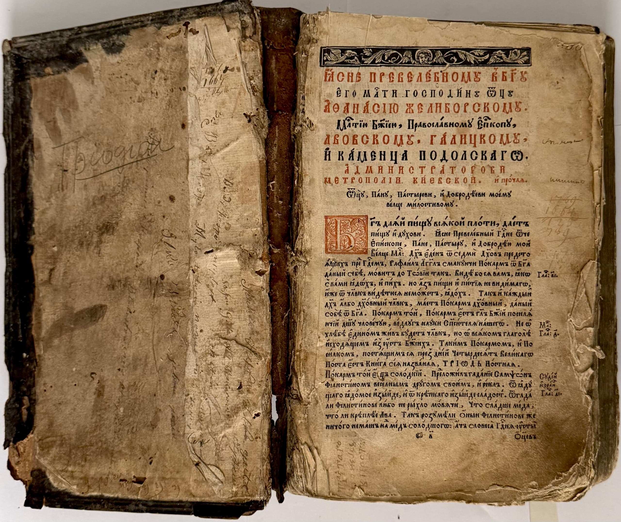 MIKHAIL SLEZKA (Mykhailo Slozka) (?–1667) Triodion si est: Tripesnets, s[vya]toy velikoy chetyredesyatnitsi. V Lvove: v drukarni Mikhaila Sliozki, izhdiveniem episkopa Afanasiya Zheliborskogo, [The Tri-odion, that is: The Book of Three Songs, for the Great Lent]. In Lviv: at the printing house of Mikhail Slezka, sponsored by Bishop Afanasy Zheliborsky, 1664.