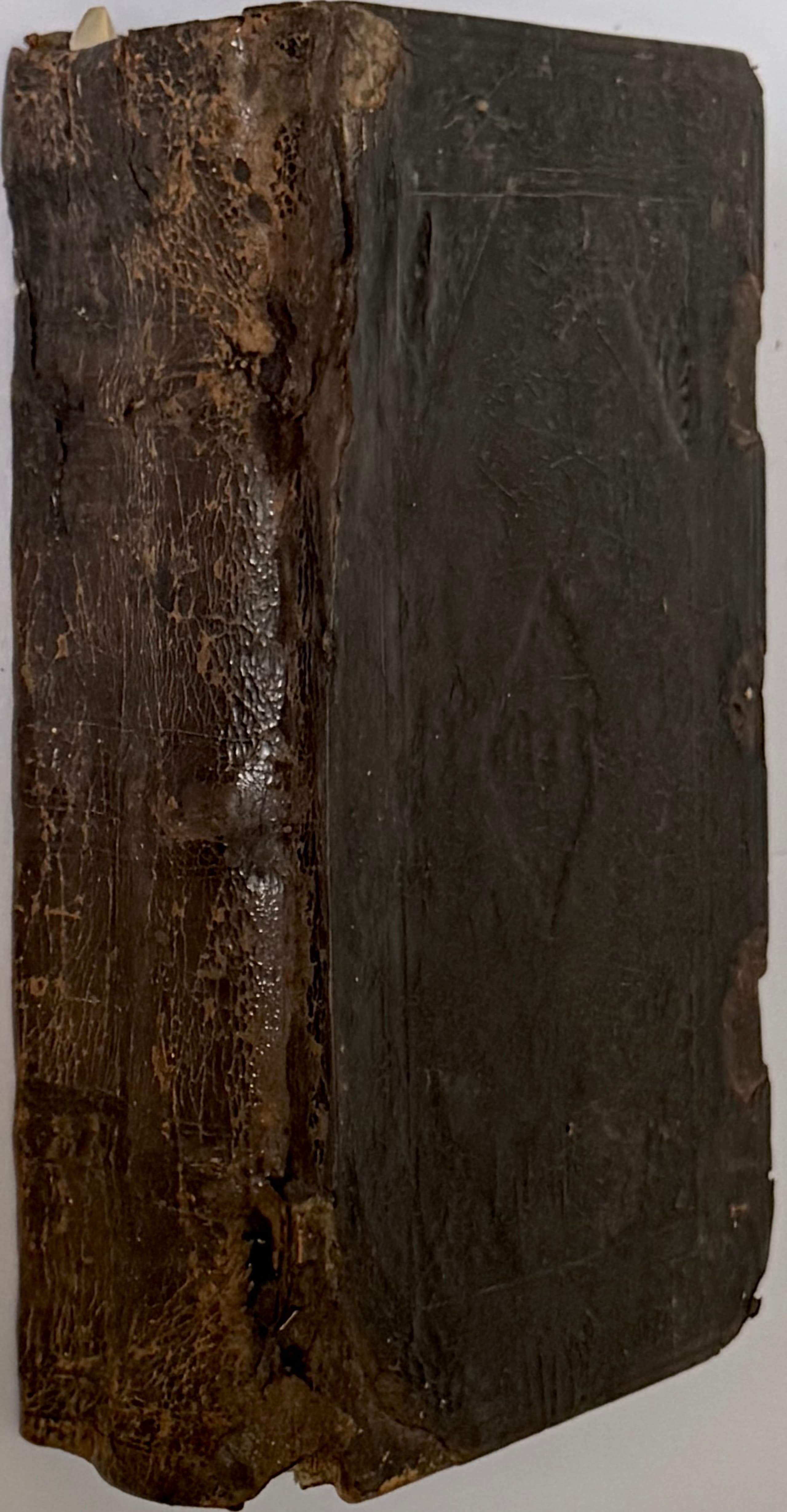 In good condition. Fragments of the leather binding re-stored, tears of leaves reinforced, rare losses repaired, soiling, water stains, rare losses of leaf fragments with minor damage to the text have been pasted over with paper (all restoration work dates from the 18th–19th centuries), and traces of wax. The first title page bearing the coat of arms of the Zheliborski family on the reverse is missing.