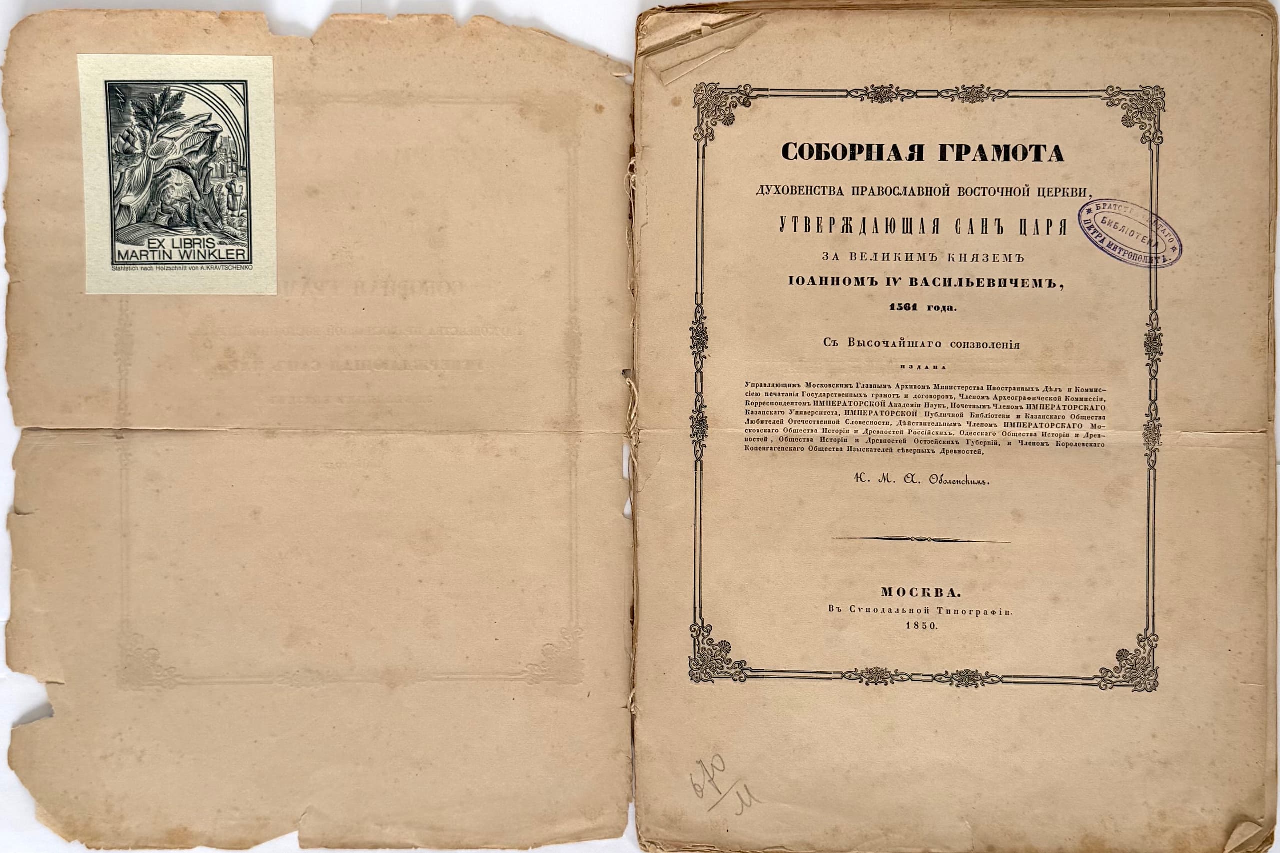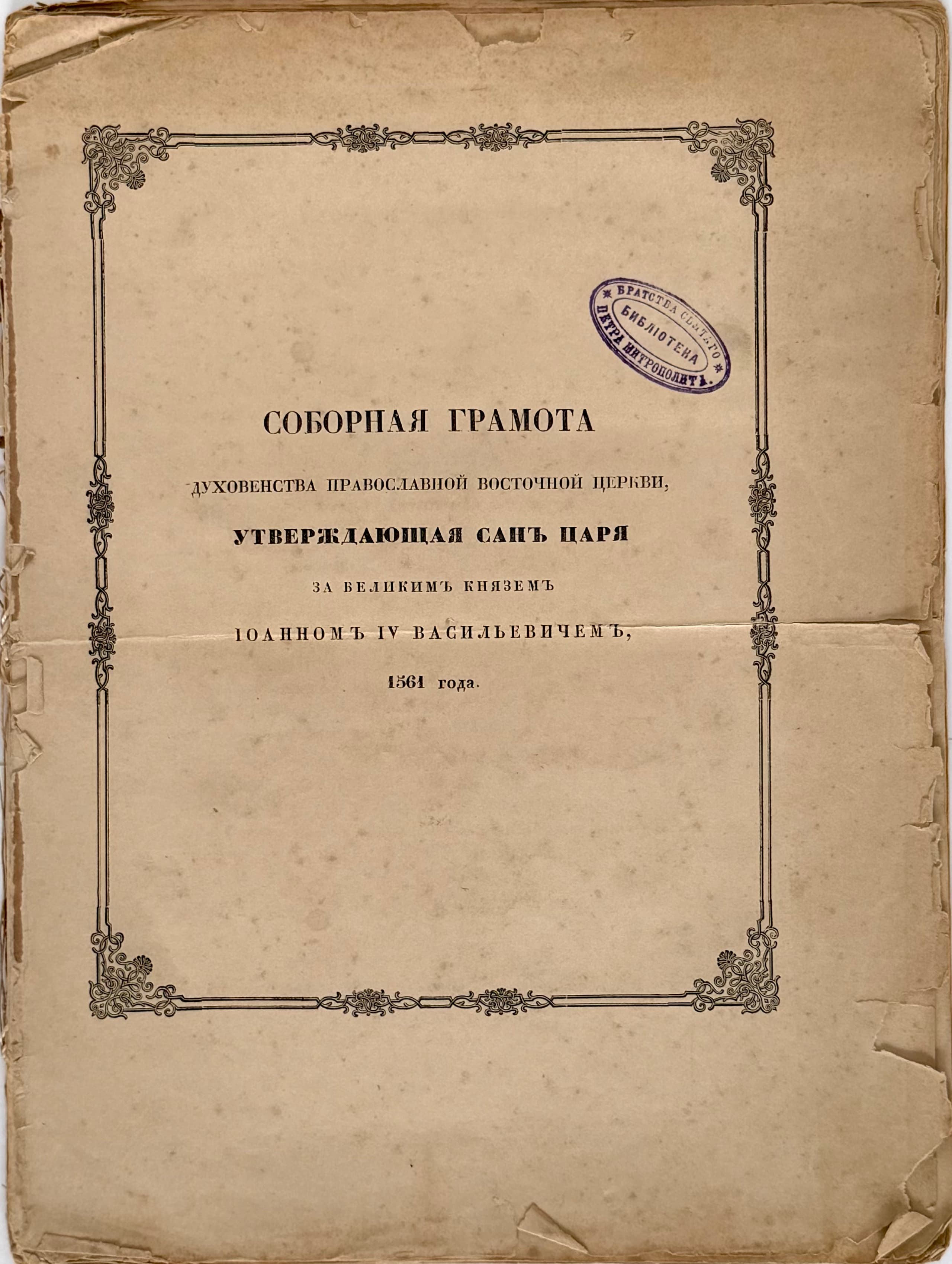 OBOLENSKY, M.A., ed. SOBORNAYA GRAMOTA dukhoventva pravoslavnoy vostochnoy tserkvi, utverzhdayushchaya san tsarya za velikim knyazem Ioannom IV Vasil'evichem 1561 goda [Collective decree of the clergy of the Orthodox Eastern Church confirming the royal title of Tsar for Grand Prince Ivan IV Vasilyevich, 1561]. Moscow: Synodal Press, 1850.