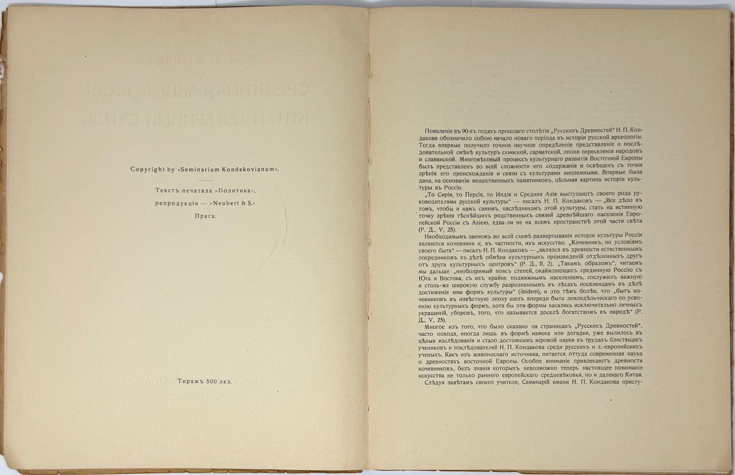 Limited to 500 copies. With a preface by A. Kalitinsky, director of the Kondakov Seminar in Prague. Text in Russian and French.