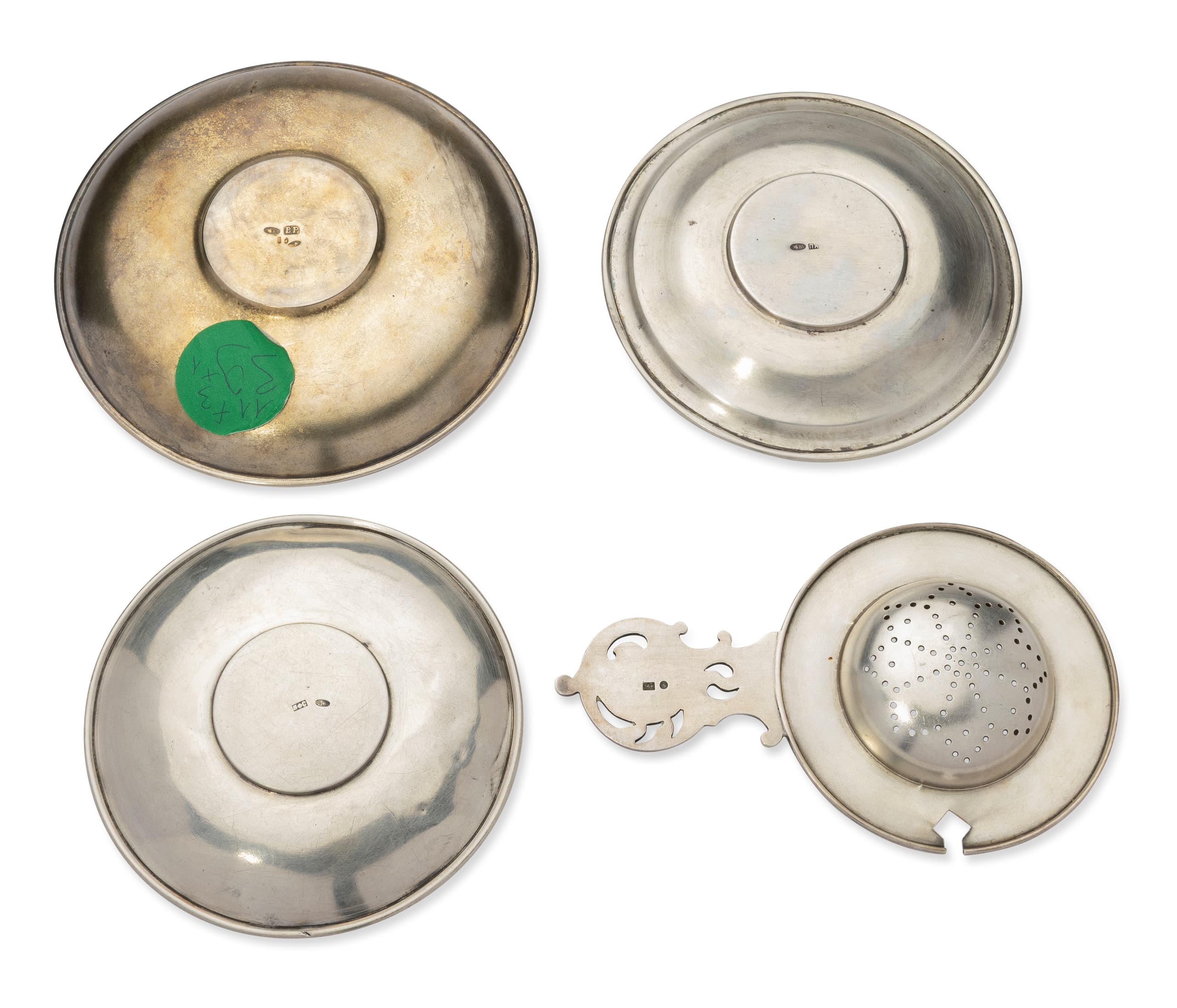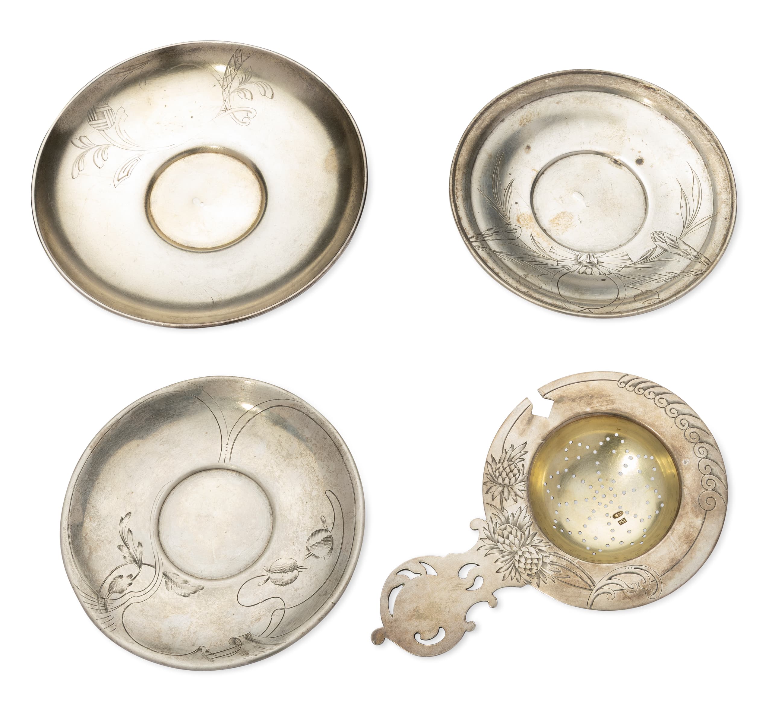 RUSSIAN SILVER THREE SAUCERS AND TEA STRAINER