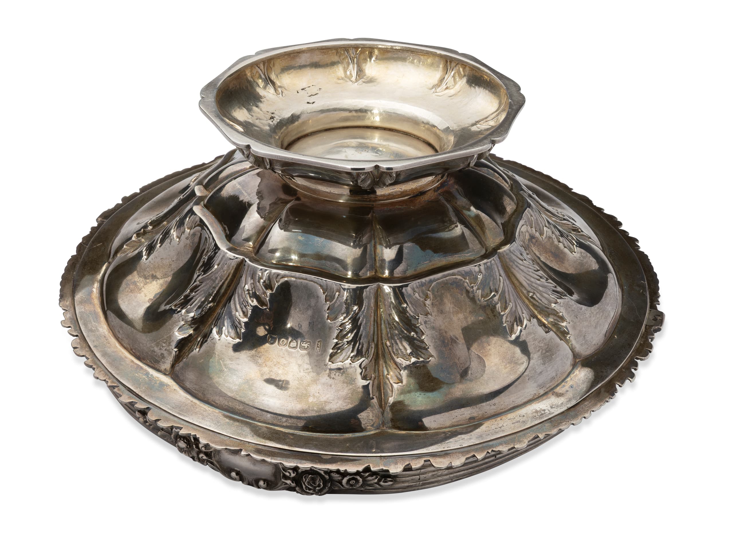 Hallmarks: London’s assay office mark ‘leopard’s head uncrowned’ (from 1821), standard silver mark ‘lion passant facing left’, duty mark ‘King’s Head’, London date letter ‘O’ for 1829, master’s mark ‘WM’ (?) H. 9 cm, diameter 26.4 cm gross weight: 728 gr. Provenance: Private collection of Elizabeth Obolenskaya-Demidova