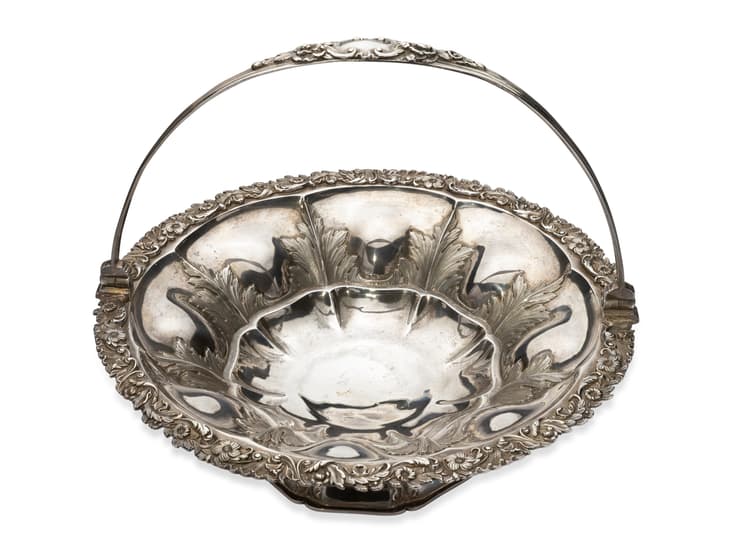 ENGLISH SILVER FRUIT BOWL WITH HANDLE AND FLORAL ORNAMENTS England, London, circa 1829