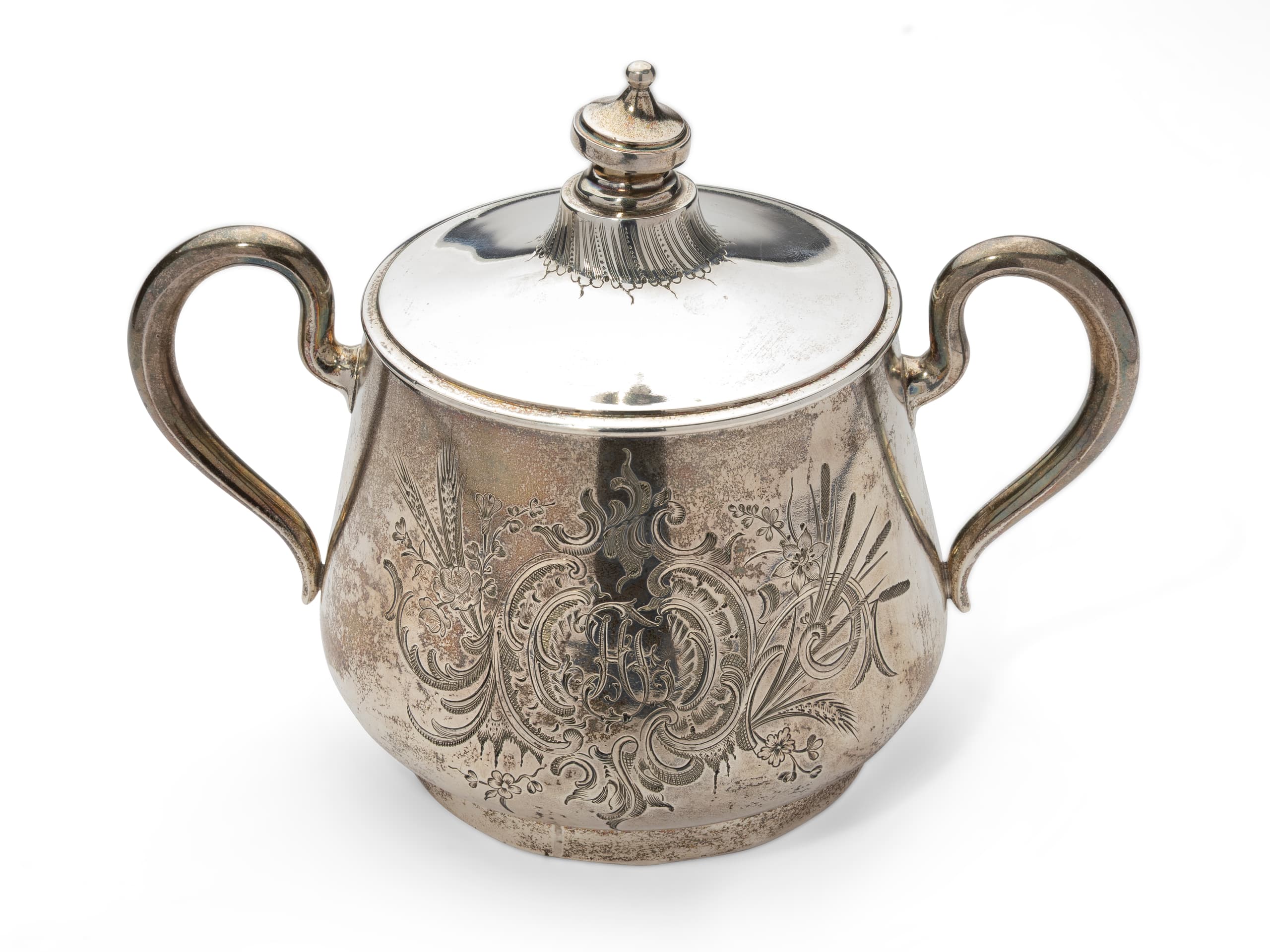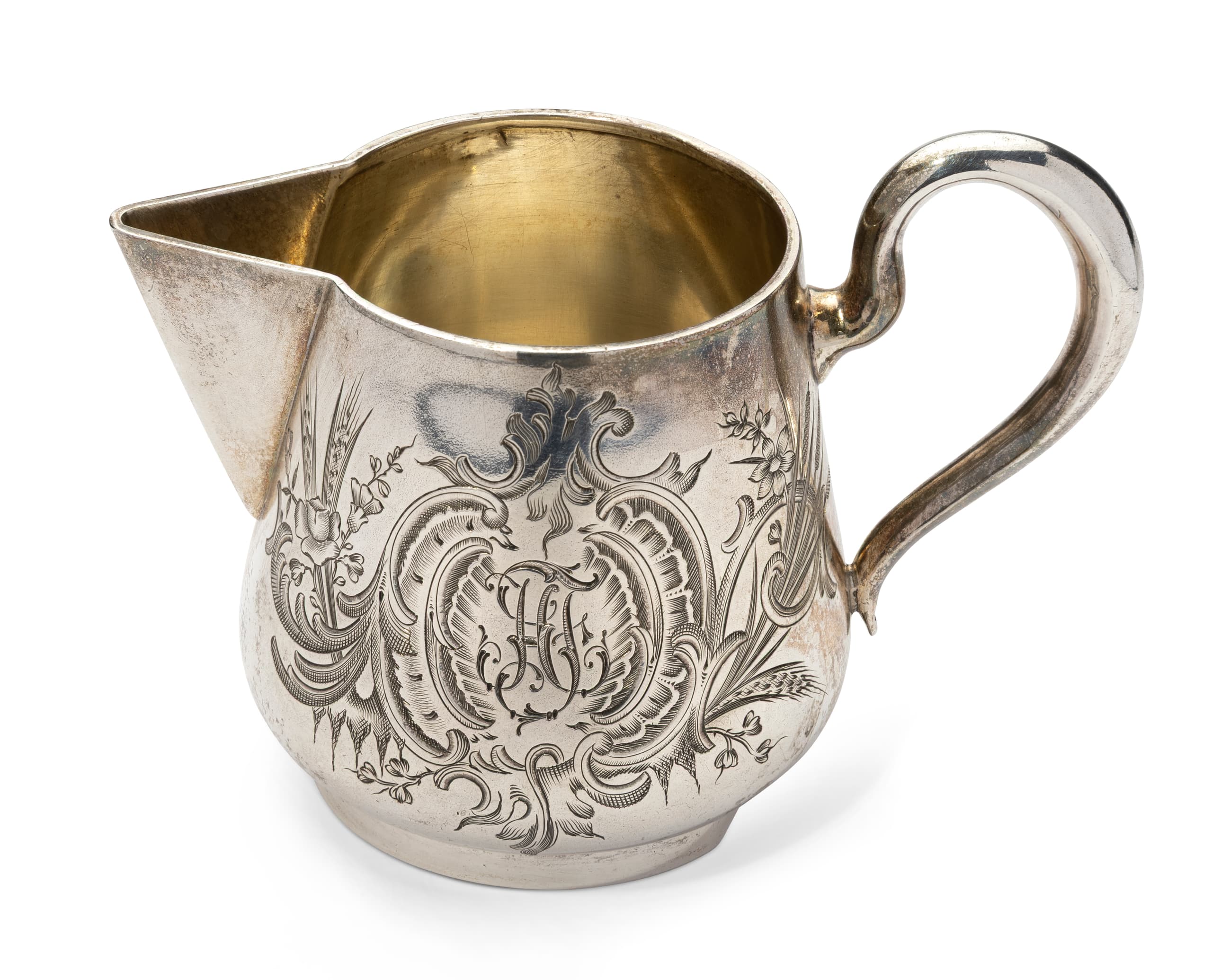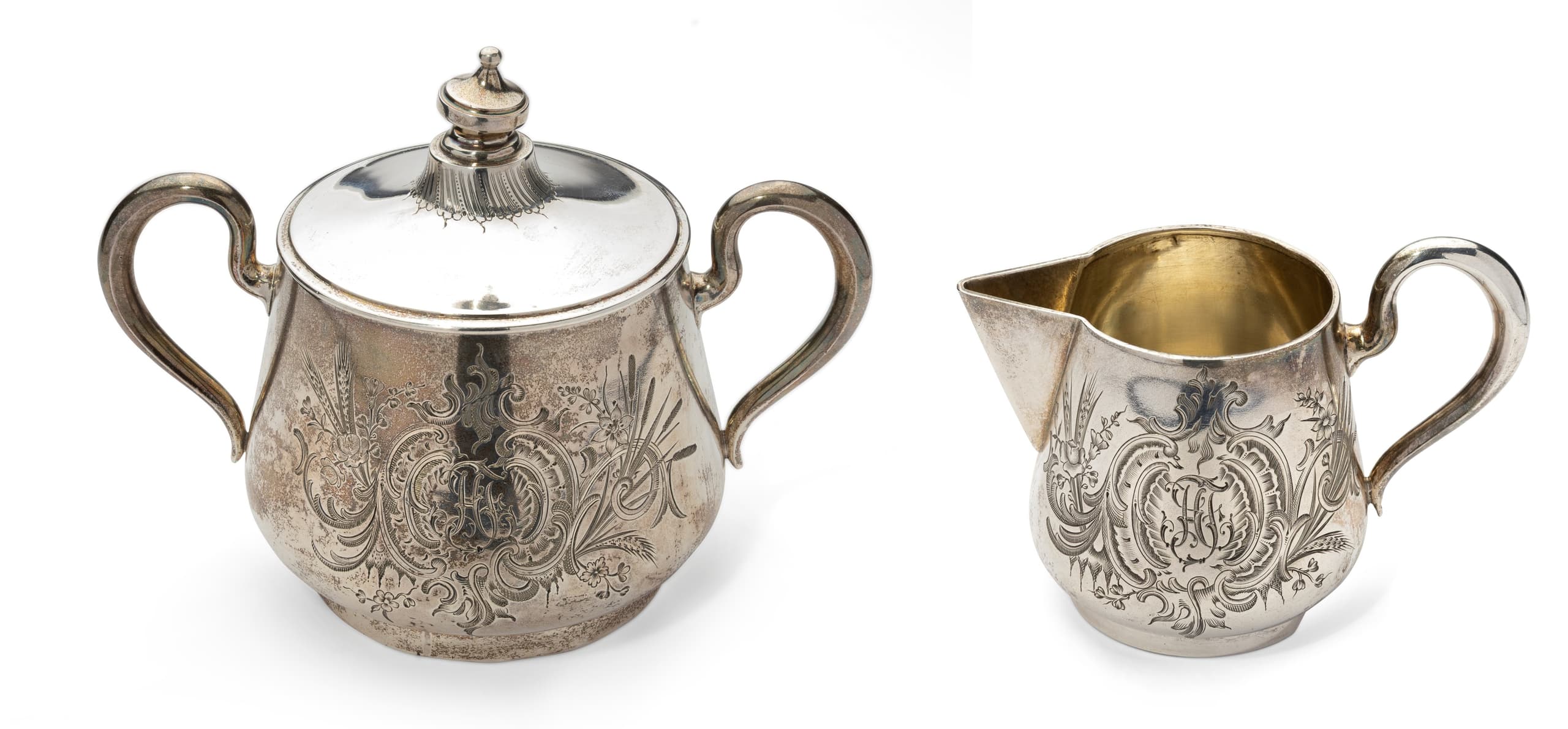TEA SET COMPRISING PARCEL-GILT SILVER SUGAR BOWL AND CREAMER WITH MONOGRAM ‘AD’ AND FLORAL DECORATION