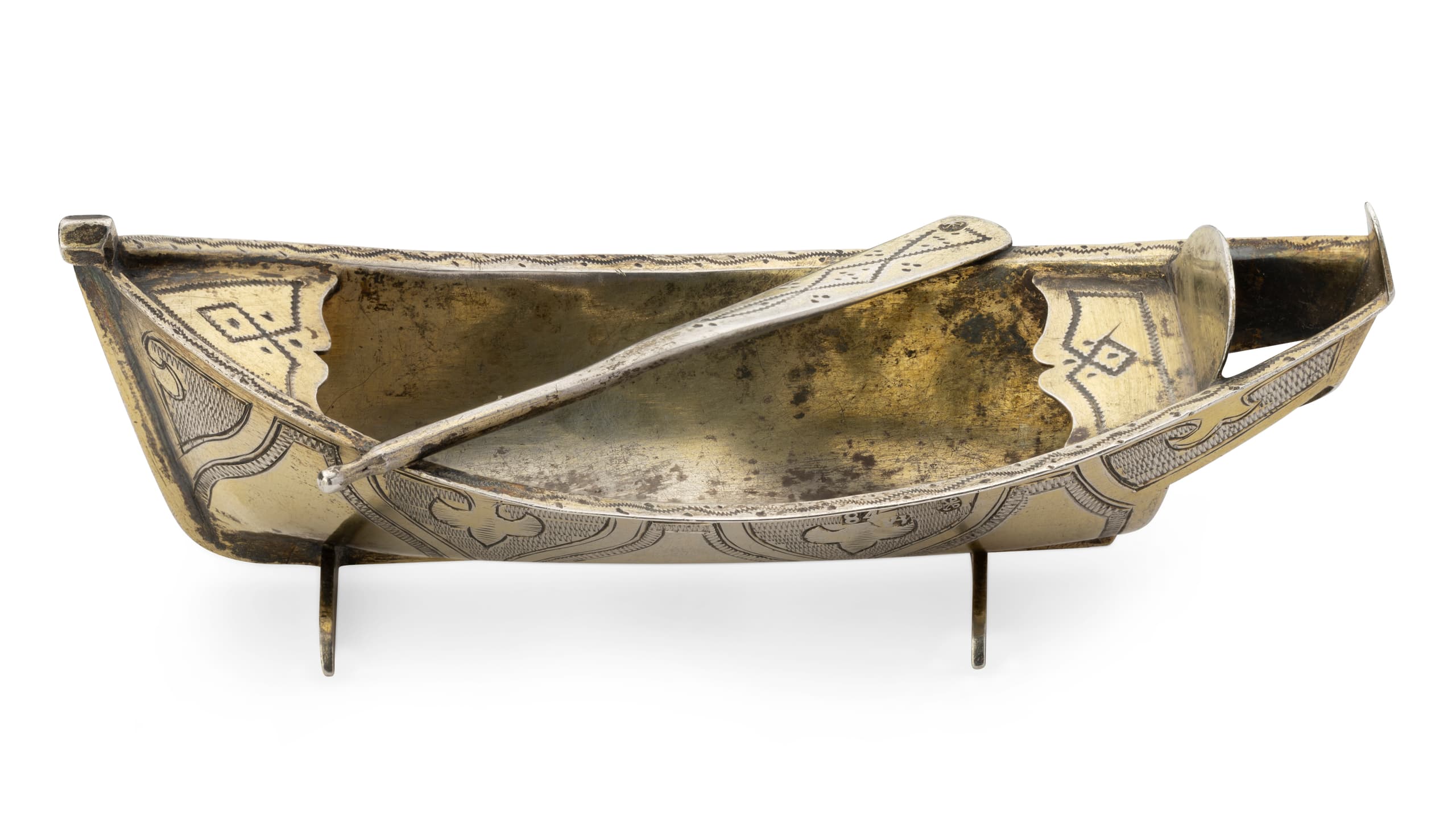 RUSSIAN SILVER-GILT SALT CELLAR SHAPED AS A BOAT WITH PADDLE St Petersburg, 1899-1908
