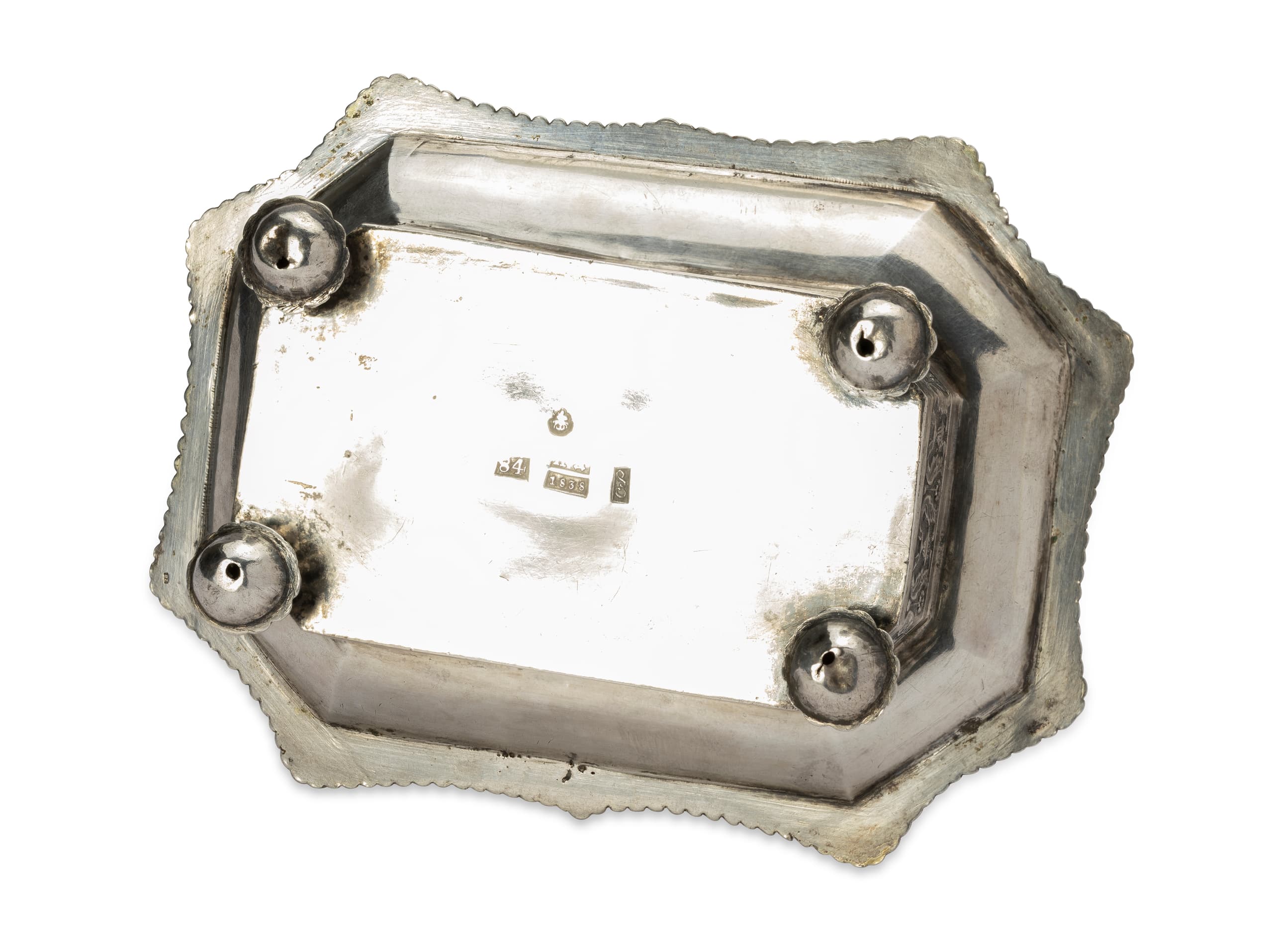 Hallmarks: ’84’ silver standard, city of mark of Moscow, maker’s mark ‘CP’, assay master’s mark in Cyrillic ‘ND’ (for Nikolai Lukich Dubrovin) above the date 1838