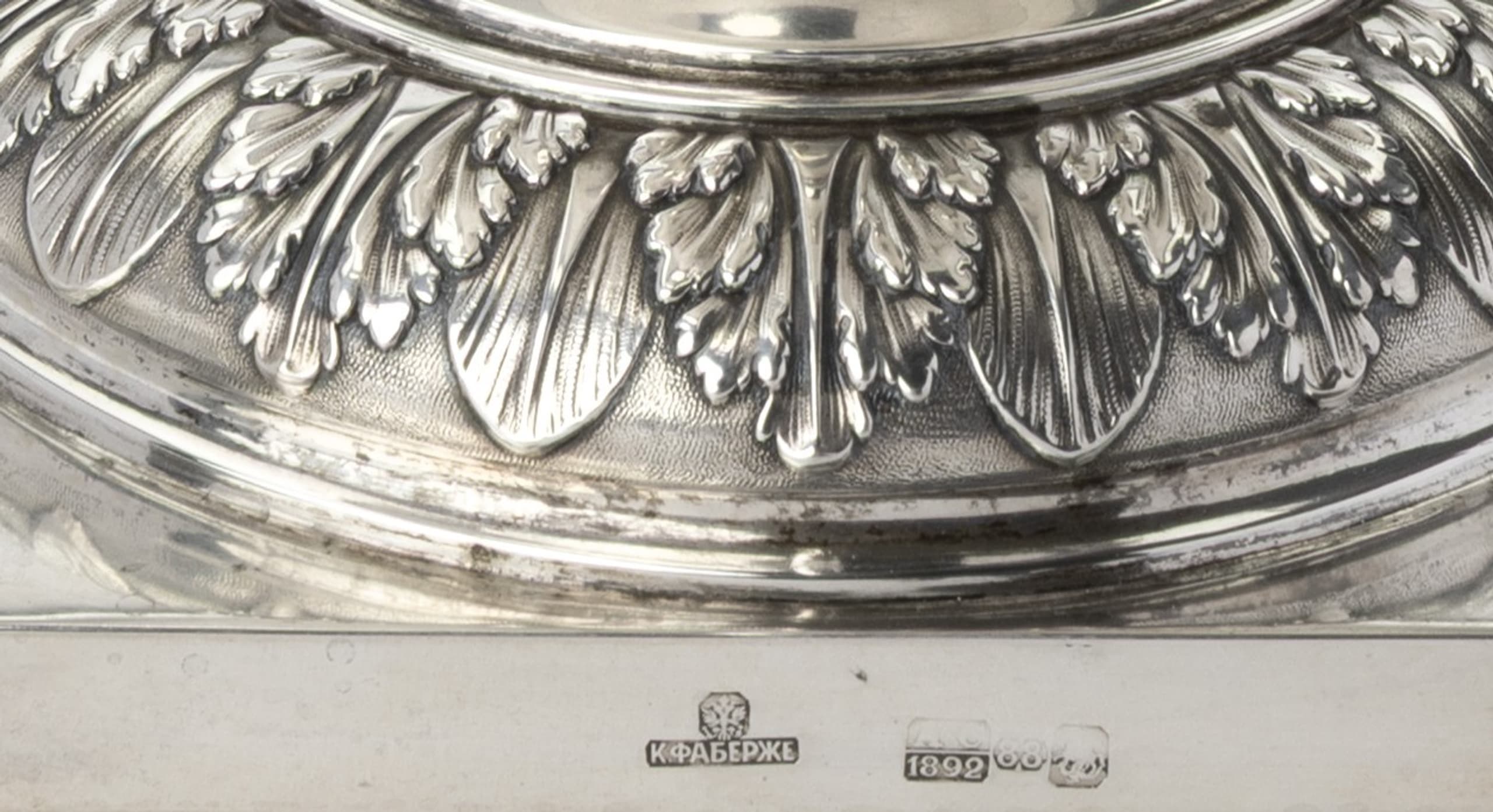 Hallmarks: firm’s mark in Cyrillic ‘K Faberge‘ under Imperial warrant, ‘88’ silver standard, city mark of Moscow, assay master’s mark in Cyrillic ‘AS’ above date 1892