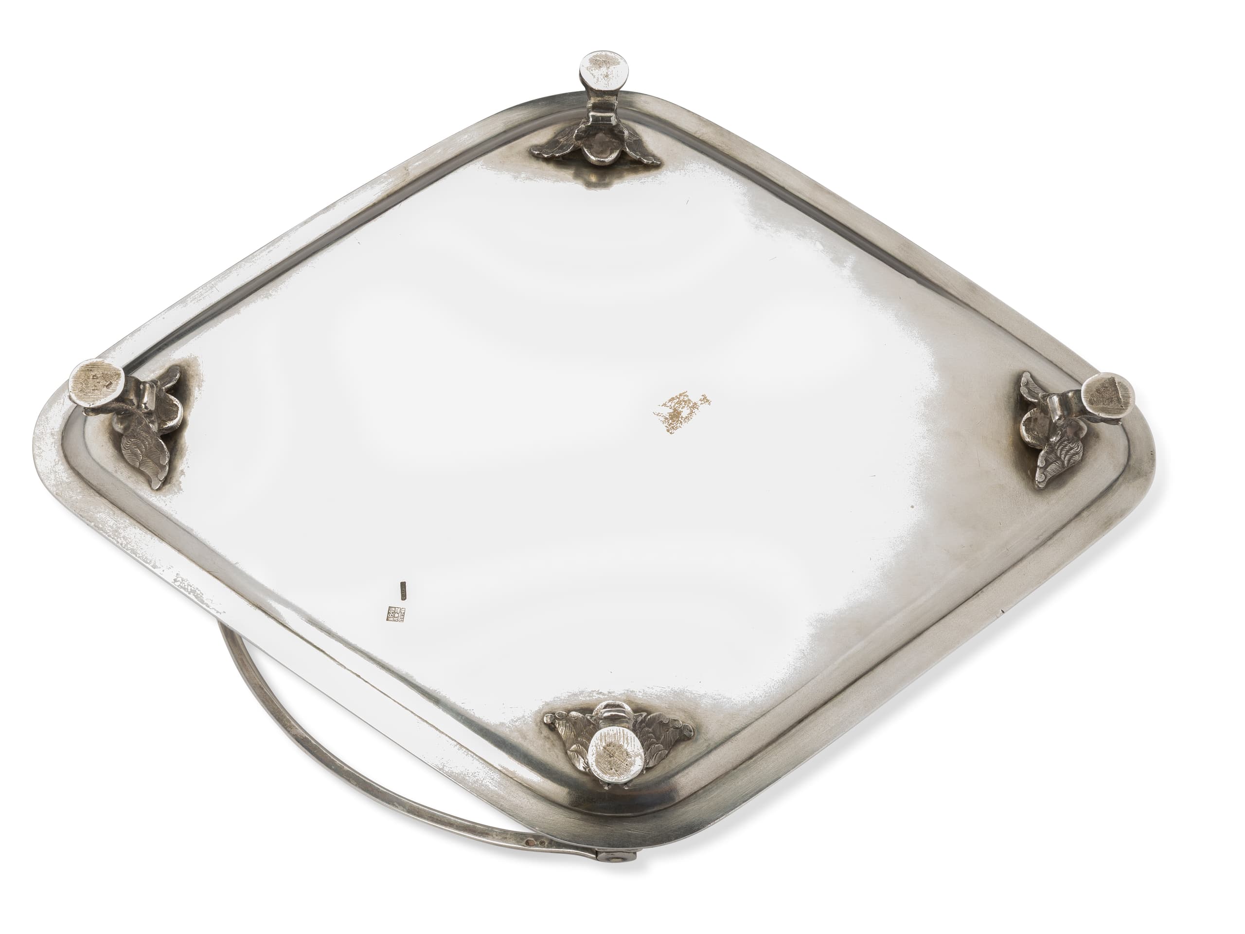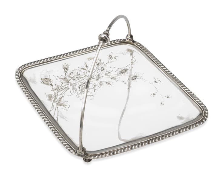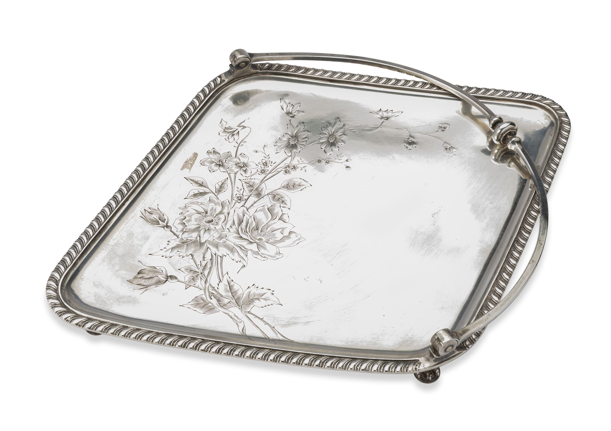 FABERGE SILVER TRAY WITH FLORAL ENGRAVING AND A SWING HANDLE The House of Faberge, 1894