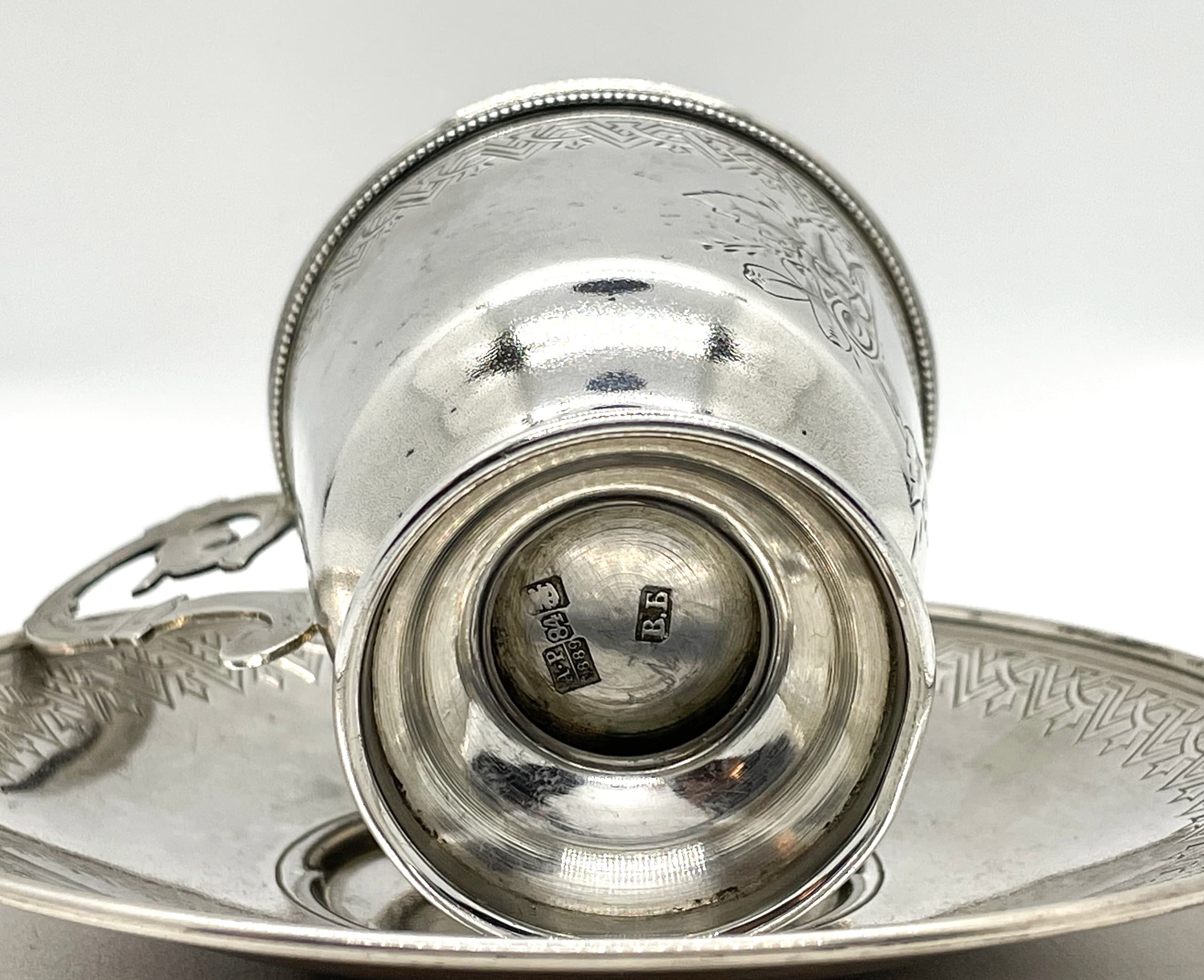 Marks: silver standard mark ‘84’, coat of arms of Moscow ‘Saint George’, assay master’s mark in Cyrillic ‘AR’ (for Romanov A. 1886-1894) above the date ‘1889’, workshop mark in Cyrillic ‘V.B’ (for Vasily Efimovich Baladanov, owner of a Moscow silverware factory founded in 1877) H. (cup) circa 6 cm, diameter (saucer) 11 cm total gross weight: 114 gr.