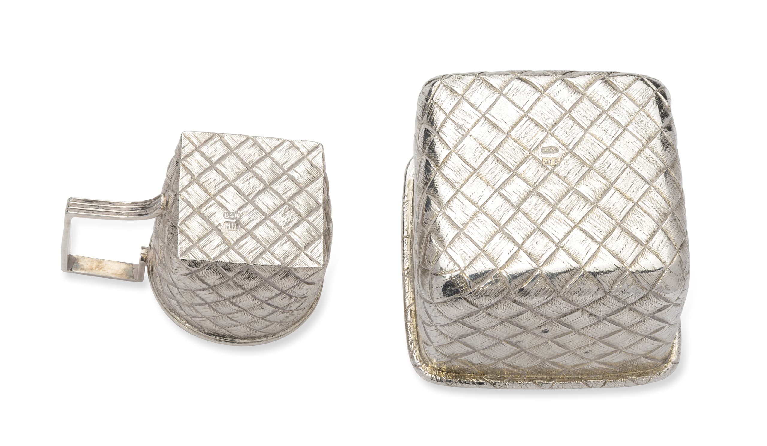 Hallmarks: standard silver mark ‘84’, master’s mark in Cyrillic ‘A.Ya.S’ for A. Ya. Sokolov (1867-1892), coat of arms of St. Petersburg basket 4.5 x 6.5 x 6.5 cm gross weight: 103.47 gr. vodka glass with handle 4.5 x 4 x 6 cm gross weight: 28.50 gr.