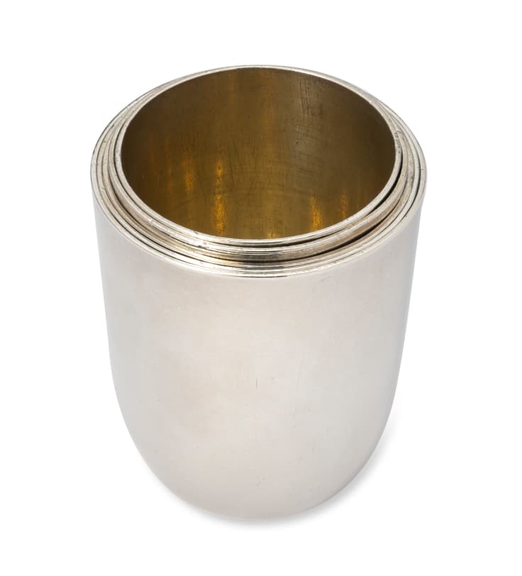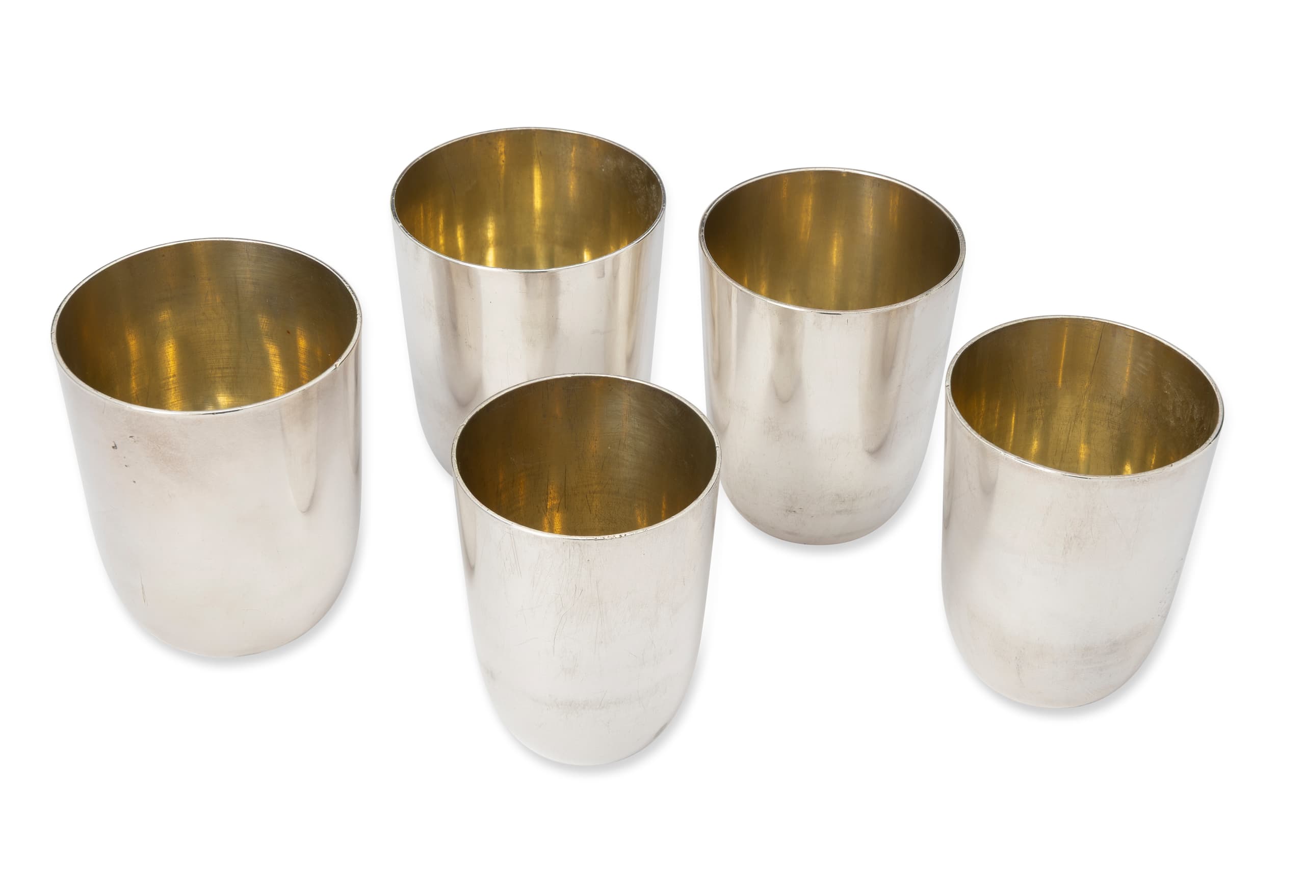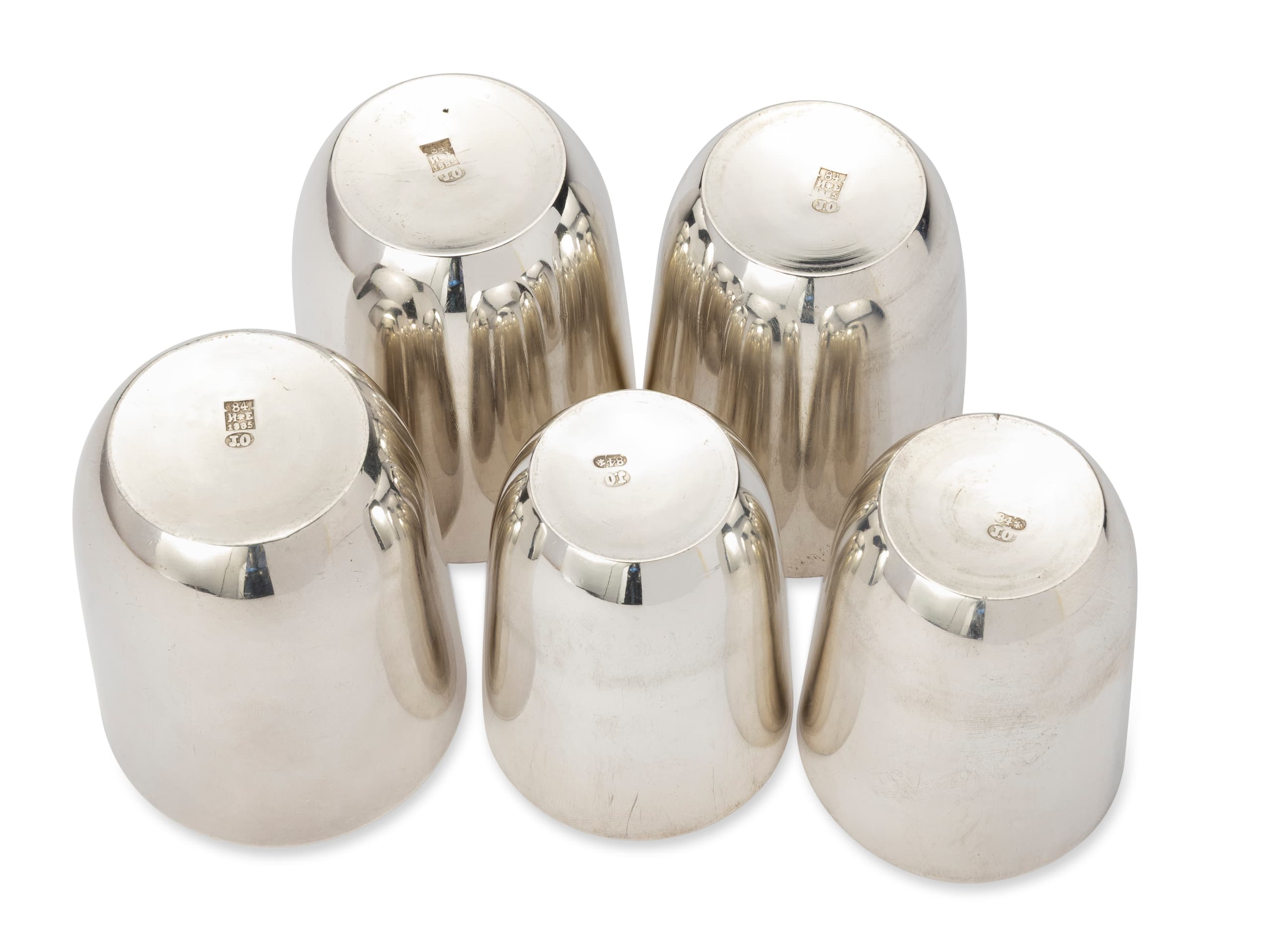 FIVE RUSSIAN TRAVEL STACKING SILVER BEAKERS / VODKA SHOT BEAKERS