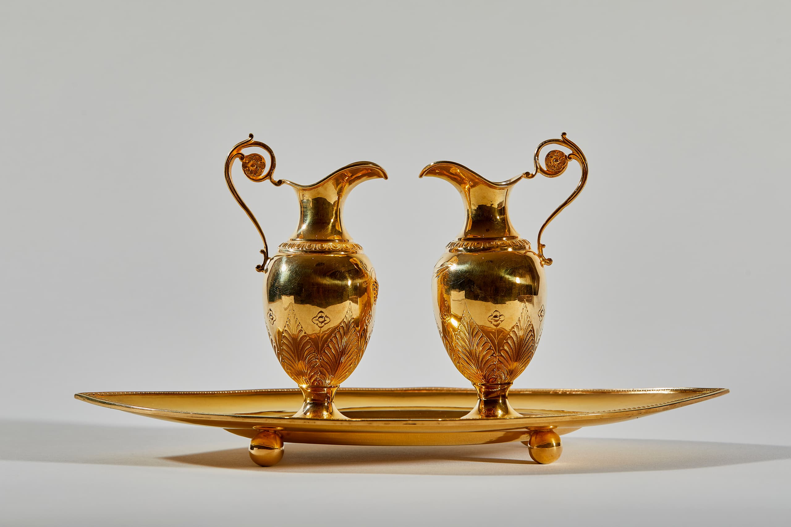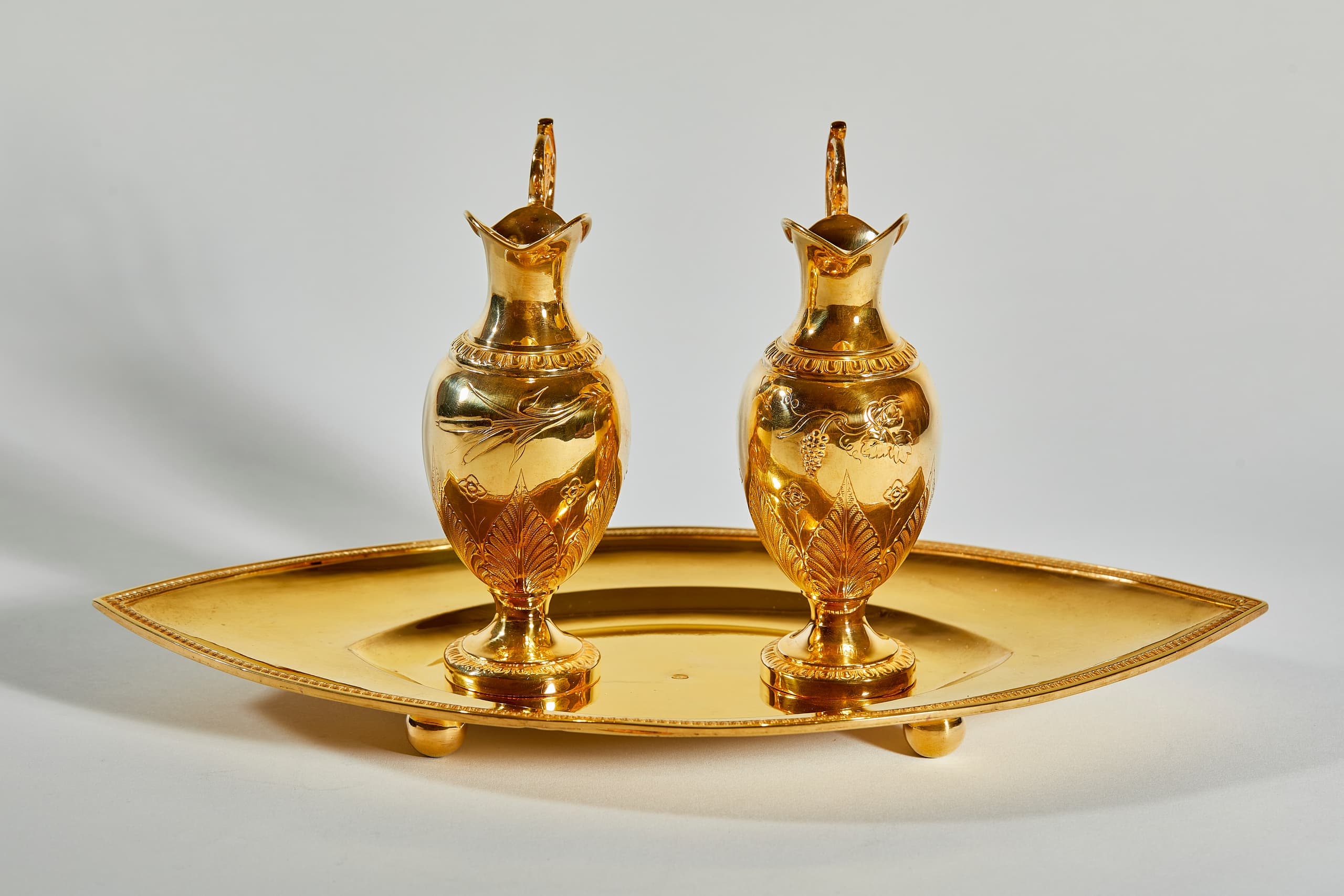 SET OF SILVER-GILT AND EMPIRE STYLE LITURGICAL CRUETS WITH THEIR TRAY