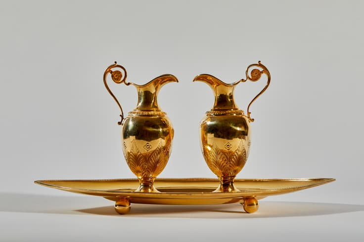 The shuttle-shaped tray is chiselled and decorated with a frieze around the edges. The cruets are finely chiselled and decorated with reeds, leaves and grape branches.