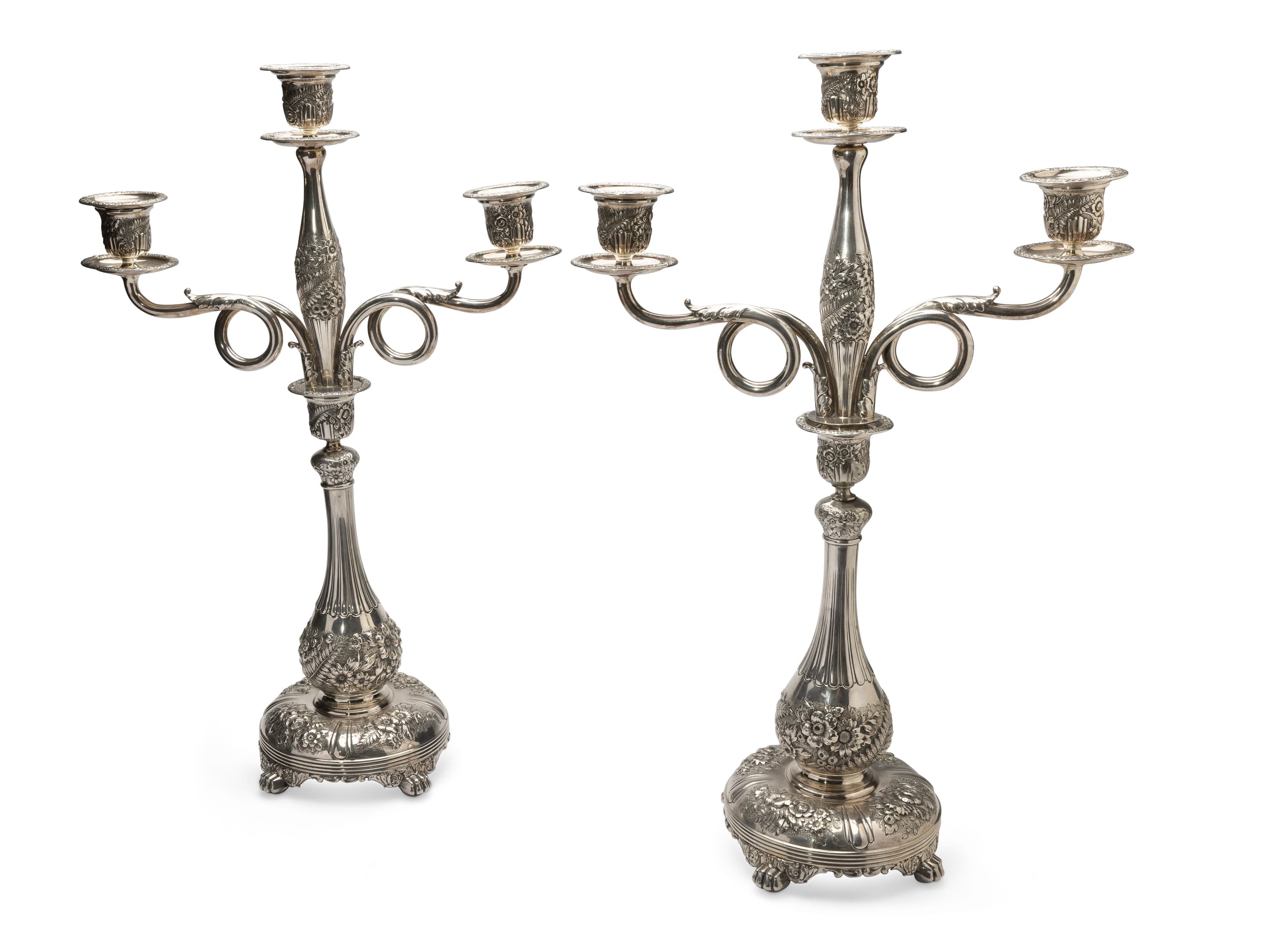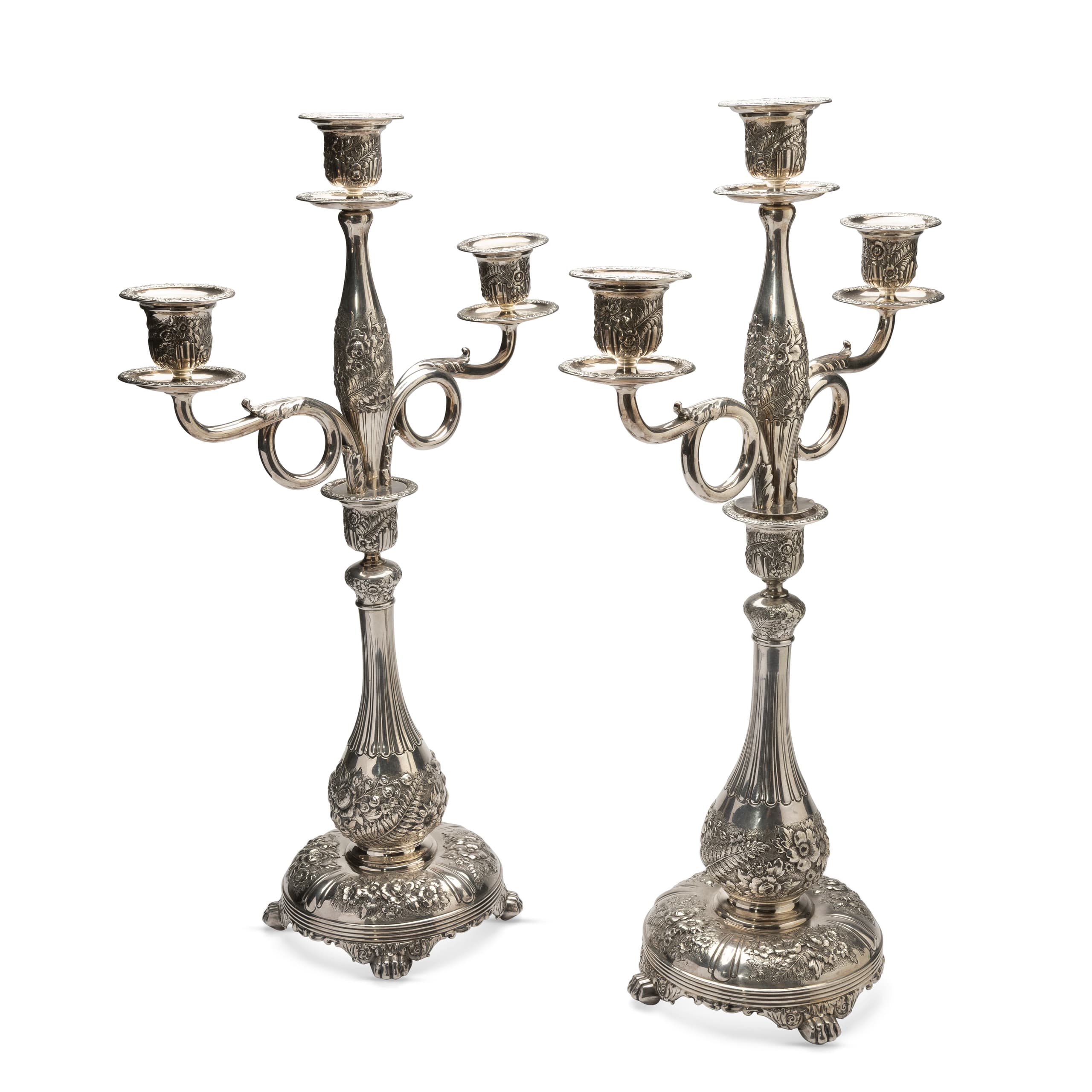 each on a circular base with four lion’s feet, with stem, base and branches decorated with chiselled garlands of flowers and foliage Mark of TIFFANY &CO MAKERS Hallmarks: signed and numbered ‘2749/ TIFFANY &CO/MAKERS, SILVER SOLDERED E.F/X (on the round plate on the underside, other is missing) H. 50 cm (each)
