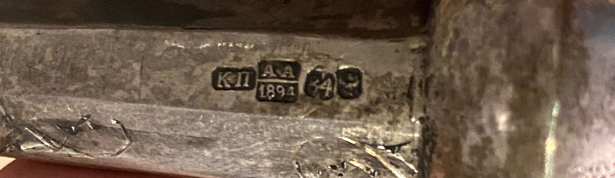 Hallmarks: silver mark ‘84’, the coat of arms of the city of Moscow ‘St. George’, assay master’s mark in Cyrillic ‘A.A’ above the date ‘1894’, master’s mark in Cyrillic ‘KP’ for Konstantine Yakovlevitch Pets silver, chasing L. 27 cm gross weight: 56.61 gr.