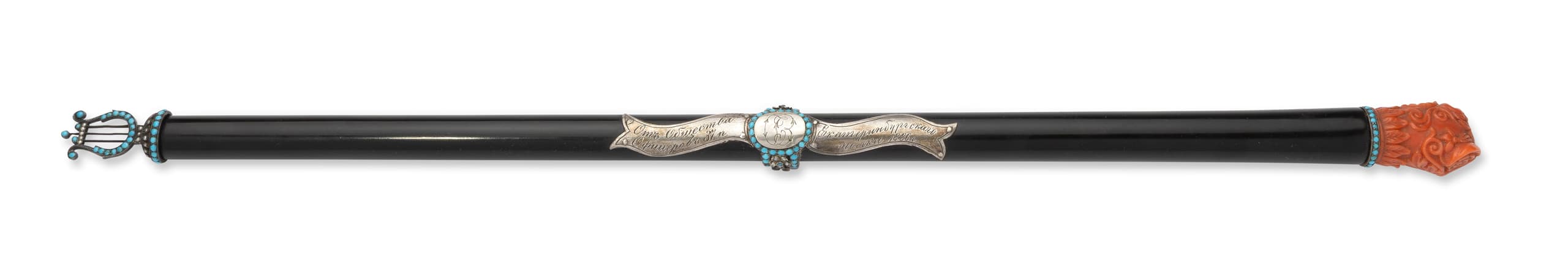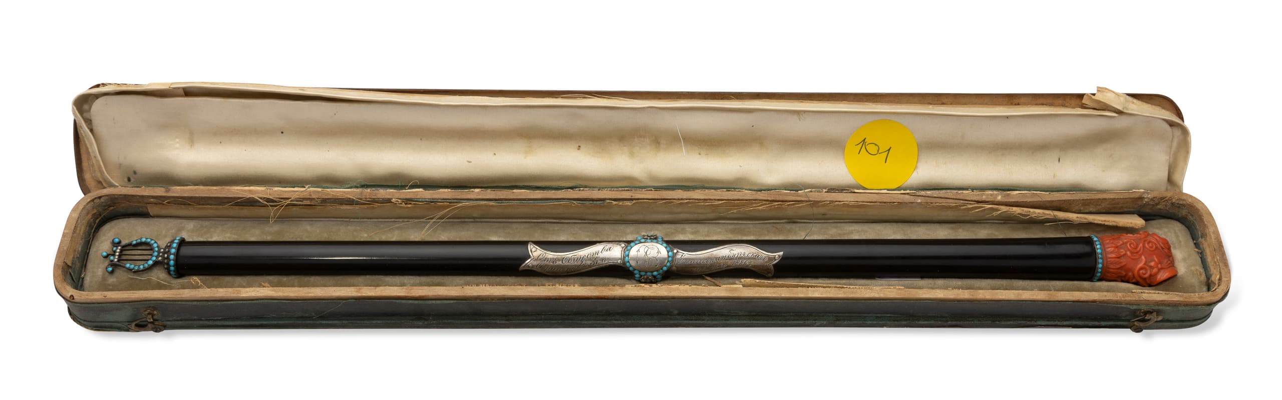 in polished wood decorated with engraved silver cartouche, turquoise pearls and carved coral finial engraved in Cyrillic ‘Ot Obshestva ofitzerov 37 / Ekaterinburgskogo polka 1886’, monogram L. 41.5 cm In original box with important signs of wear The 37th Ekaterinburg Infantry Regiment was an infantry unit of the Imperial Russian Army. During the Napoleonic Wars, the regiment conducted active military operations.