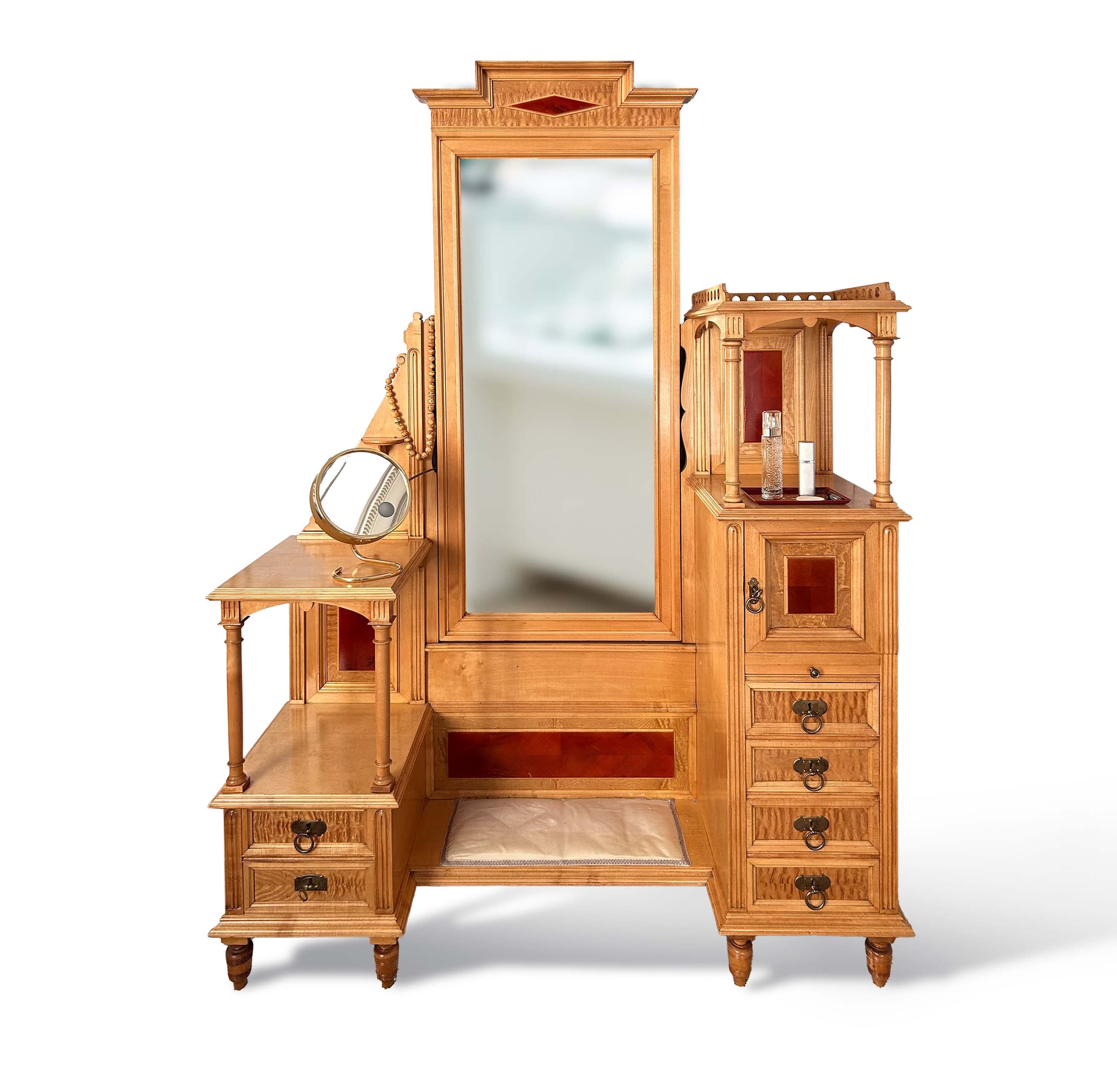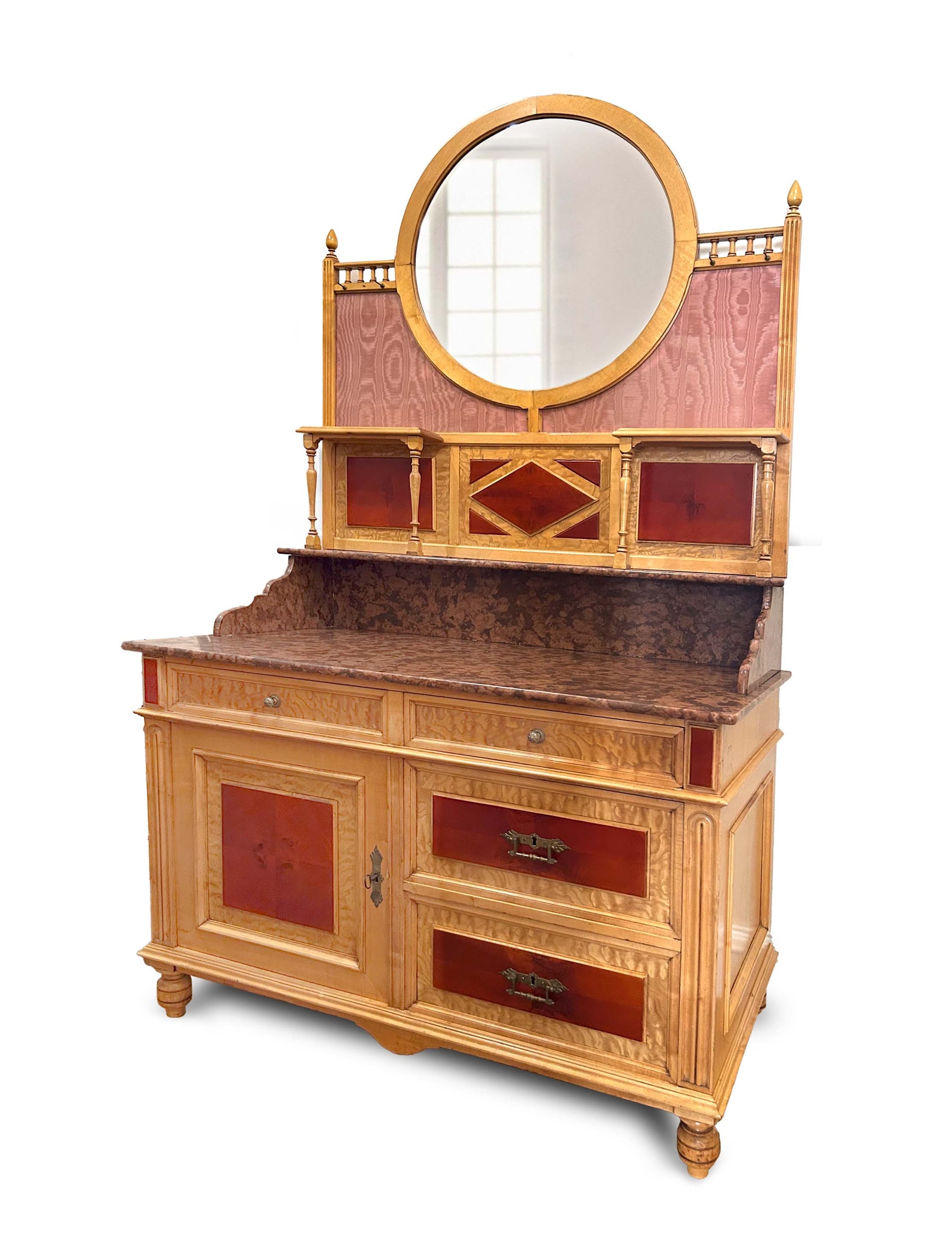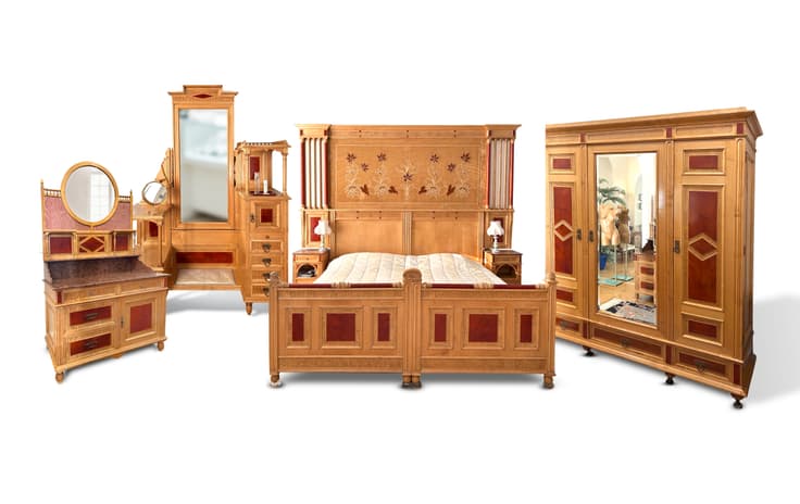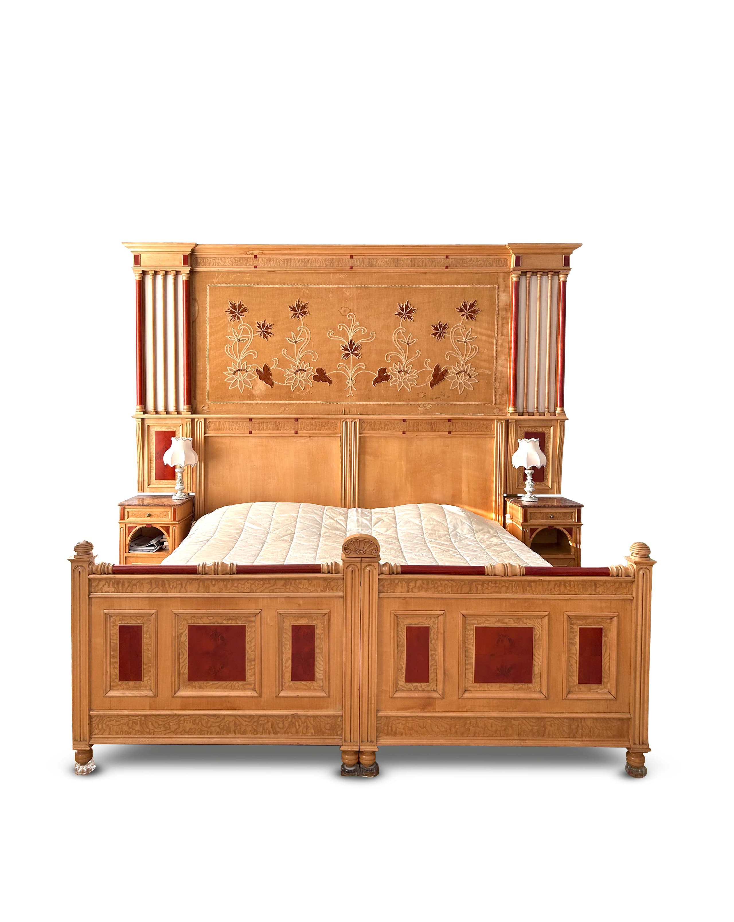 magnificent set of furniture for the bedroom, in maple, lemon and oak, with mahogany geometric decoration, from a German castle, transported to France around 1930, comprising :