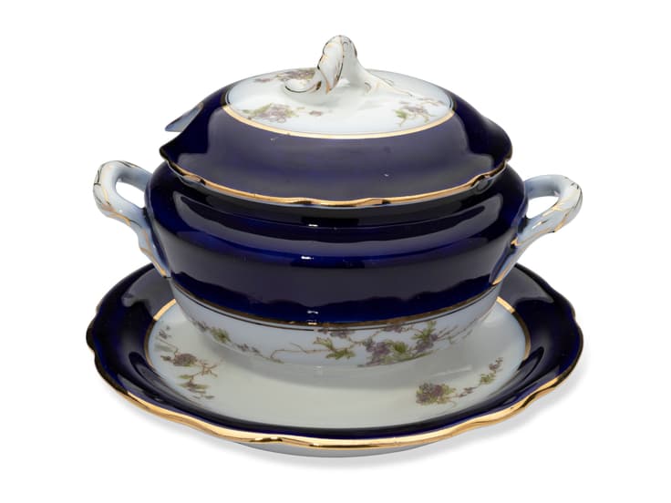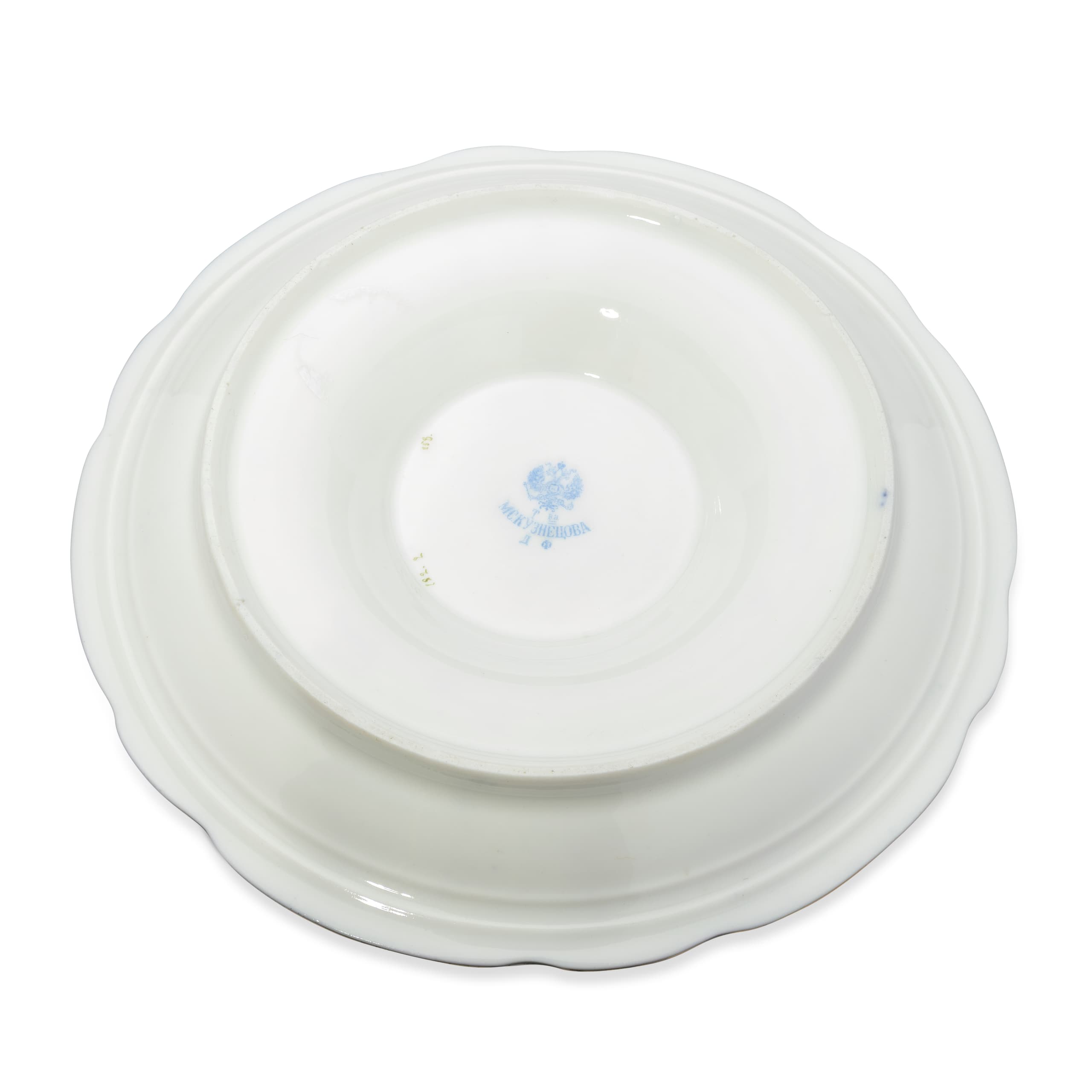 Mark of the M.S. Kuznetsov manufacture in Verbilki 1890 - 1917 (on the underside) H. circa 15 cm (with cover), diameter (plate) 20 cm