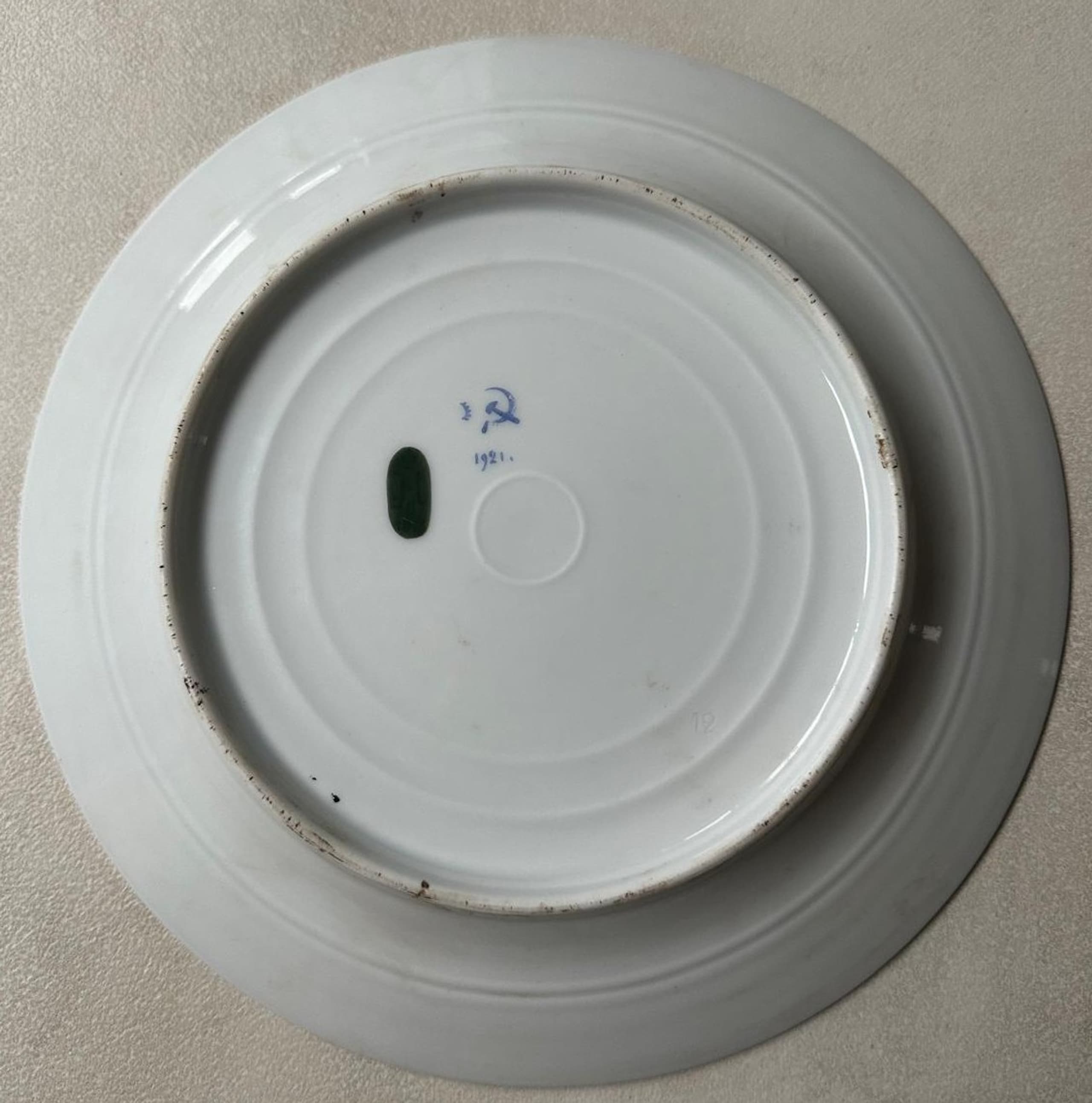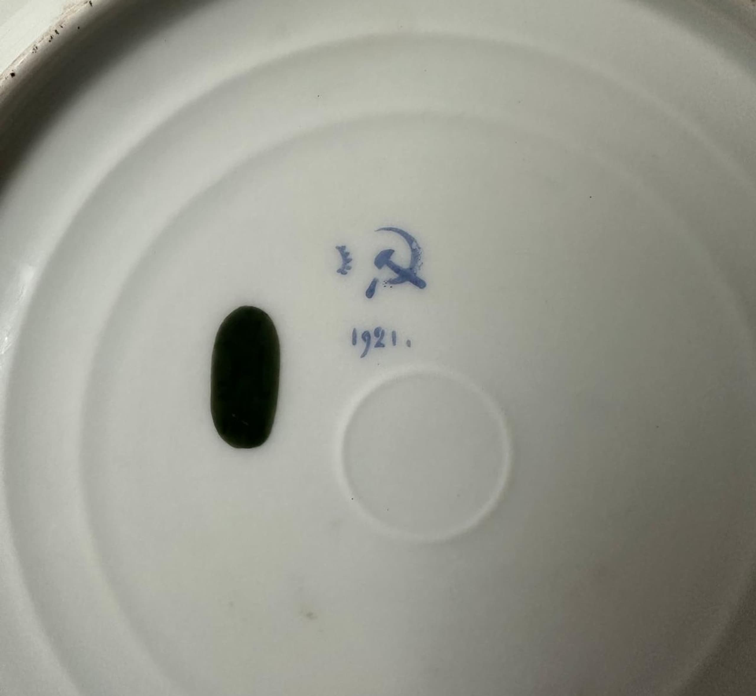 Marks: Mark of the Imperial Porcelain Factory covered by a green circle, blue overglaze marks: hammer, sickle, cog, 1921