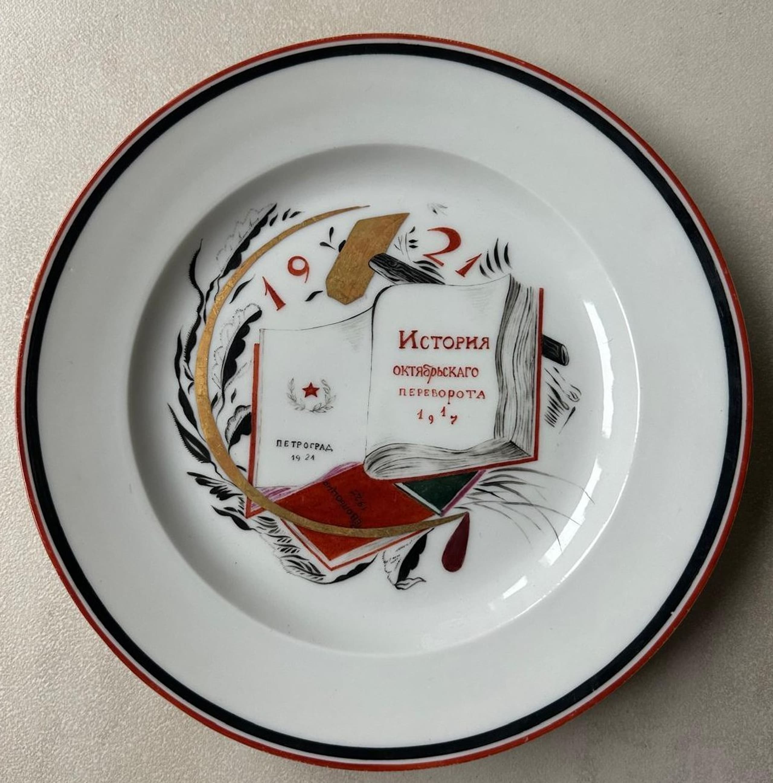 PORCELAIN PROPAGANDA PLATE WITH AN OPEN BOOK: ‘HISTORY OF THE OCTOBER TAKEOVER. 1917’