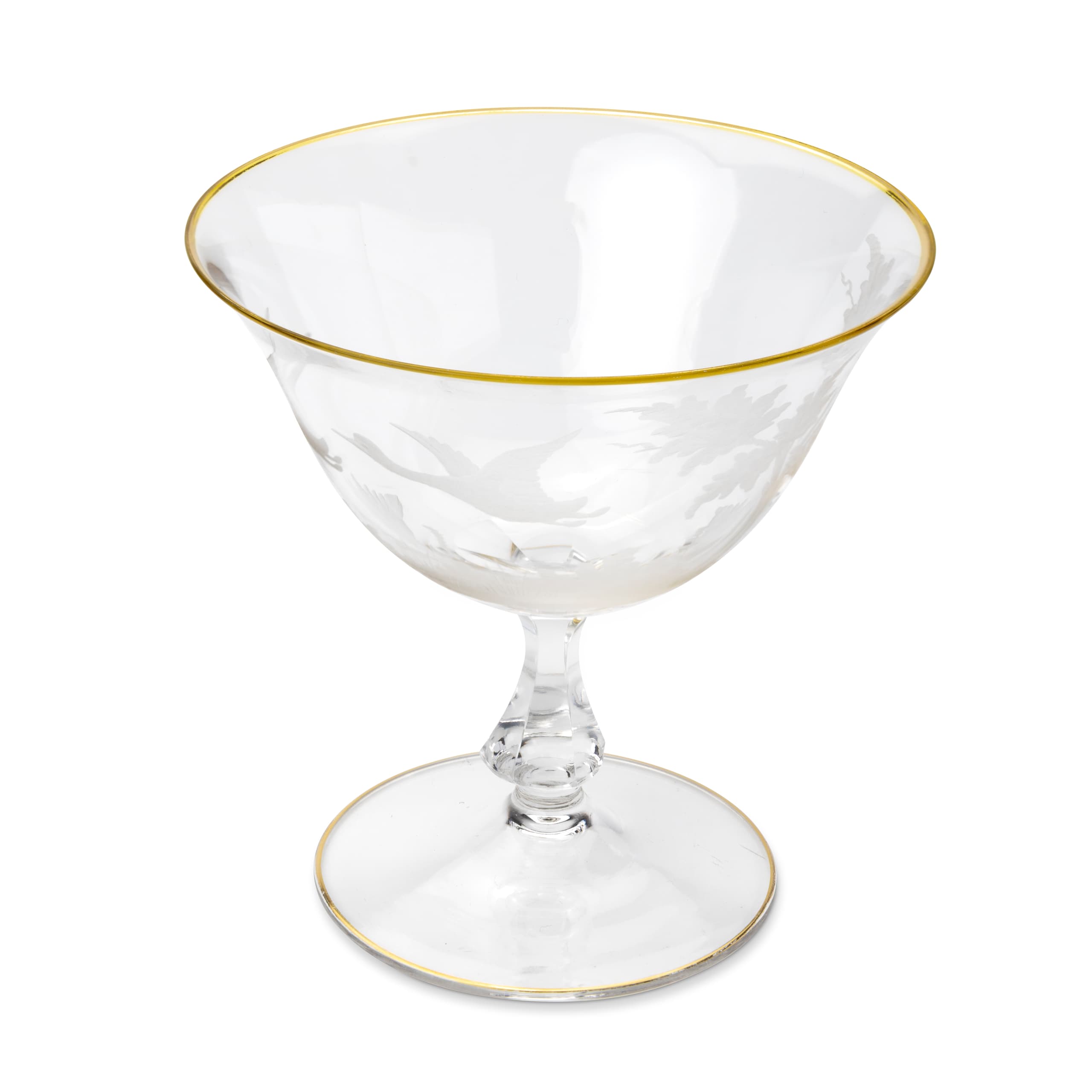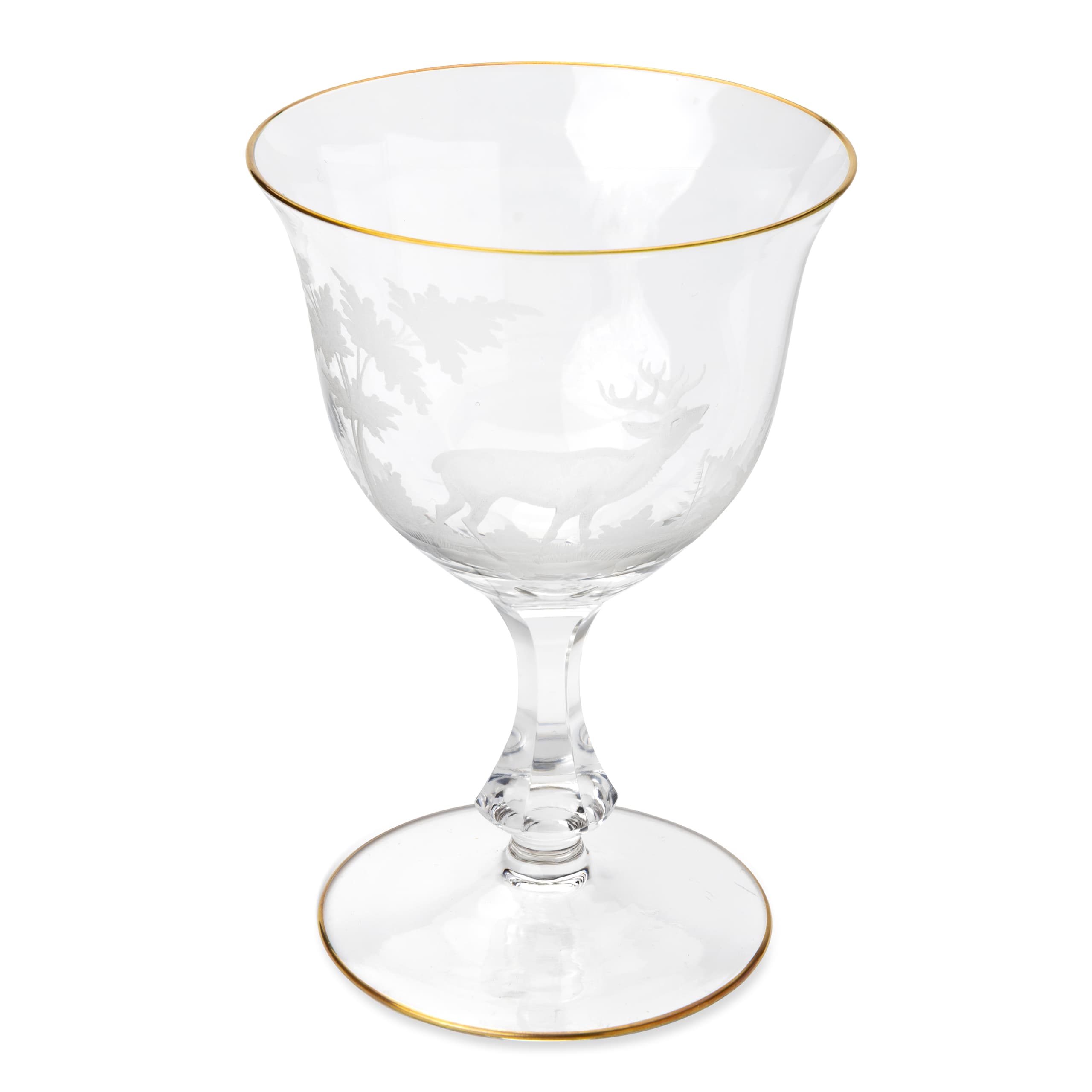 Set of crystal glasses engraved with wild animals, plants and trees, with finely gilded rims and stems, perfect for Christmas! H. 13 cm (wine glass), 10 cm (champagne glass)