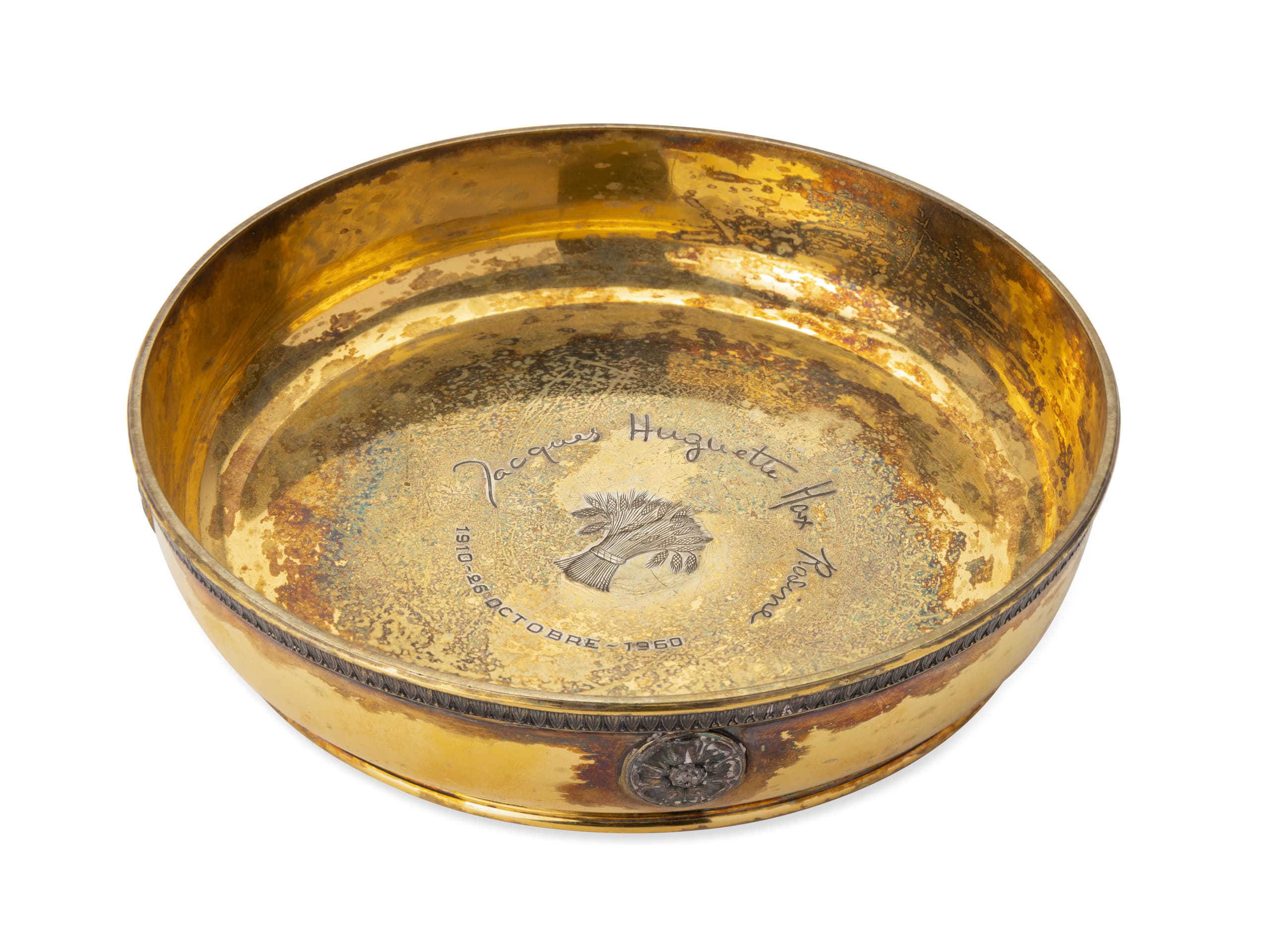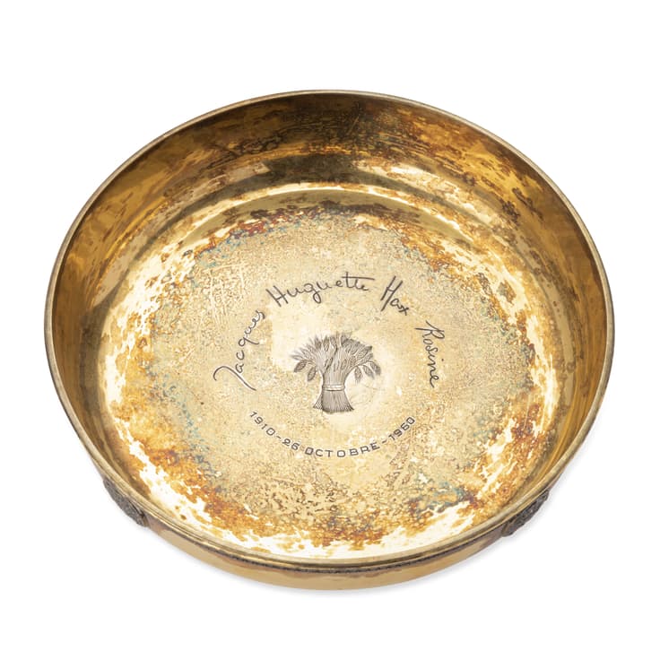 engraved ‘Jacques Huguette Hax Rosine.1910-26 October 1960’ D. 14.4 cm, H. 3 cm Condition : signs of oxidation over the tray