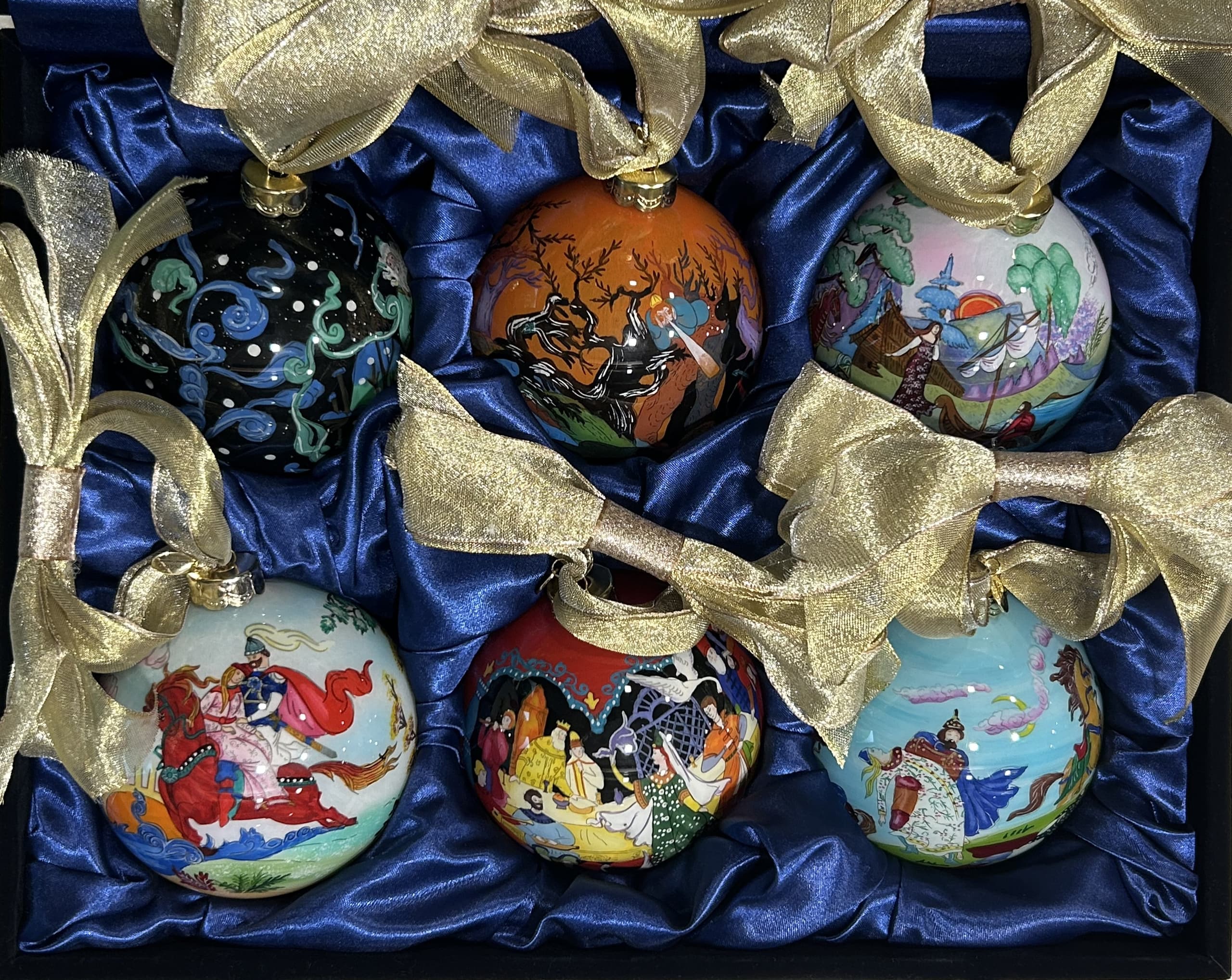 set of 6 Christmas balls, hand painted with Russian fairy tales motifs