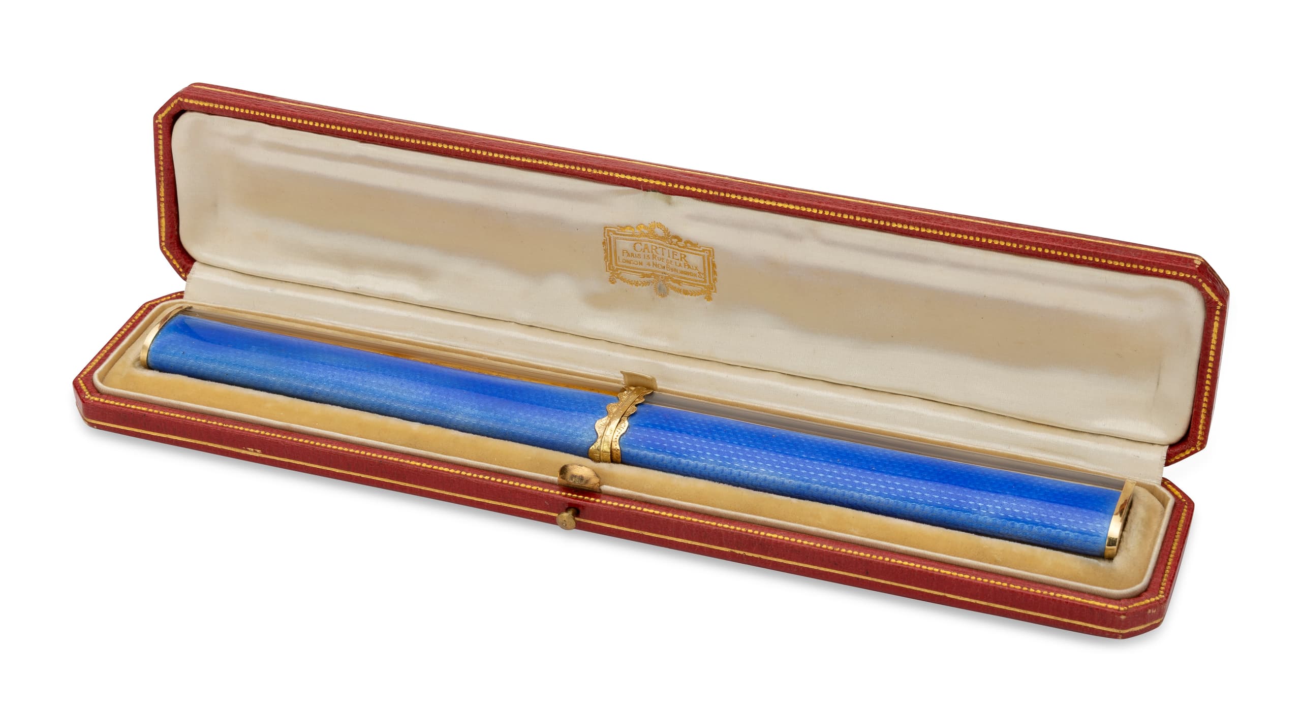 Following Fabergé's example Cartier offered its clientele precious objects of daily use decorated in the Cartier style, and in the style of the day which mainly used guilloché enamel with, or without, hardstones and precious stones. ln an era when wealthy clients wrote their letters with pens dipped in ink in precious inkstands, the envelopes were sealed with molten wax, the seal imprint marked the writer's crest or initials before the wax cooled and hardened, the scraper scraping away any useless drips of wax or used as a paper cutter to open the envelope. Cartier sold many models of scrapers, often as part of a writing set like the one sold to the soprano Nellie Melba, a great Cartier client, illustrated in 'Cartier -Exceptional Objects', O. Bachet and A. Cartier, Ed. Palais Royal, 2019, vol. 1 page 125.
