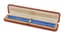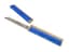 oblong-shaped silver handle and sheath guilloché and enameled blue with an agate border running along the bottom. Steel scraper blade. Plain gold end pieces which can be engraved with initials or a coat-of-arms. Etched gold centerpieces with a wave-like edge