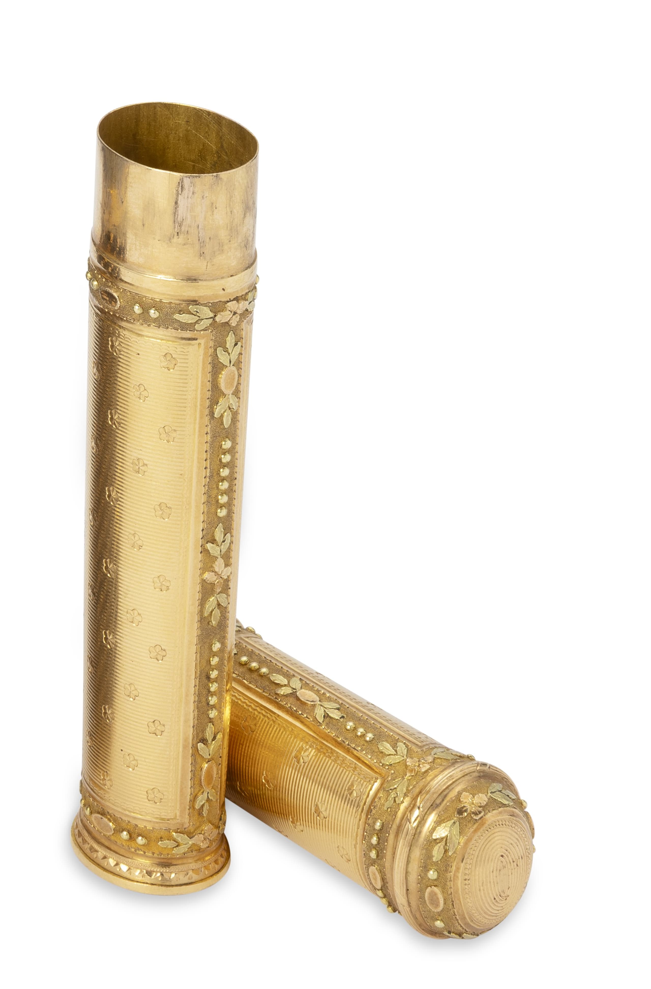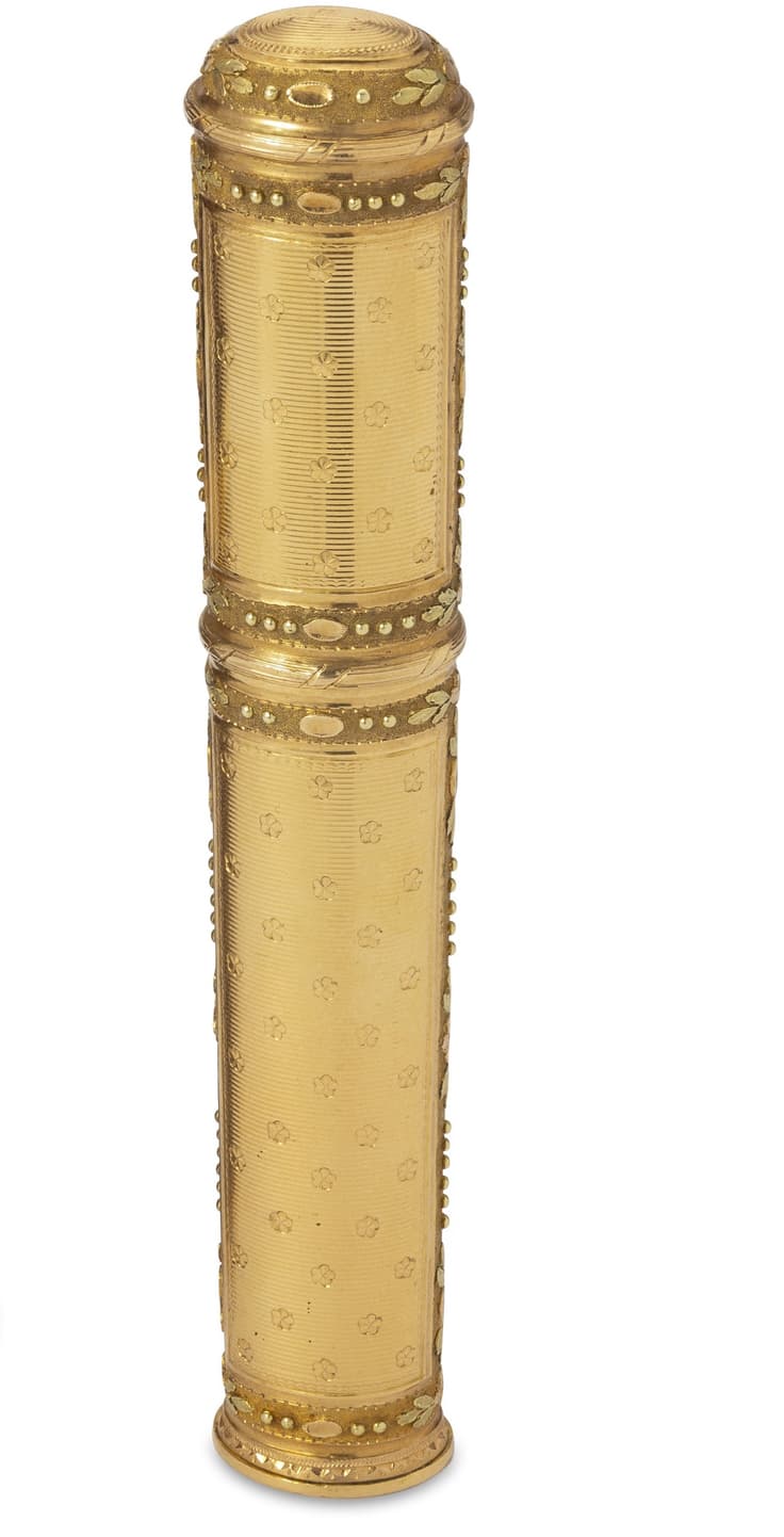 Of elongated cylindrical form, decorated with fine horizontal reeding and engraved floral motifs, the base with an oval seal with monogram