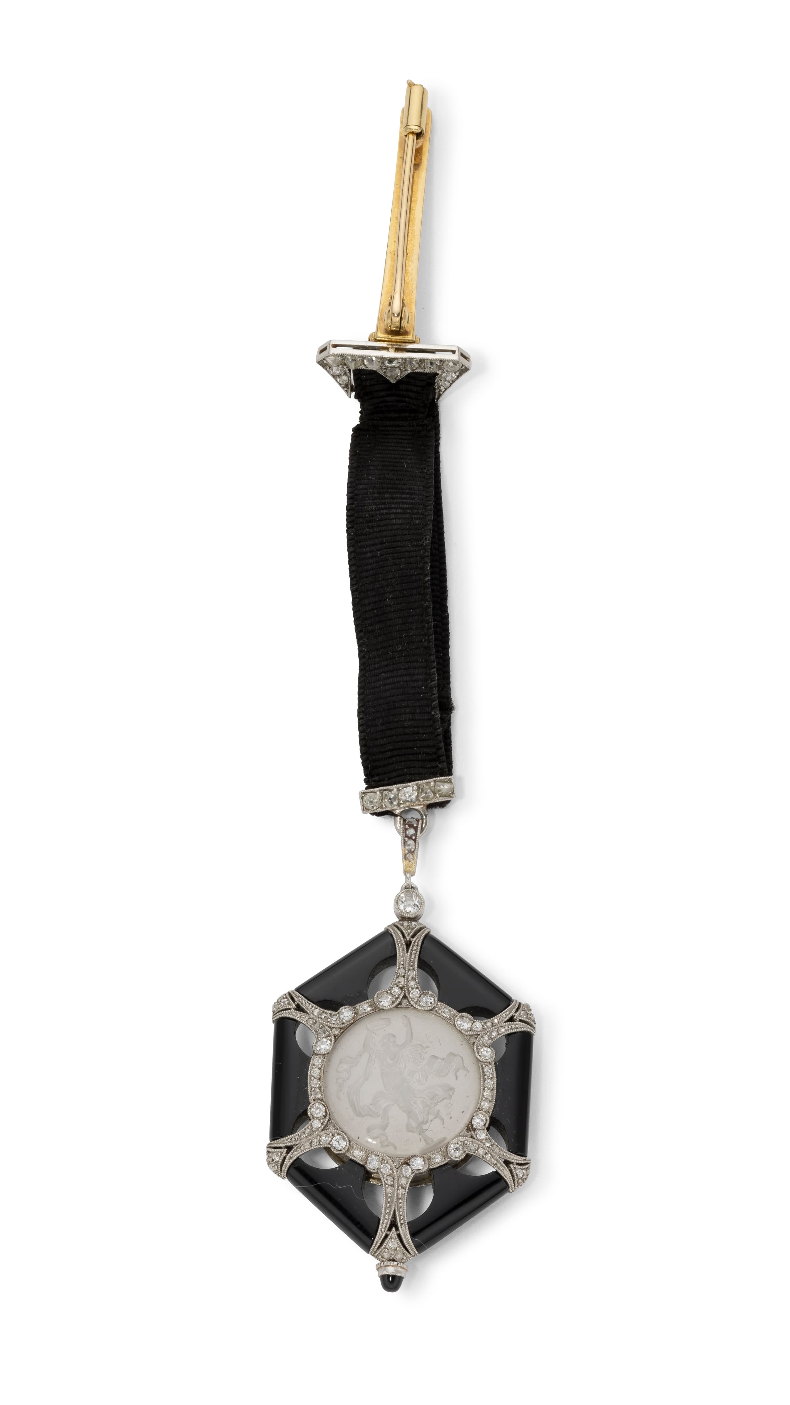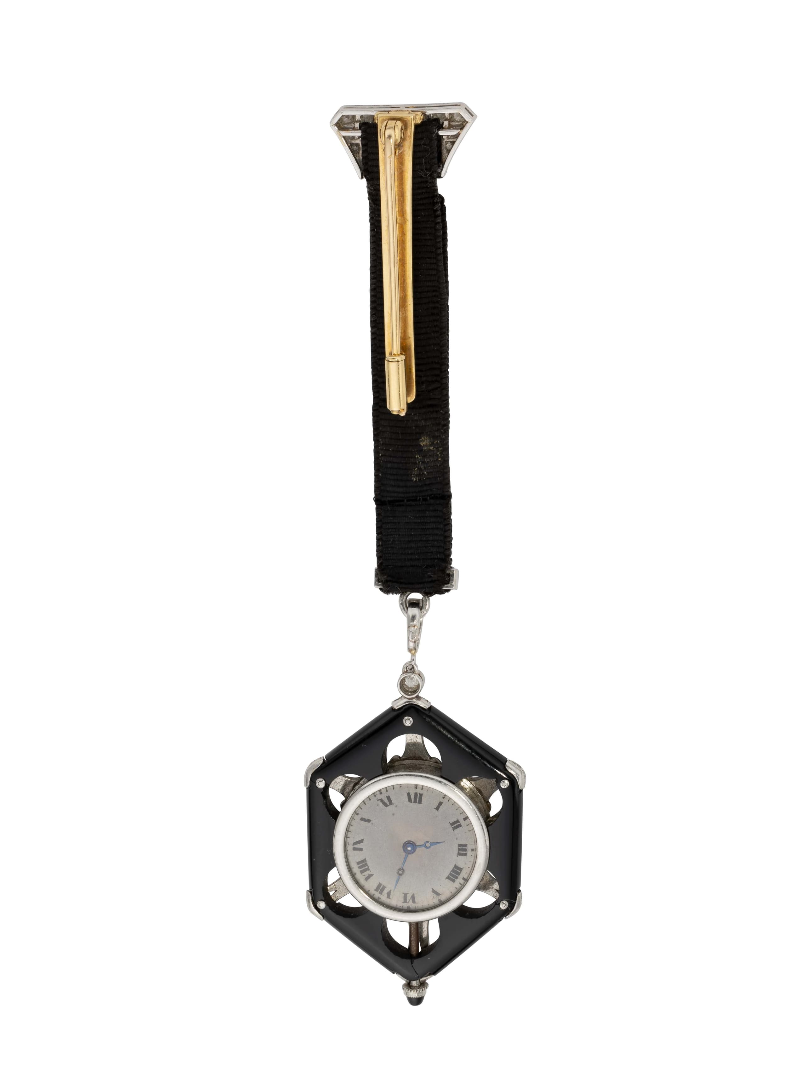 *RARE ONYX, PLATINUM AND DIAMOND WATCH WITH SATIN RIBBON, CIRCA 1925