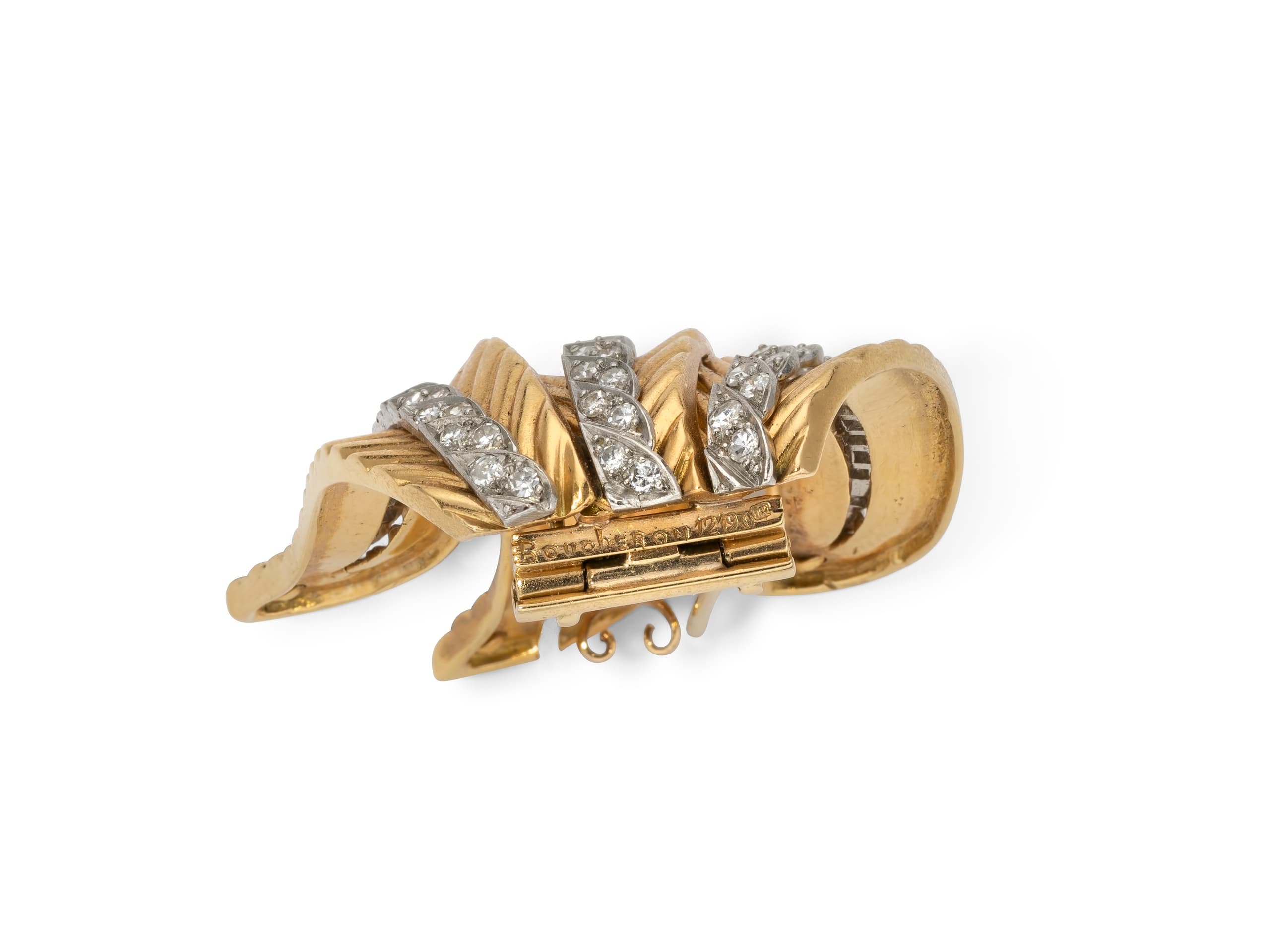 Vintage Boucheron set consisting of a ring and a brooch-clip in 18k yellow gold, platinum and set with diamonds weighing approximately 2.00 ct in total Hallmarks: ‘750’, ‘owl’, numbered ‘12190’ (brooch), signed ‘Boucheron’ (ring) size (ring): 50 size (brooch) 4.5 x 3.5 cm total gross weight: 31.27 gr.