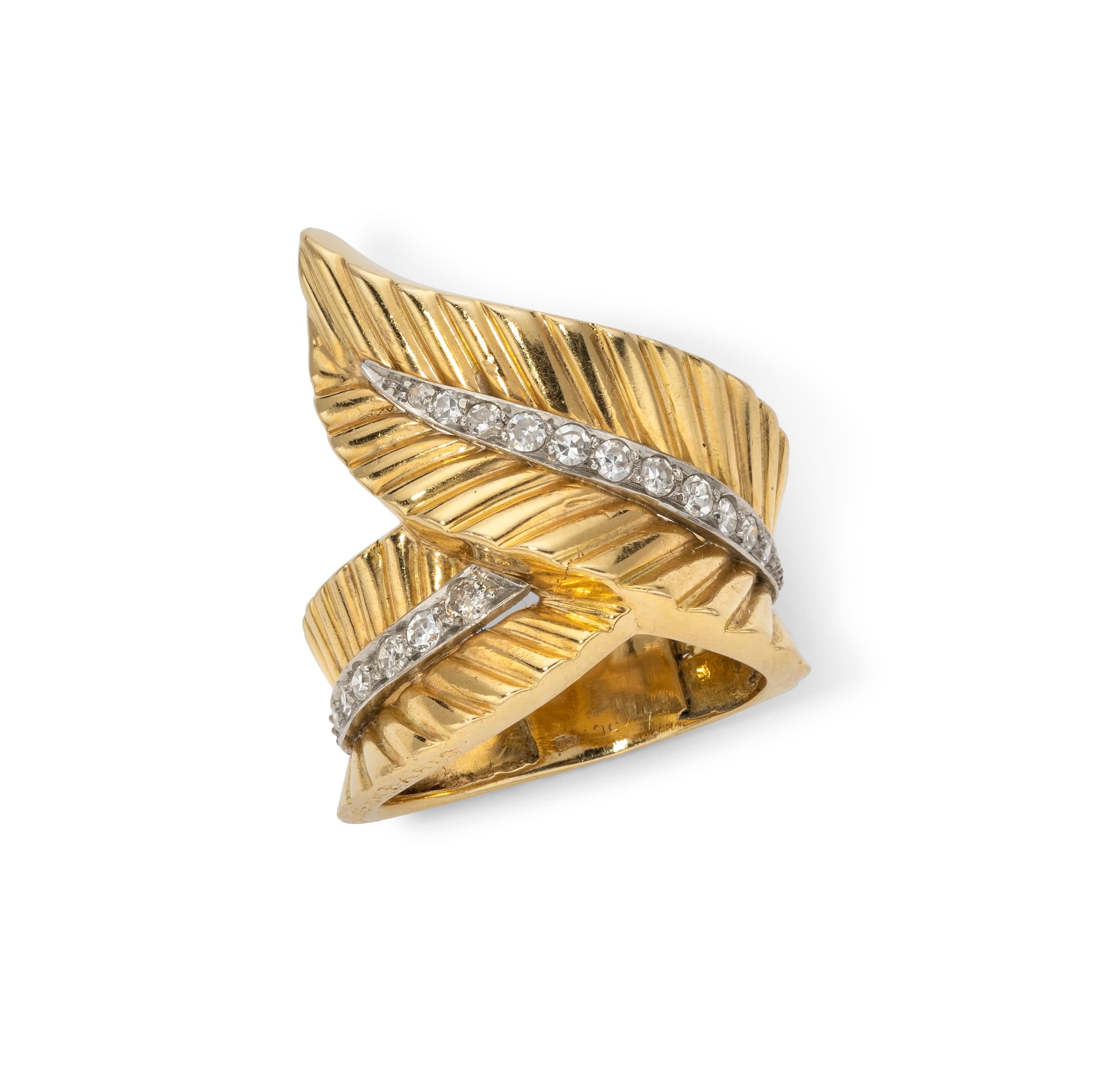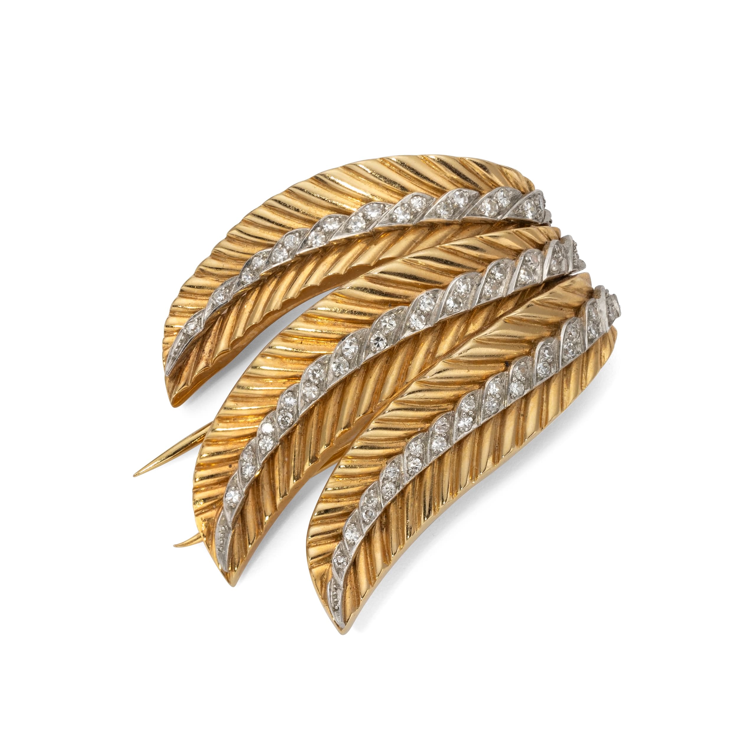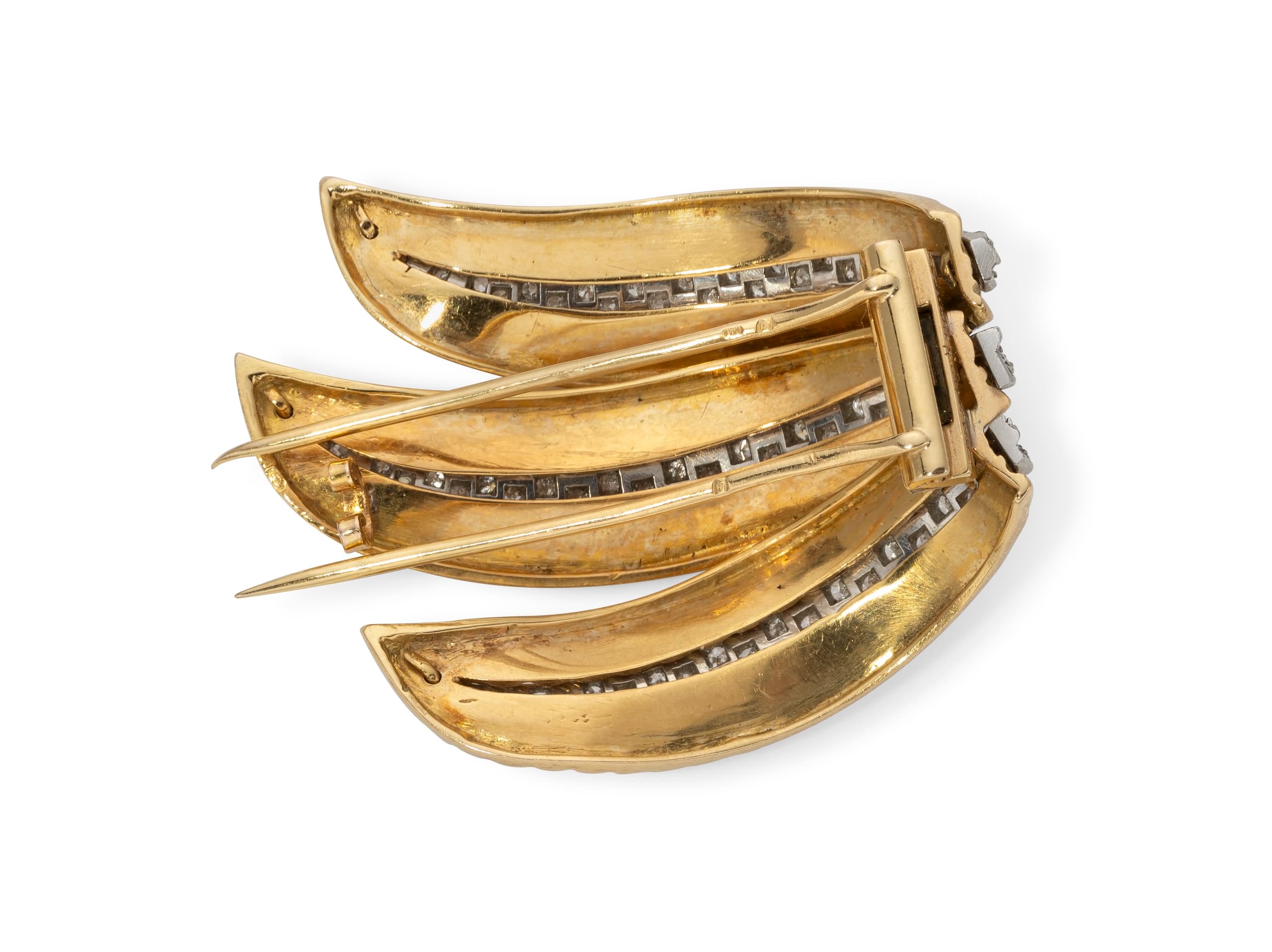 BOUCHERON ‘PALMETTE’ 18K YELLOW GOLD, PLATINUM AND DIAMOND RING AND BROOCH, 1950s - 1960s