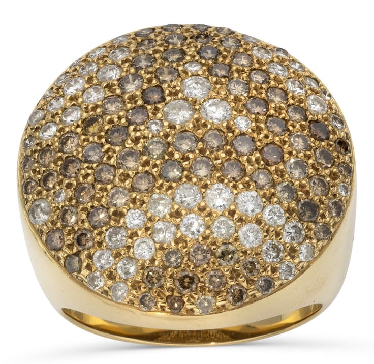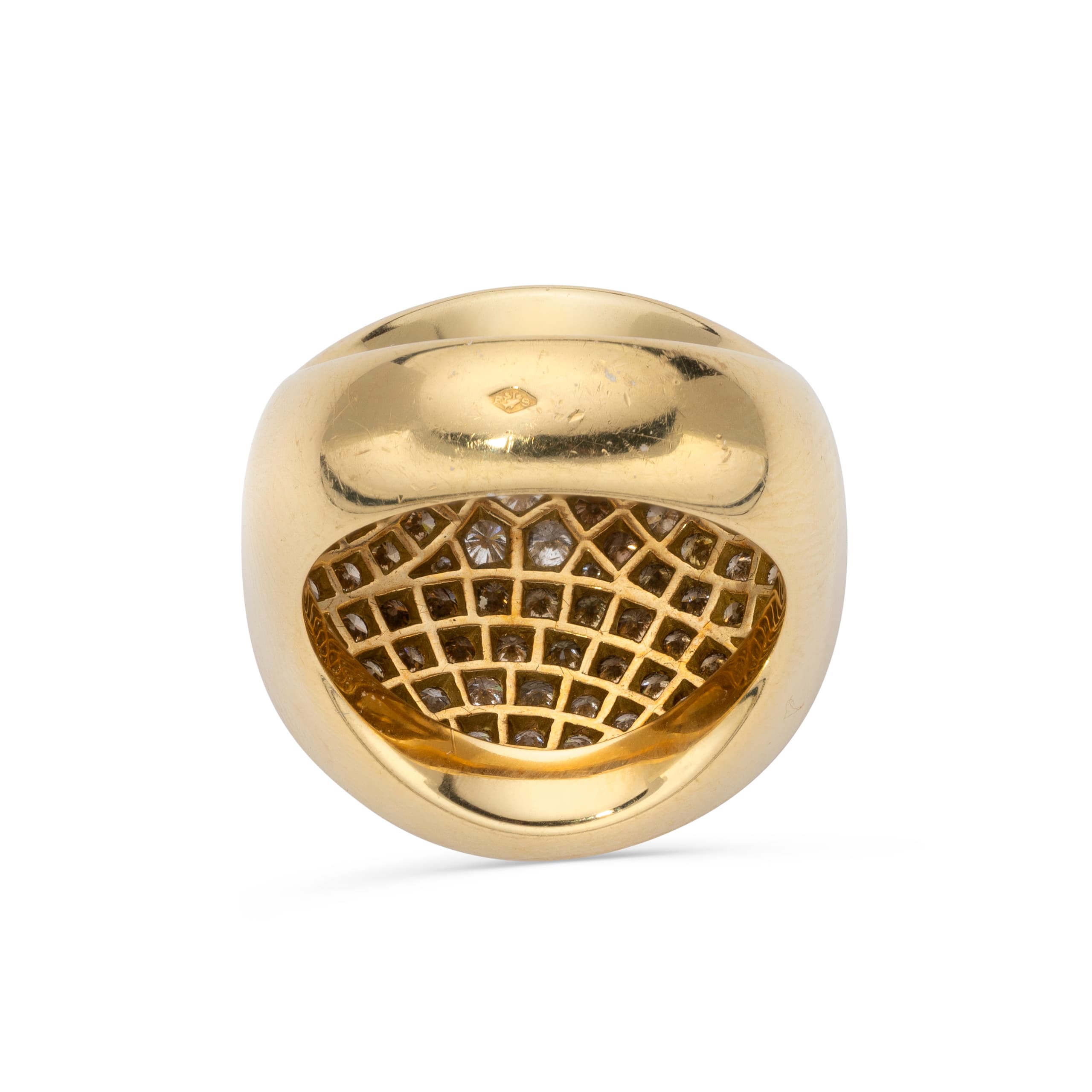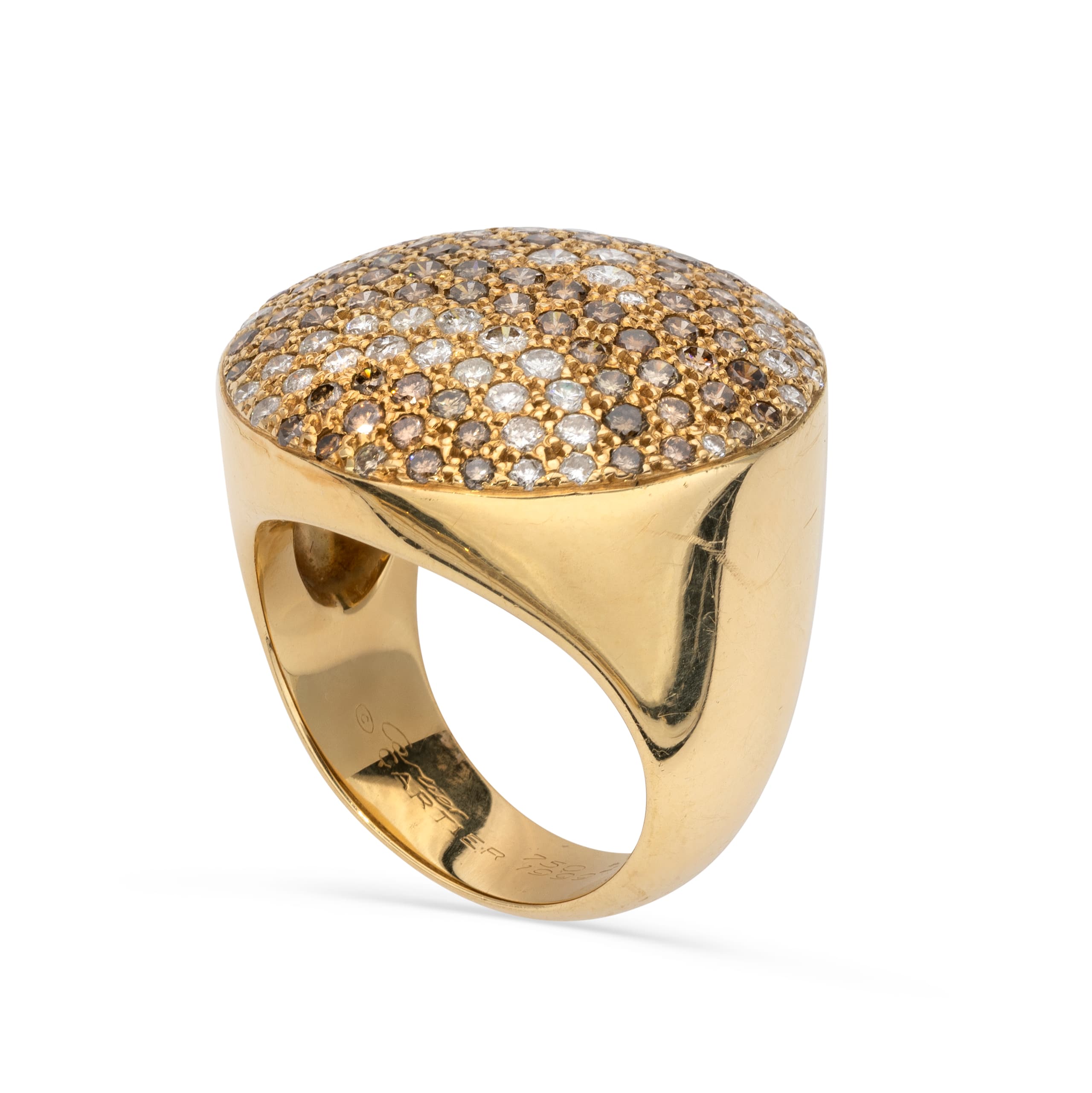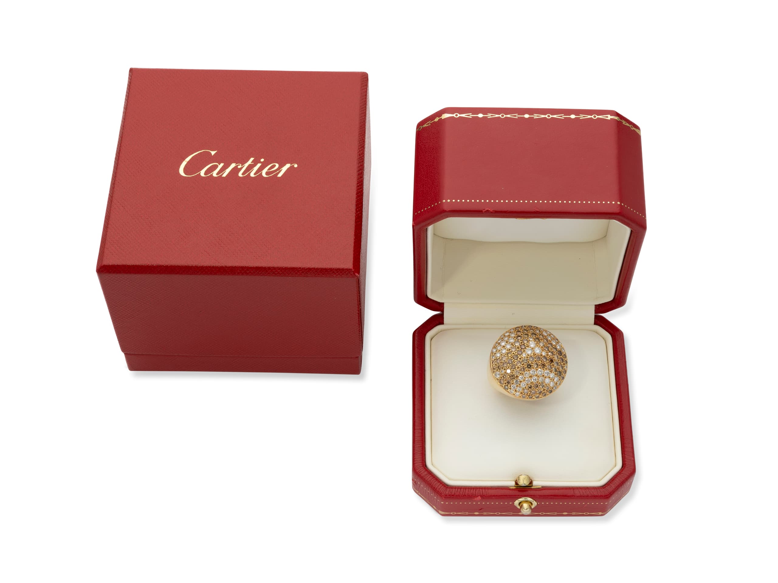 The raised dome set with 50 round diamonds and 75 diamonds of cognac colour weighing approximately 1.2 ct Hallmarks: 750, Cartier, 1999, numbered size: 54 D. 2.3 cm. gross weight 17 gr. with its original Cartier box