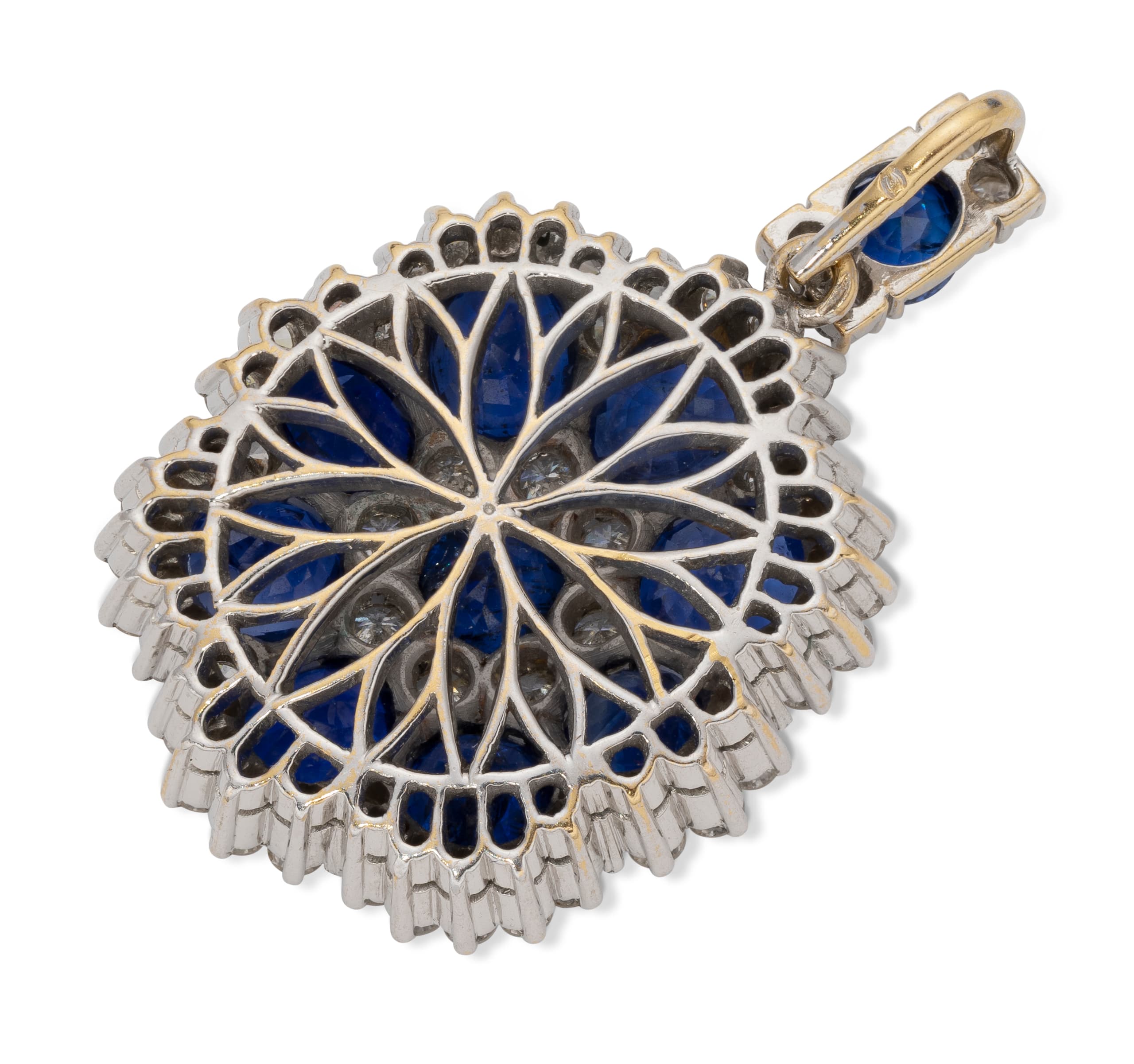 18k white gold flower-shaped pendant set with diamonds weighing approximately 1.20 ct. and natural sapphires weighing approximately 8 ct. Hallmarks: 'owl' H. 4 cm gross weight: 14.94 gr. with MONACO GEM LAB certificate