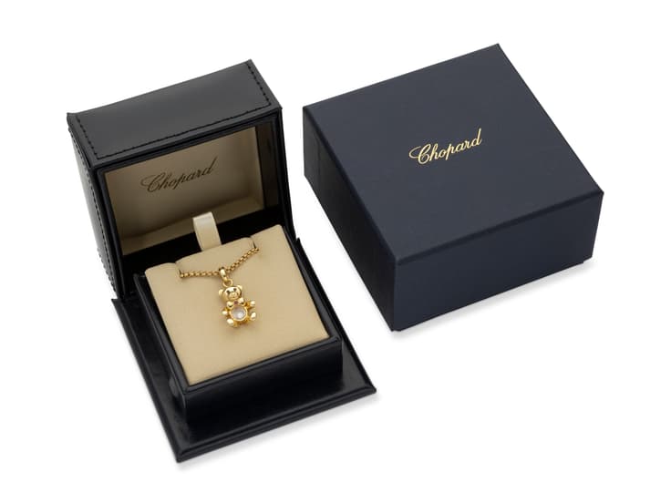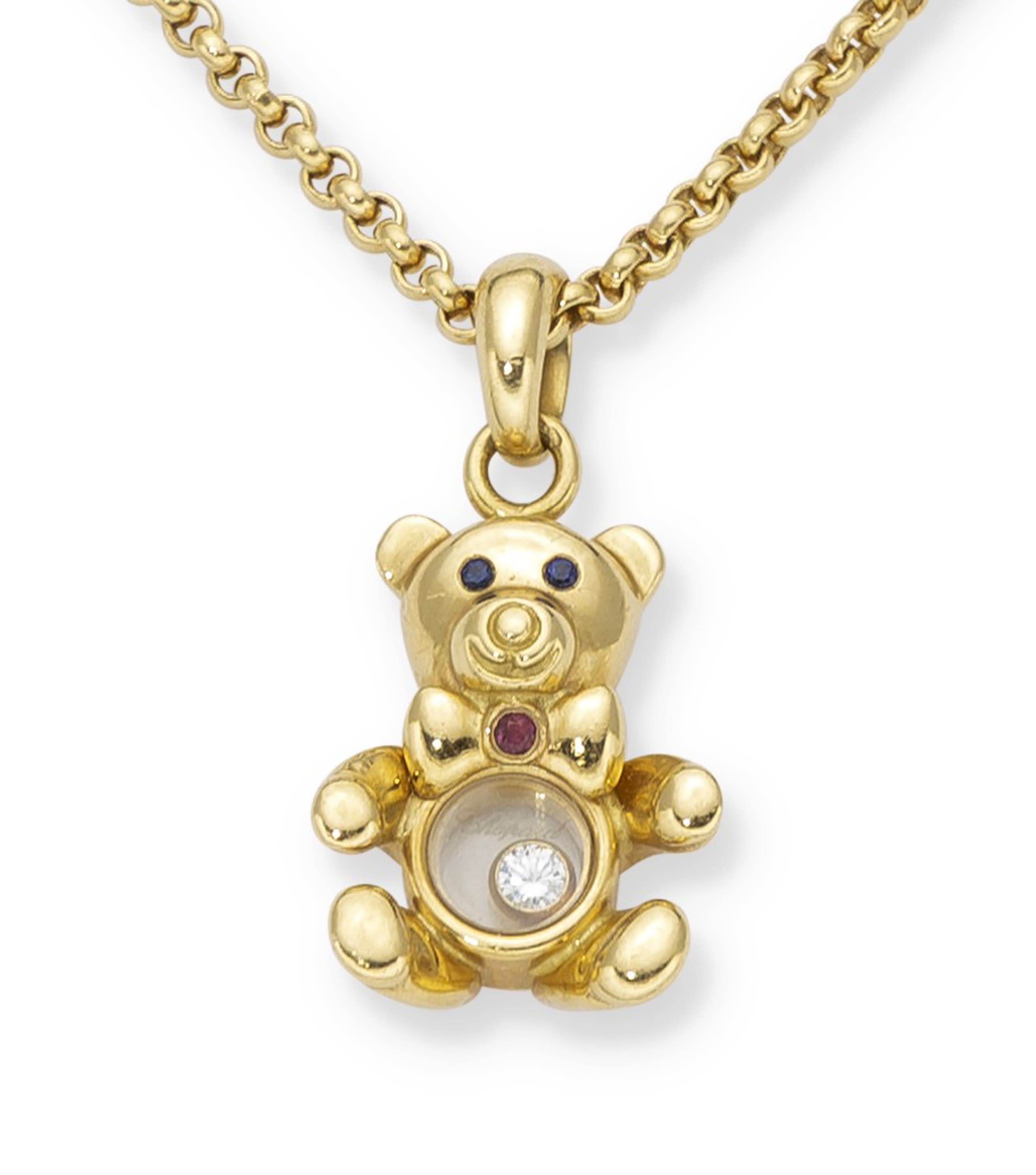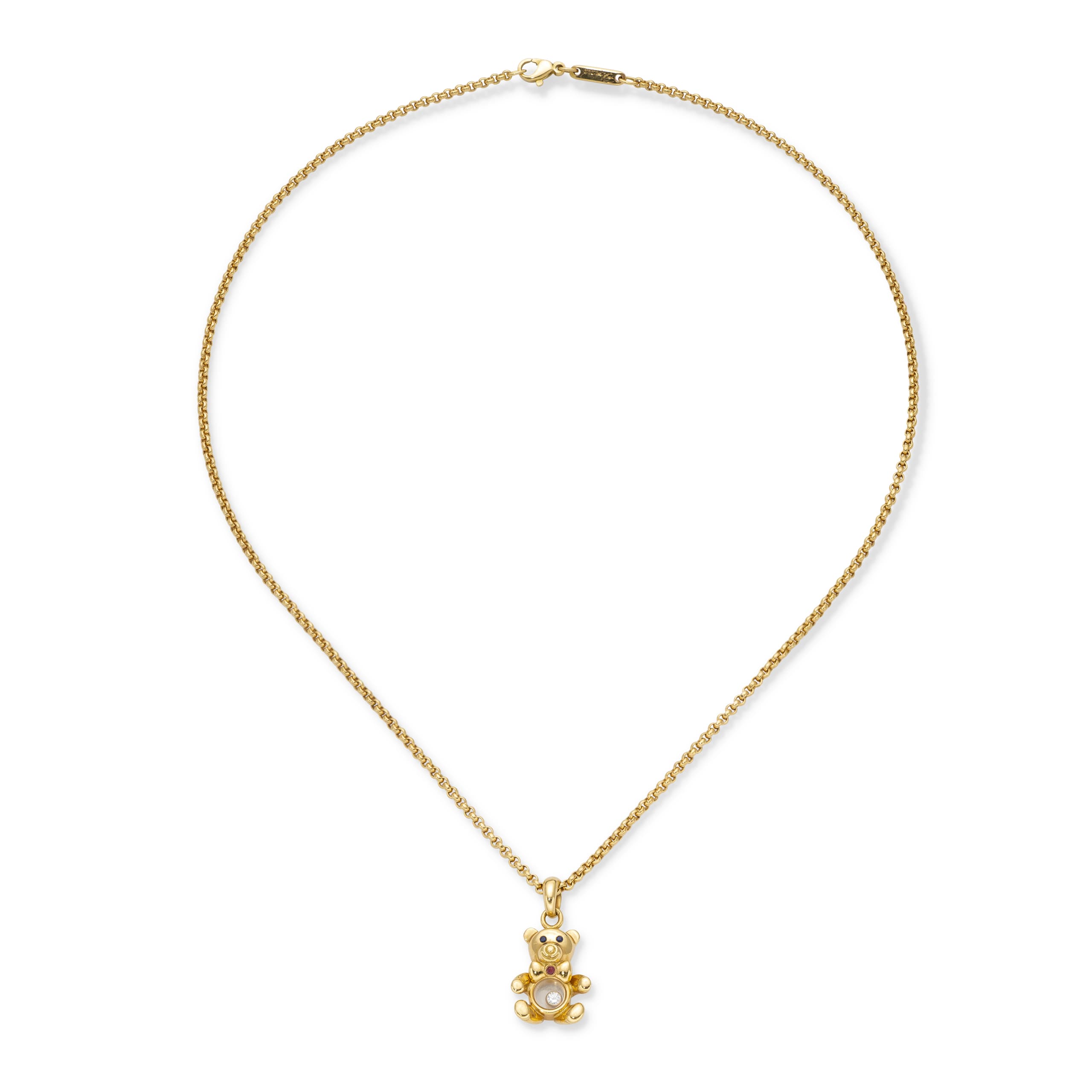 18k yellow gold chain with 'Happy Diamonds Teddy Bear' pendant set with two sapphires, ruby, and diamond Hallmarks: '750', signed 'Chopard' L. approximately 42 cm, pendant 2.42 cm total gross weight: 14.57 gr. with original box