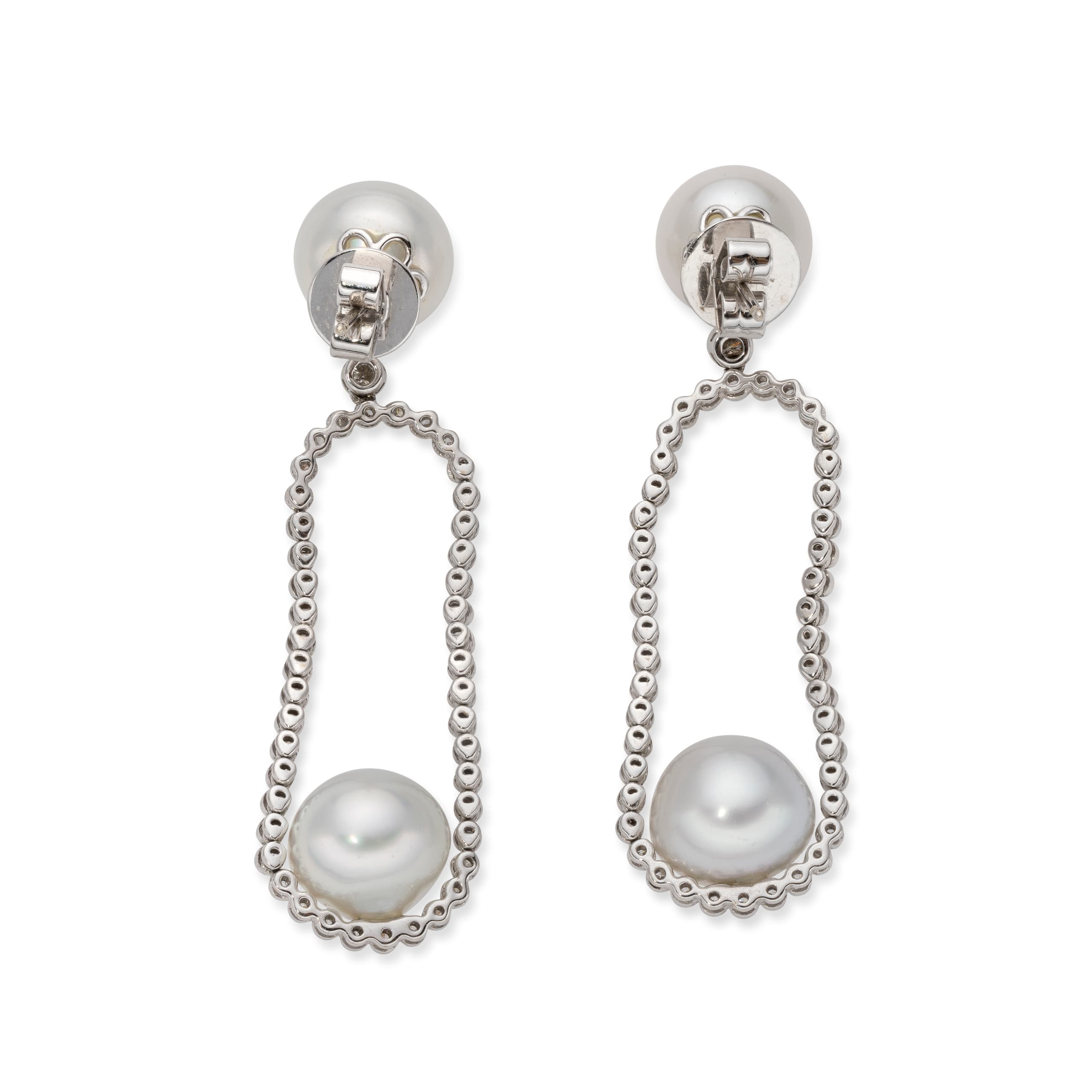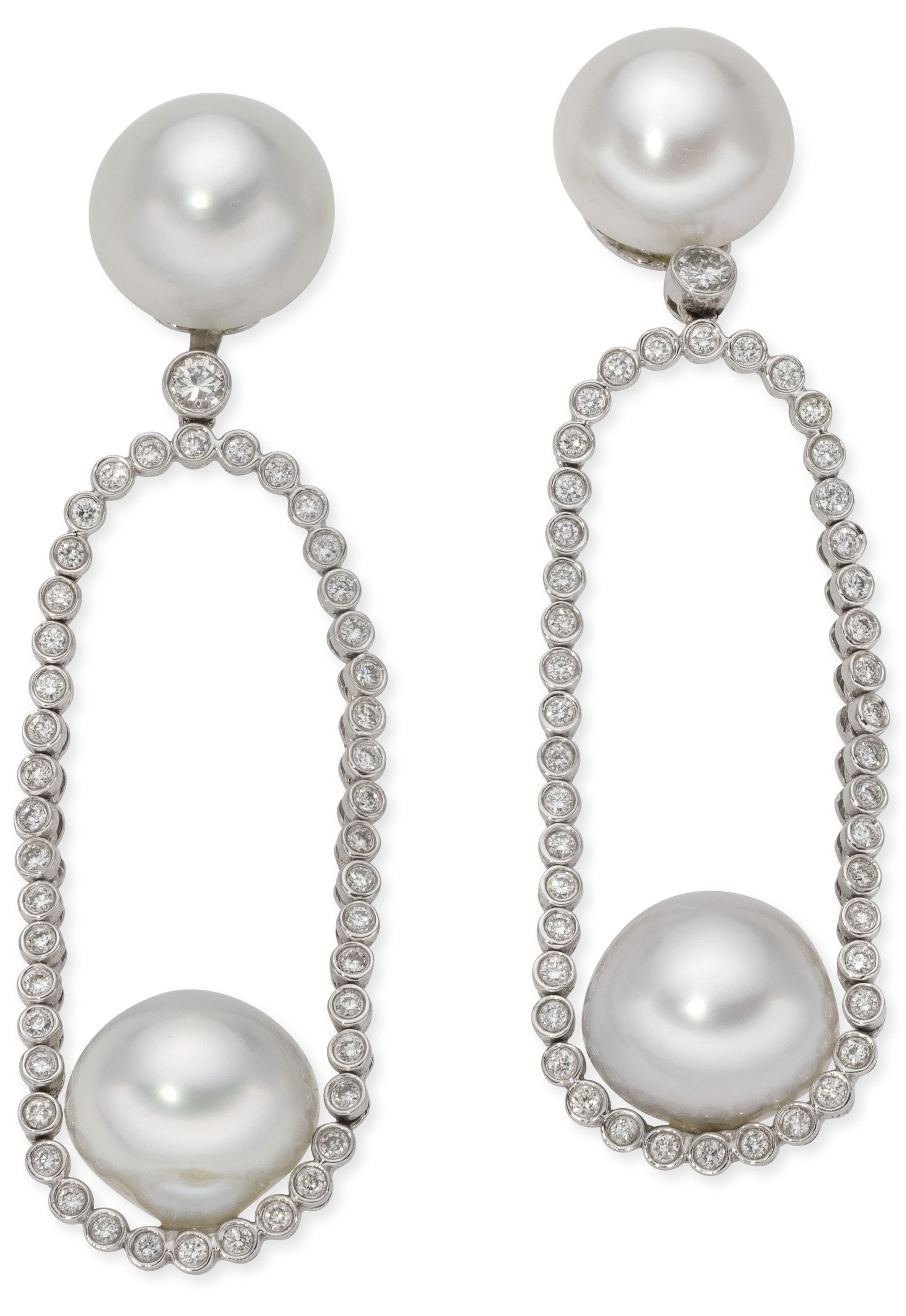 pair of 18k white gold earrings set with diamonds weighing approximately 0.75 ct. and four Akoya cultured pearls approximately 10 mm Hallmarks: ‘750’ L. circa 4.5 cm (each) total gross weight: 12.90 gr.
