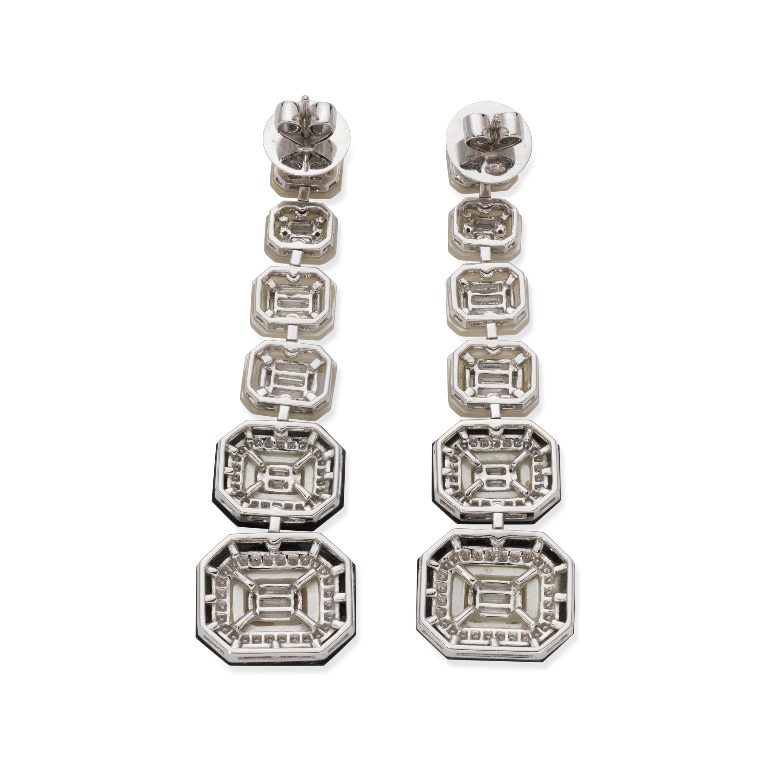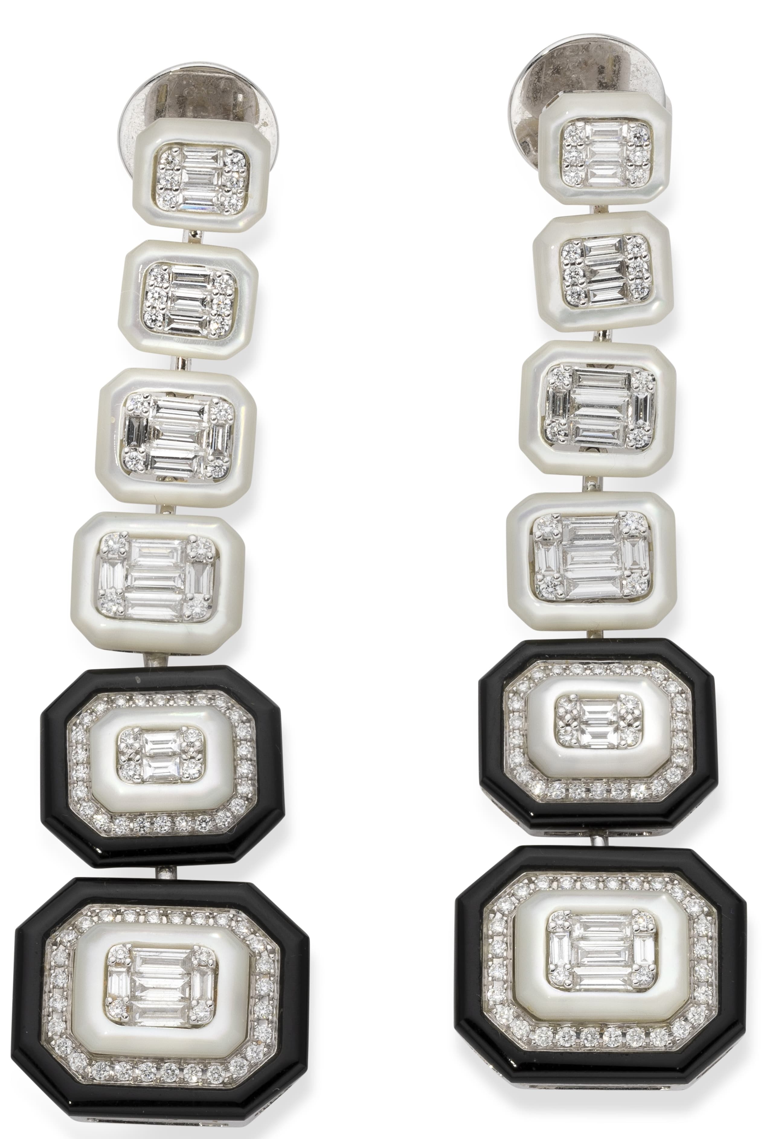 pair of 18k white gold pendant earrings set with baguette-cut diamonds weighing approximately 2.00 ct., round-cut diamonds weighing approximately 0.60 ct., black onyx and mother-of-pearl Hallmarks: ‘750’ L. 5.5 cm (each) total gross weight: 15.66 gr.