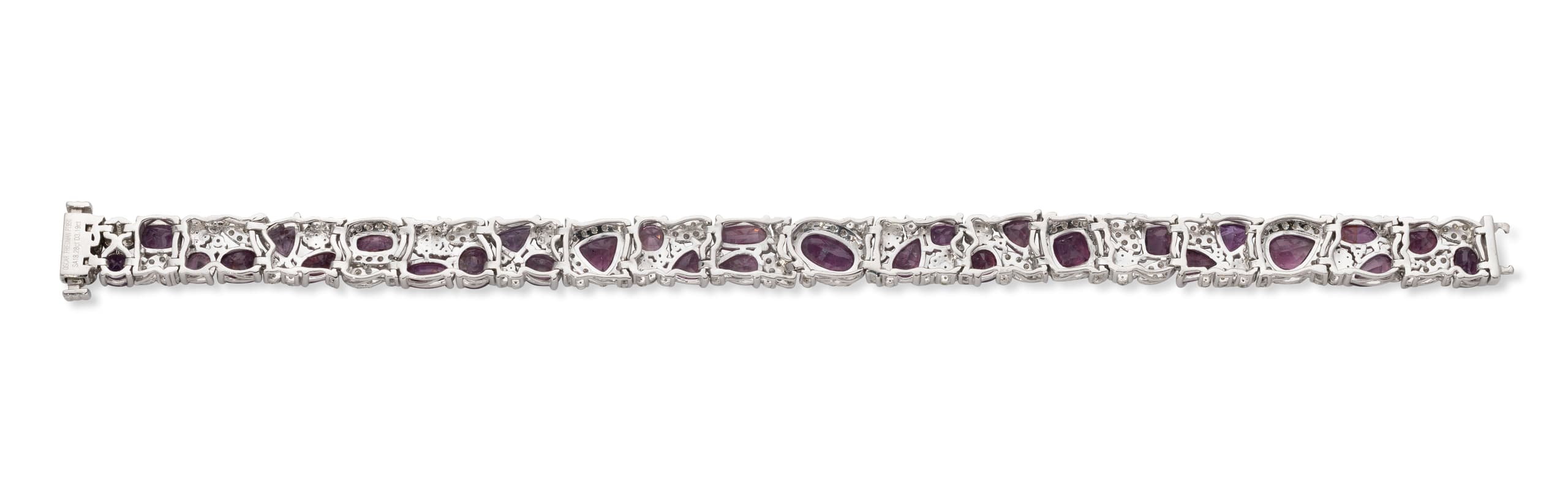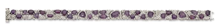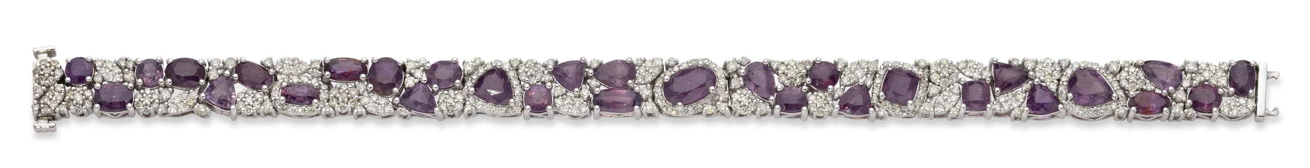 platinum bracelet by Oscar Friedman set with diamonds weighing in total approximately 3.19 ct. and purple-pink natural Kashmir sapphires weighing in total approximately 18.28 ct. Hallmarks: ‘PT950’, ‘SA18.28CT D3.19CT’, signed ‘Oscar Friedman’ L. 18 cm gross weight: 34.44 gr. with GIA report from 19 January 2024