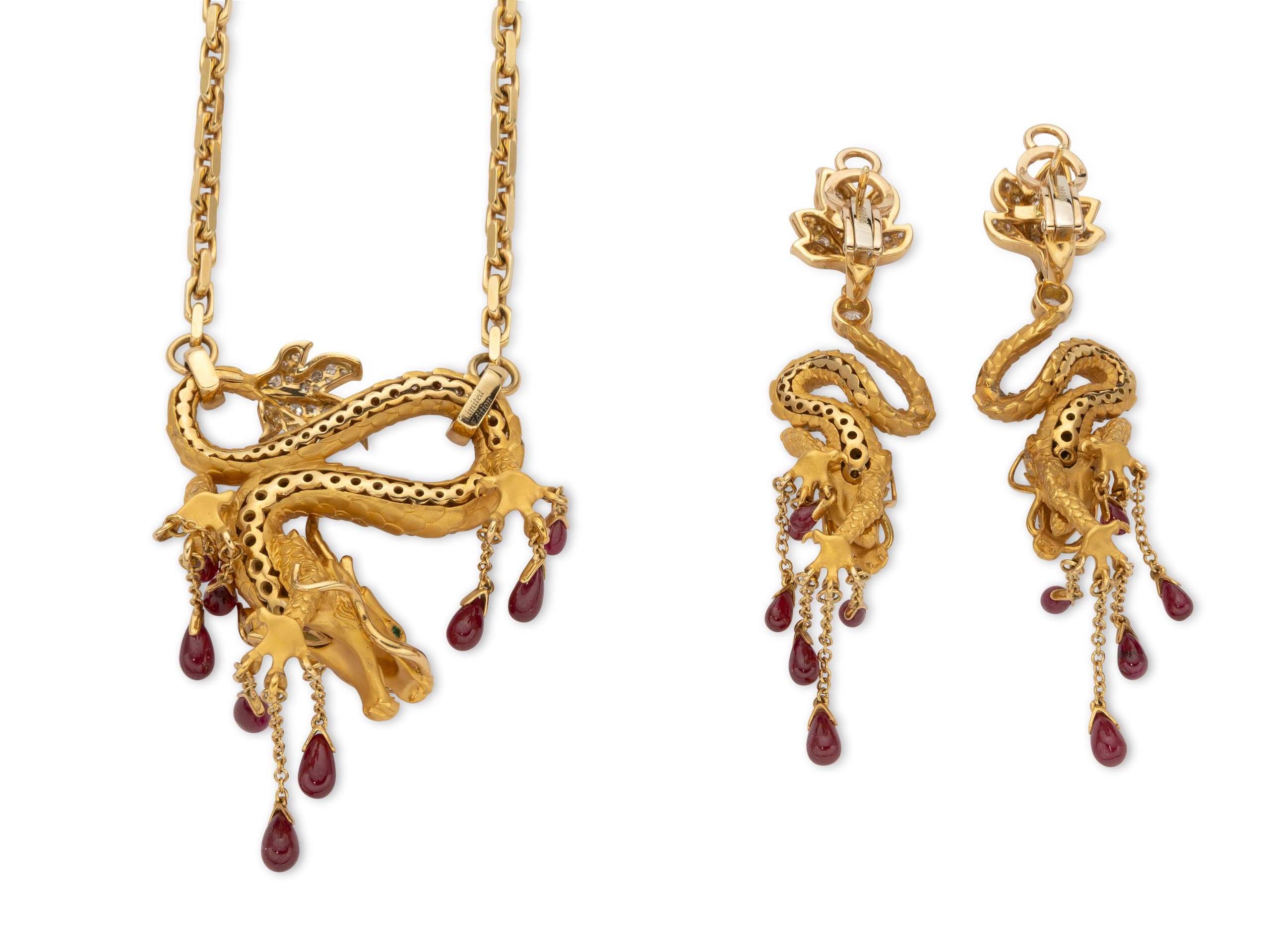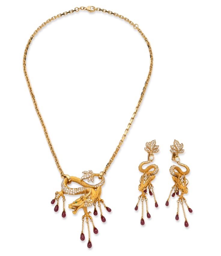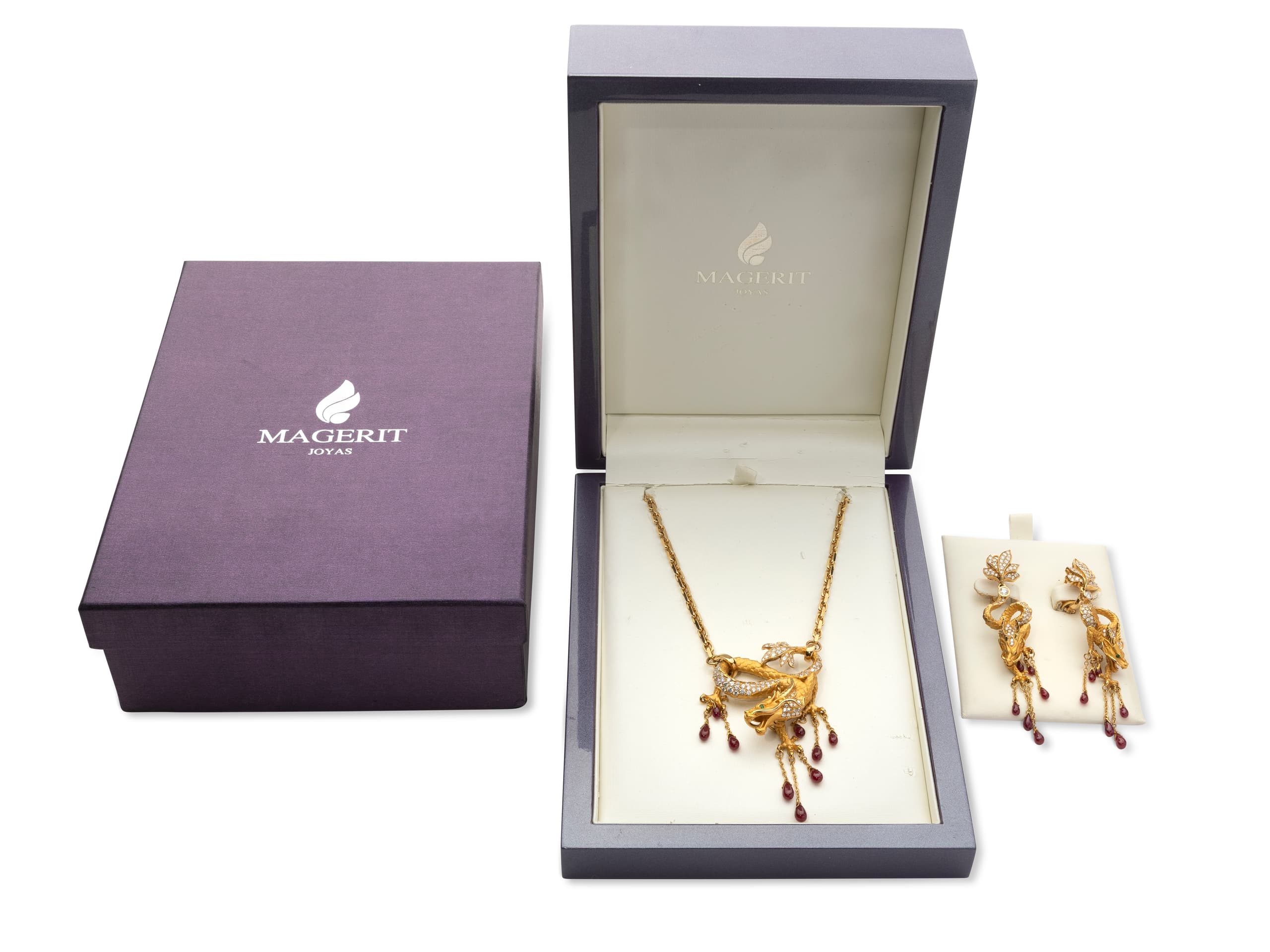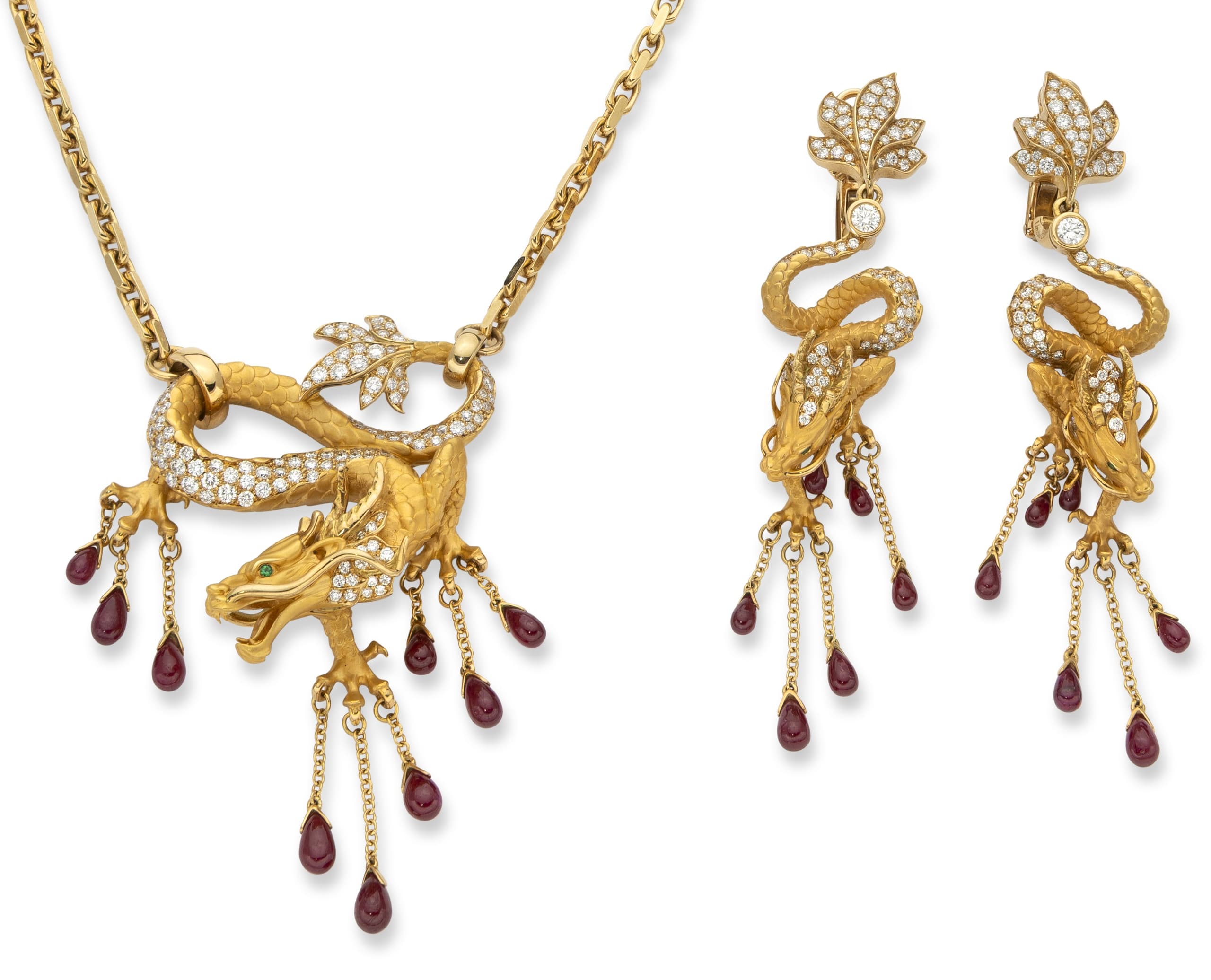 magnificent limited edition set designed by the Ukrainian Ekaterina Timofeeva and made by Spanish jeweller Magerit comprising 18k yellow gold necklace with dragon-shaped pendant and earrings set with diamonds weighing in total approximately 3.90 ct., drop-cut rubies weighing in total approximately 13.5 ct. and emerald eyes weighing in total approximately 0.09 ct.