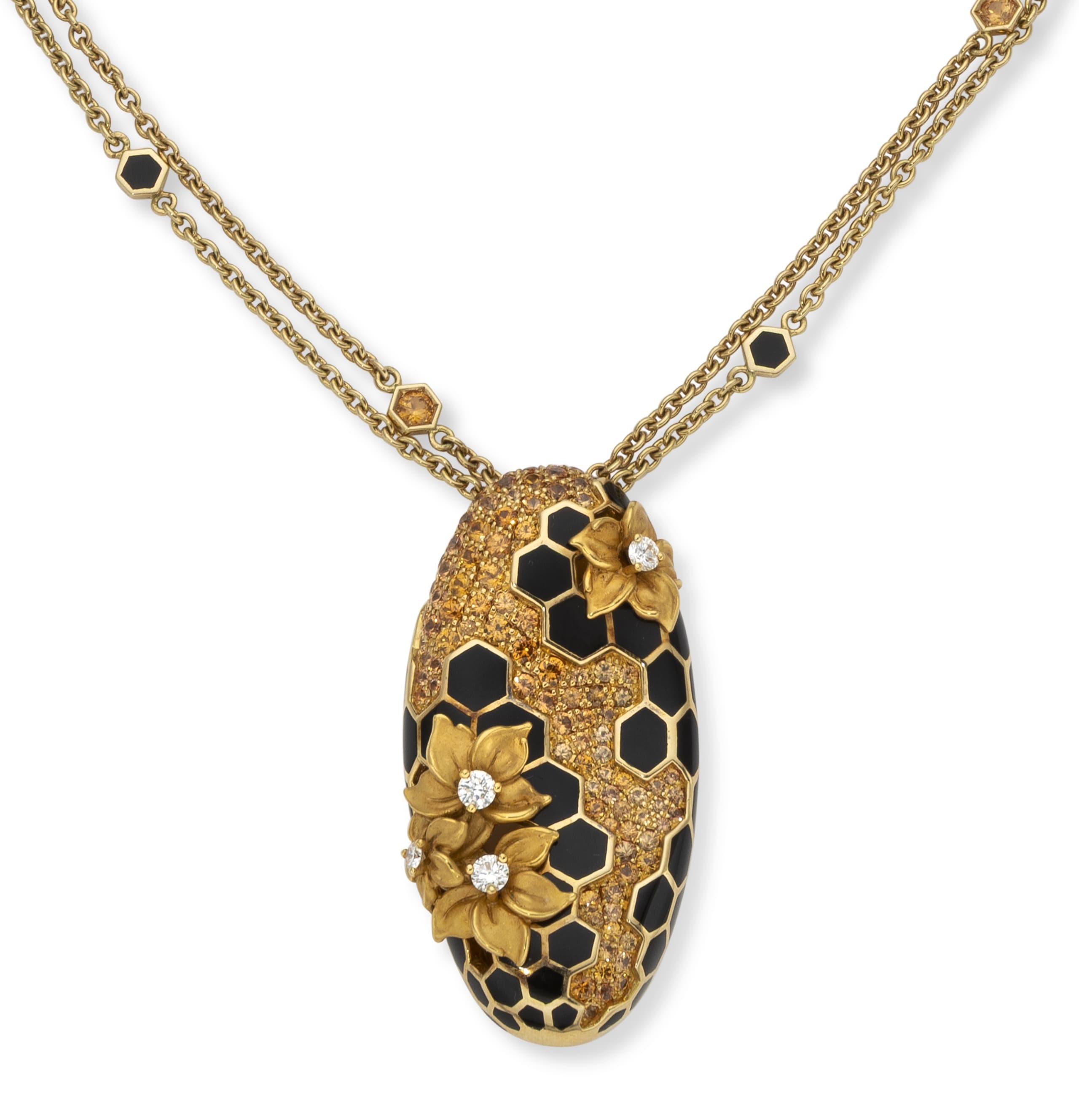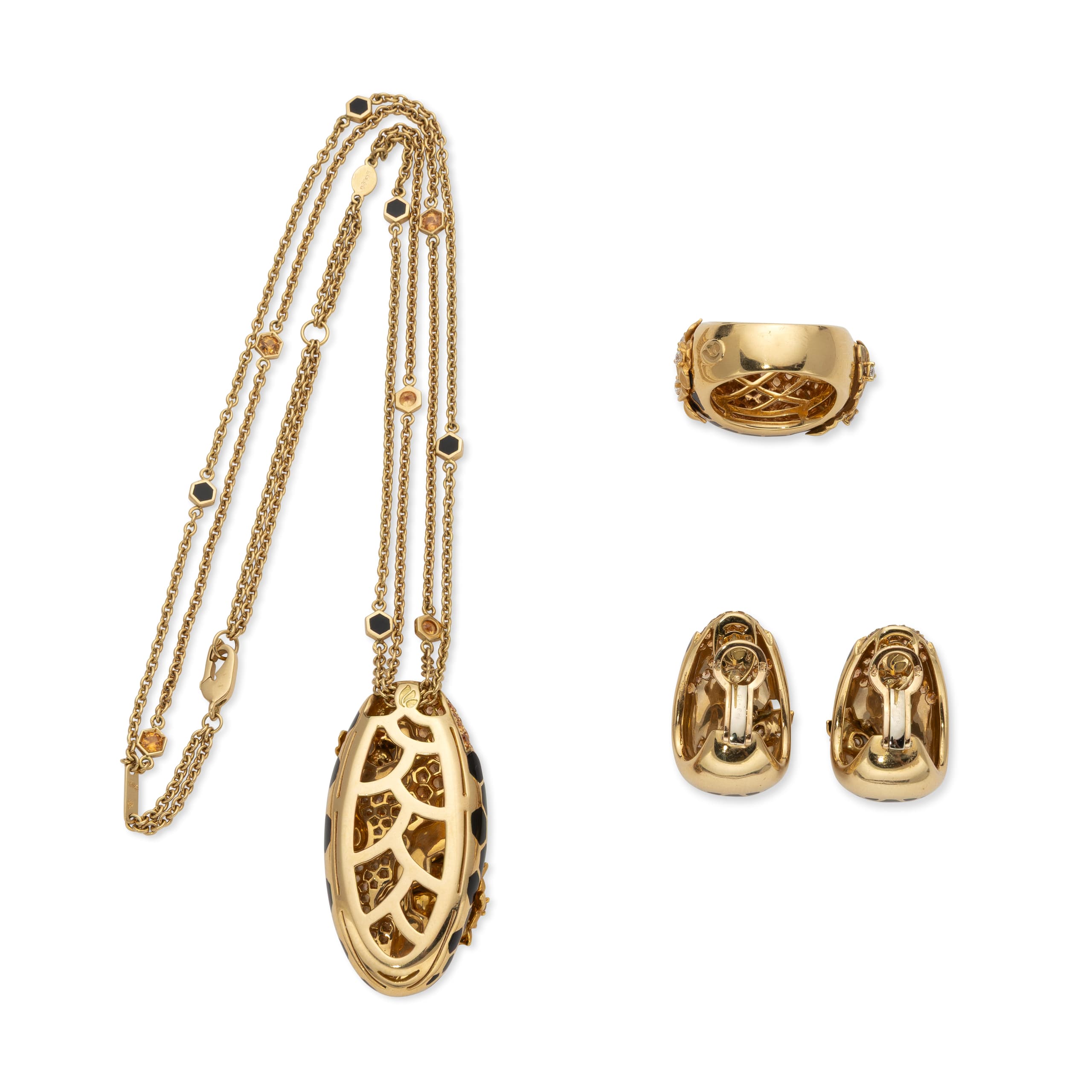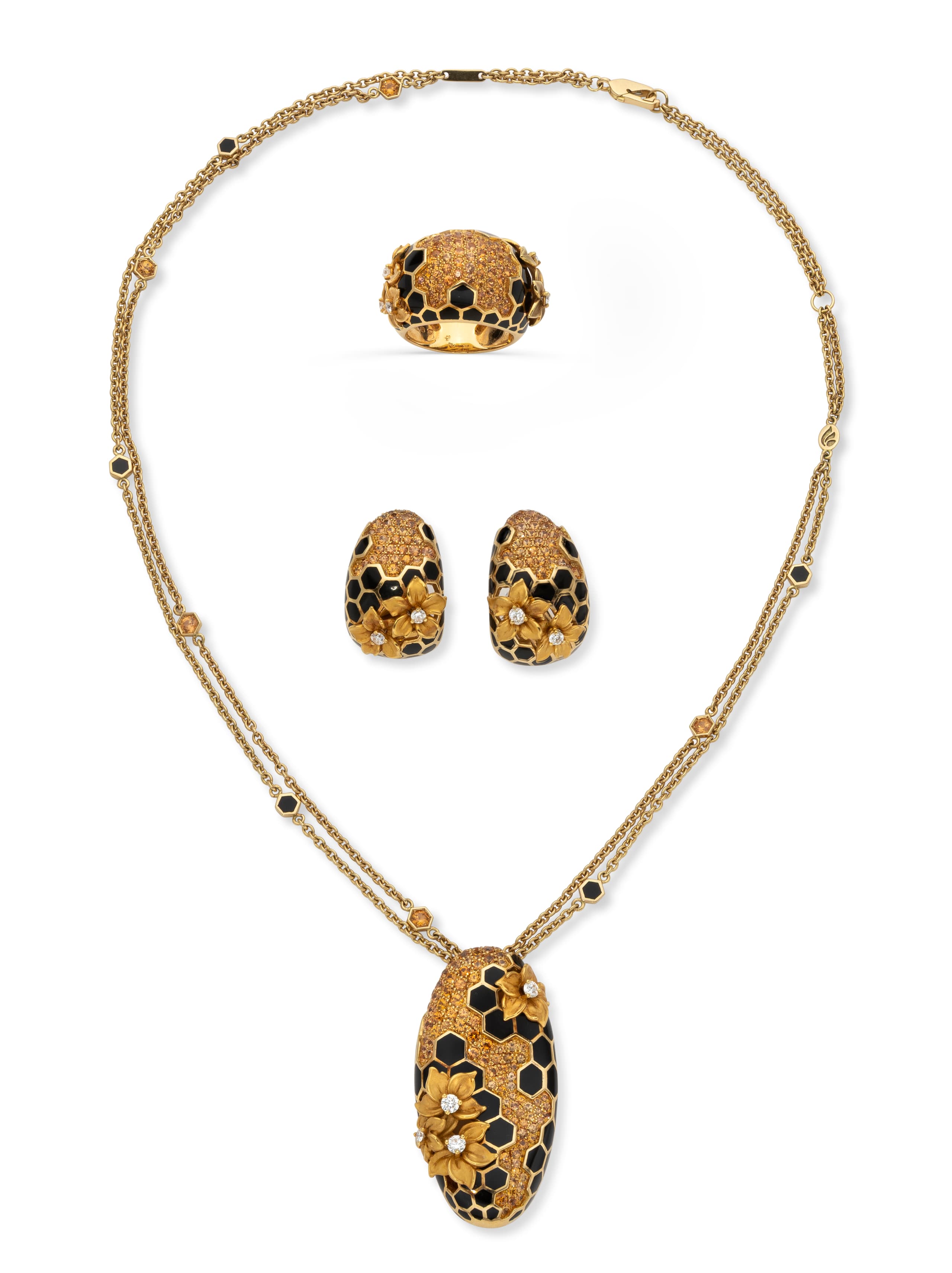 set comprising 18k yellow gold chain set with citrines and black onyx, pendant, earclips and ring decorated with honeycomb and finely chiseled flowers set with brilliant-cut diamonds weighing in total approximately 0.50 ct., citrines and black onyx