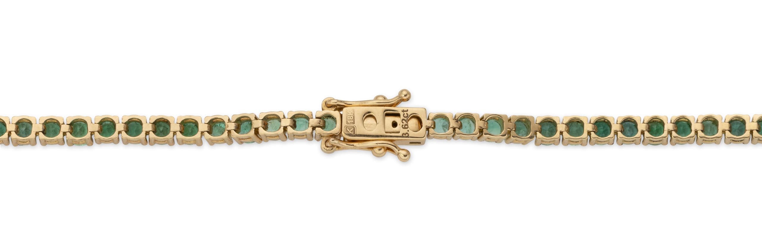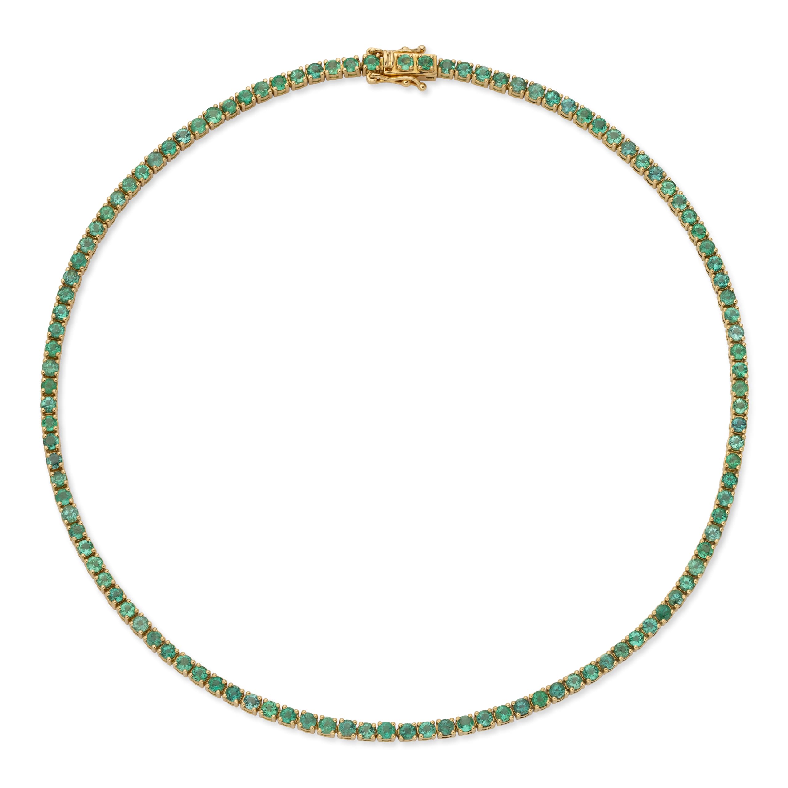 Tennis choker in 18k yellow gold set with round emeralds weighing approximately 3.62 ct Hallmarks: ‘18K’ ‘3.62 ct’ L. approximately 35 cm gross weight: approximately 16,56 gr.
