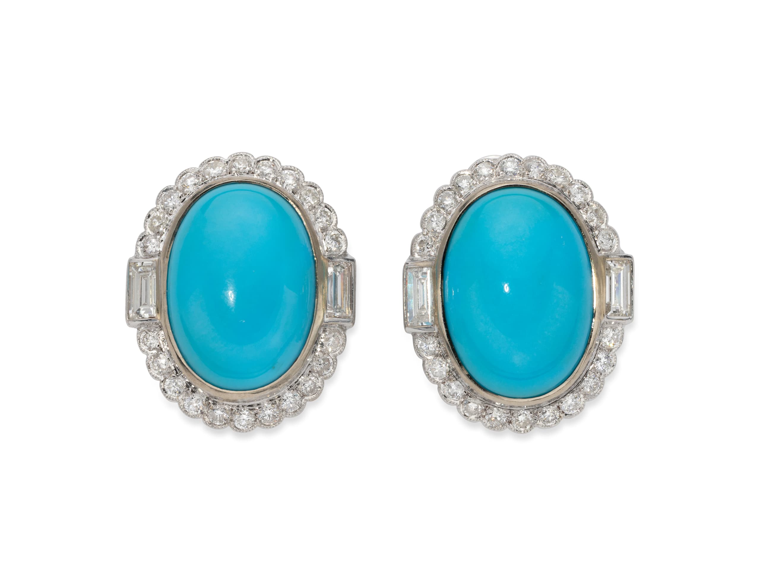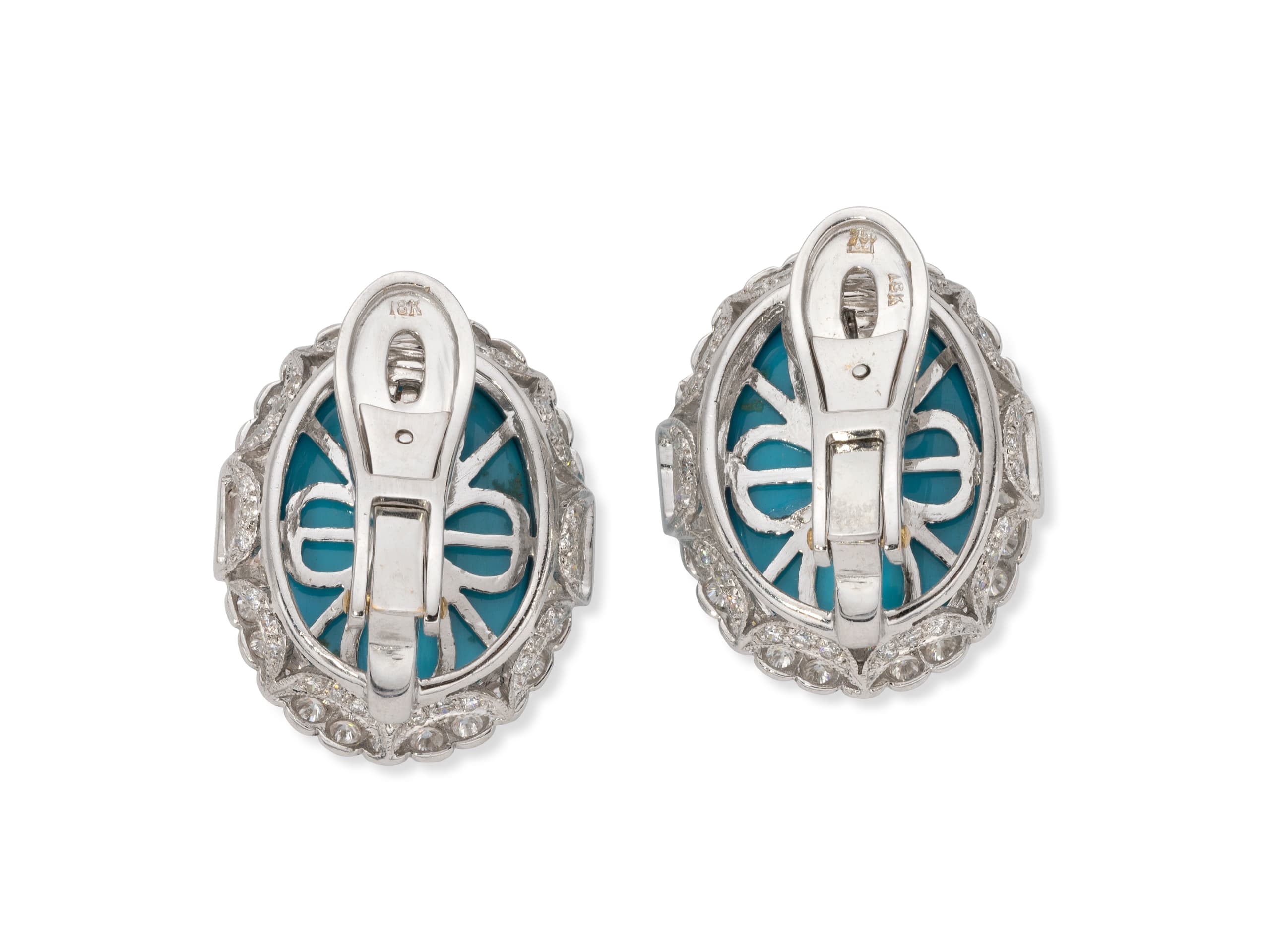 pair of 18k white gold earclips set with cabochon turquoise framed by brilliant-cut and baguette-cut diamonds weighing in total approximately 1.20 ct. Hallmarks: ‘750’, ‘18K’ gross weight : 20.32 gr.