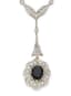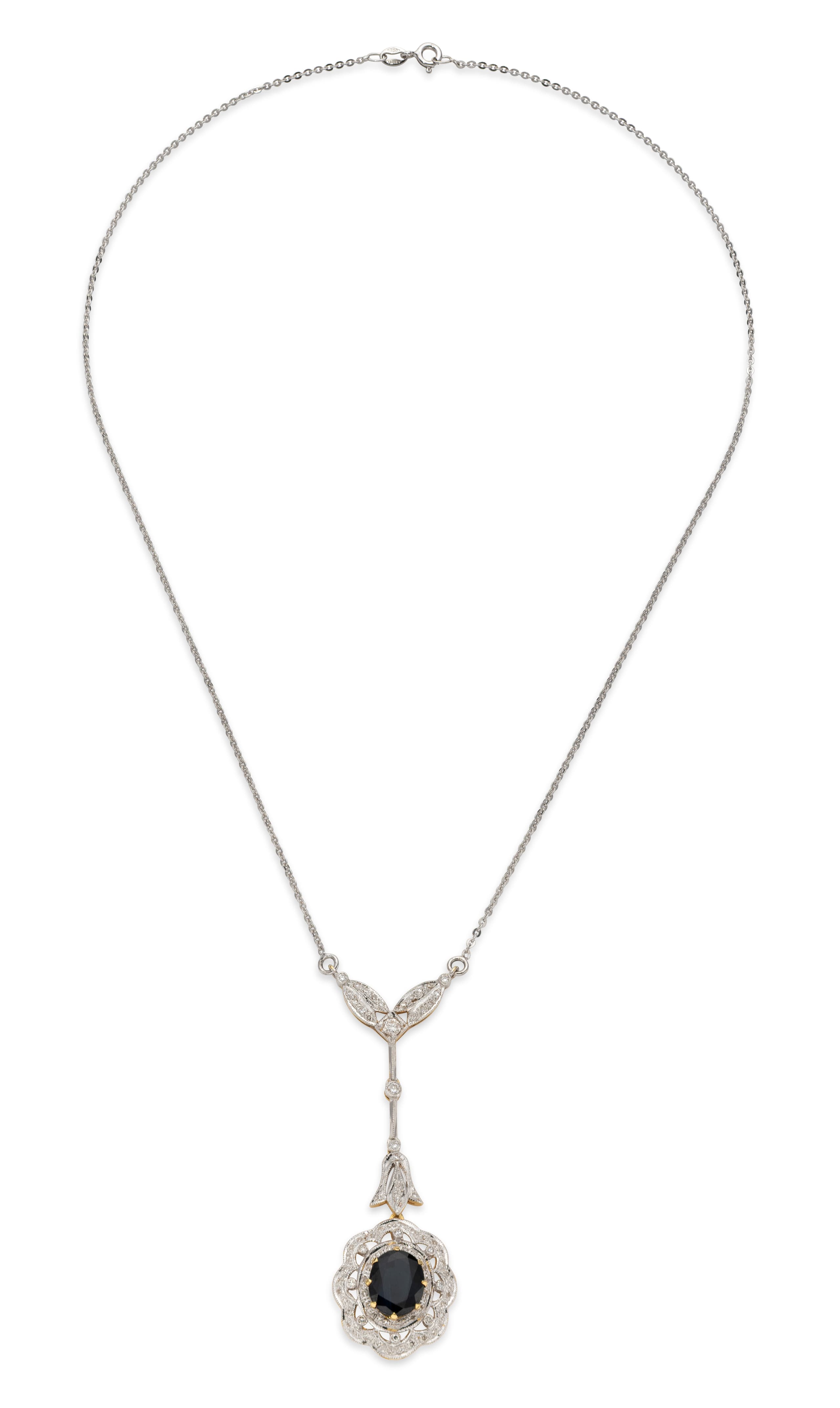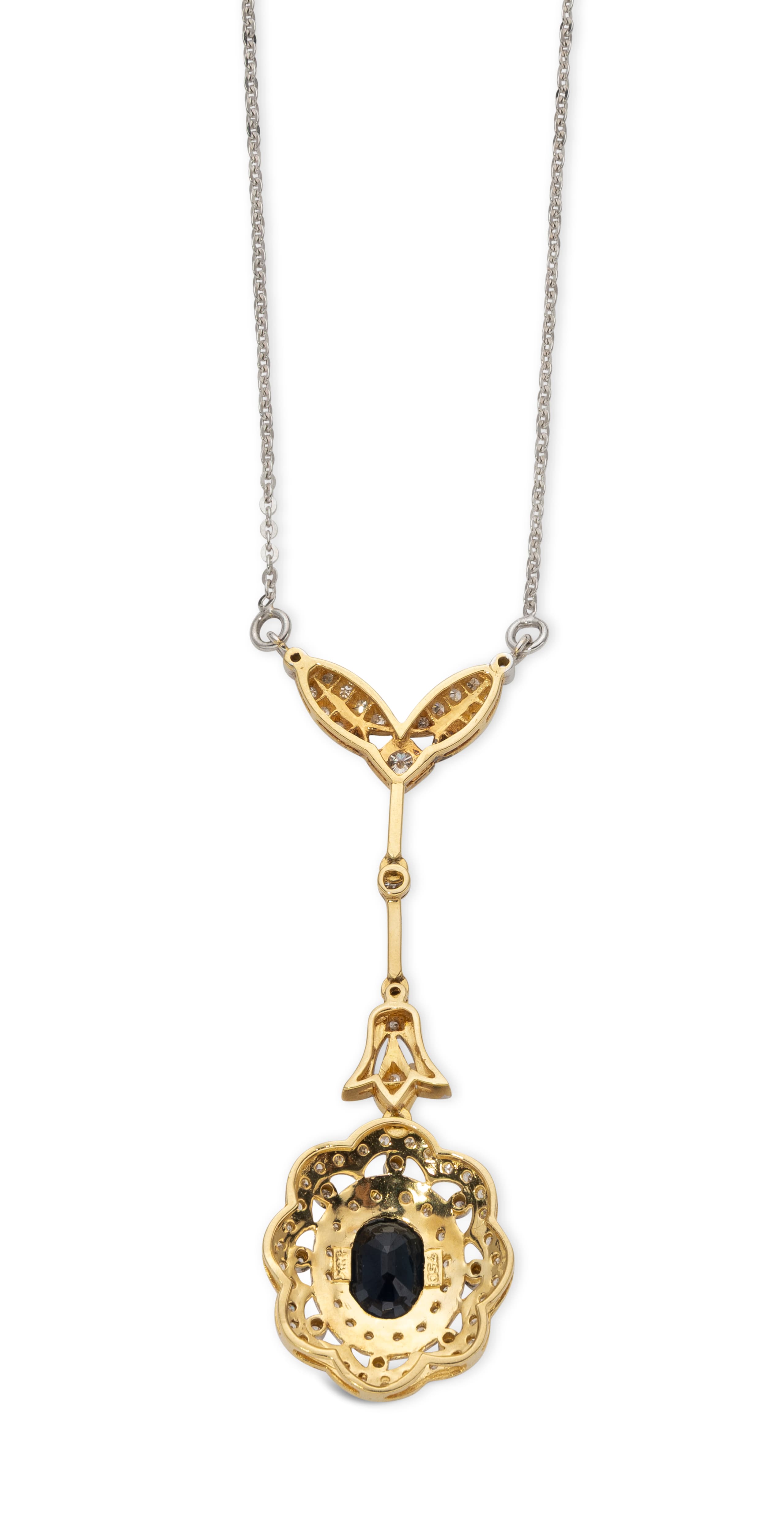 18k white gold chain with 18k white and yellow gold pendant set with sapphire weighing approximately 2.00 ct. framed by brilliant-cut diamonds weighing in total approximately 0.60 ct. Hallmarks: ‘750’, ‘18K’ L. 47 cm gross weight: 9.77 gr.