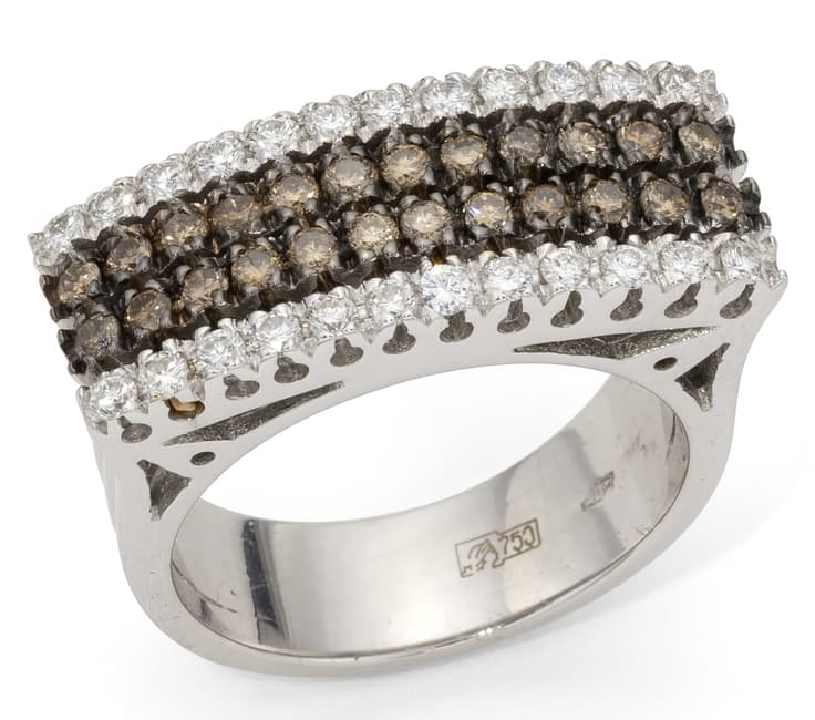 18k white gold ring set with 24 cognac diamonds weighing approximately 0.62 ct. and 24 white diamonds weighing approximately 0.48 ct.